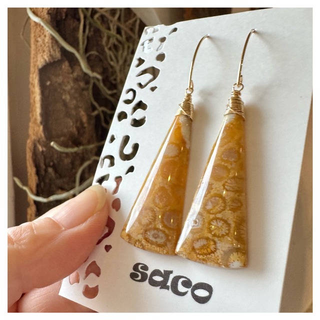 珊瑚の化石化した石であるフォッシルコーラルを シンプルに仕上げました フォッシルコーラルは、珊瑚の化石化したものです 古来より魔除けやお守りとして重宝されてきたそうです 菊の花びらのようなもの、鳳凰の羽の様なものなど、様々な模様や色の物があります こちらのペアは黄色みが強めのキャメル系でちょっと珍しいハニカム柄の様なタイプです ワイヤーフレーミングして、デザインのあるフックに合わせた存在感のある大人カジュアルな印象です <素材> All14kgf 天然石 フォッシルコーラル <サイズ> 全長(ピアス金具を含む) 約5cm 石サイズ 縦2.1×横1.7cm *イヤリングに金具交換可能です 石だけをイヤリング金具にお付けする場合は全長が短くなります パーツを挟んで長さを出すことも可能ですので、 ご要望がございましたらお申し付けくださいませ ご希望の方は、備考欄にご記入ください *ギフト用の簡単なラッピングも致します ご希望の方は備考欄にご記入ください 尚、ギフトボックスをご希望の方は、配送方法はレターパックプラスとなります ご希望の方は商品の「ギフトボックス&送料」を一緒にカートへお入れください ボックスなしの巾着のラッピングは、無料のレターパックライトで発送できます *配送方法は、レターパックライトを予定しております ポスト投函になります 複数ご購入の場合や高額商品の場合など、 こちらの判断で配送方法を変更させて頂く場合もございます