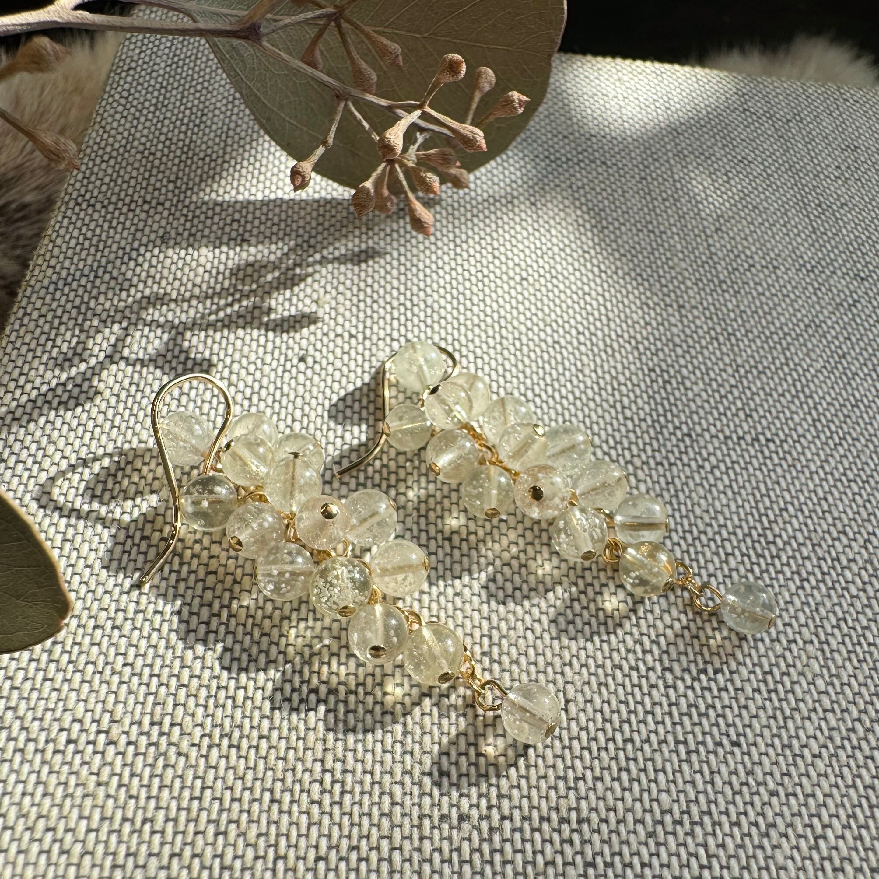 こちらのピアスは、透明感のある小さな丸玉のリビアングラスを流れる様におまとめしました