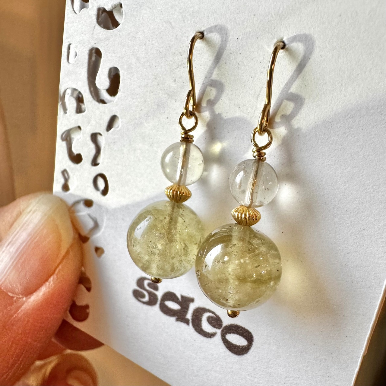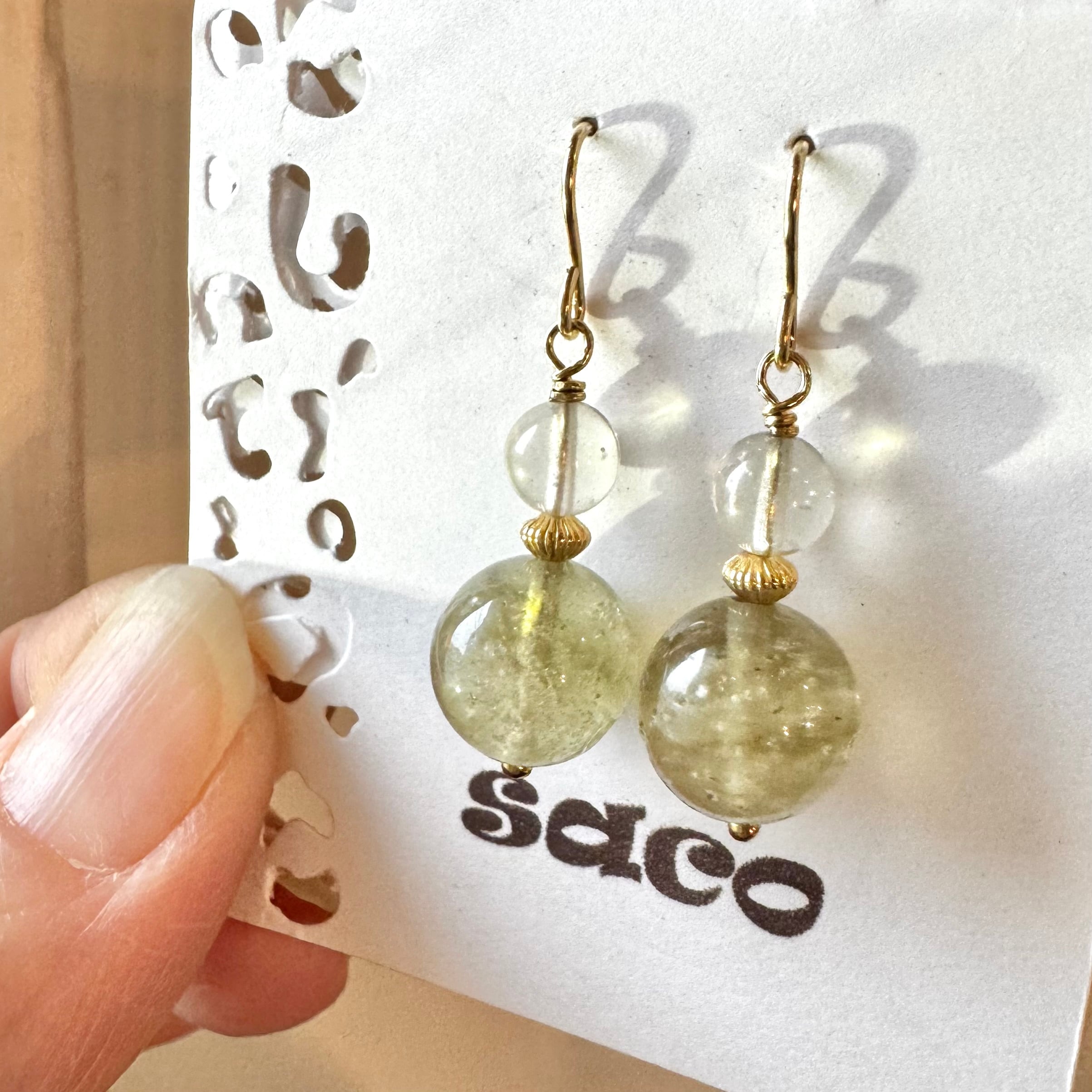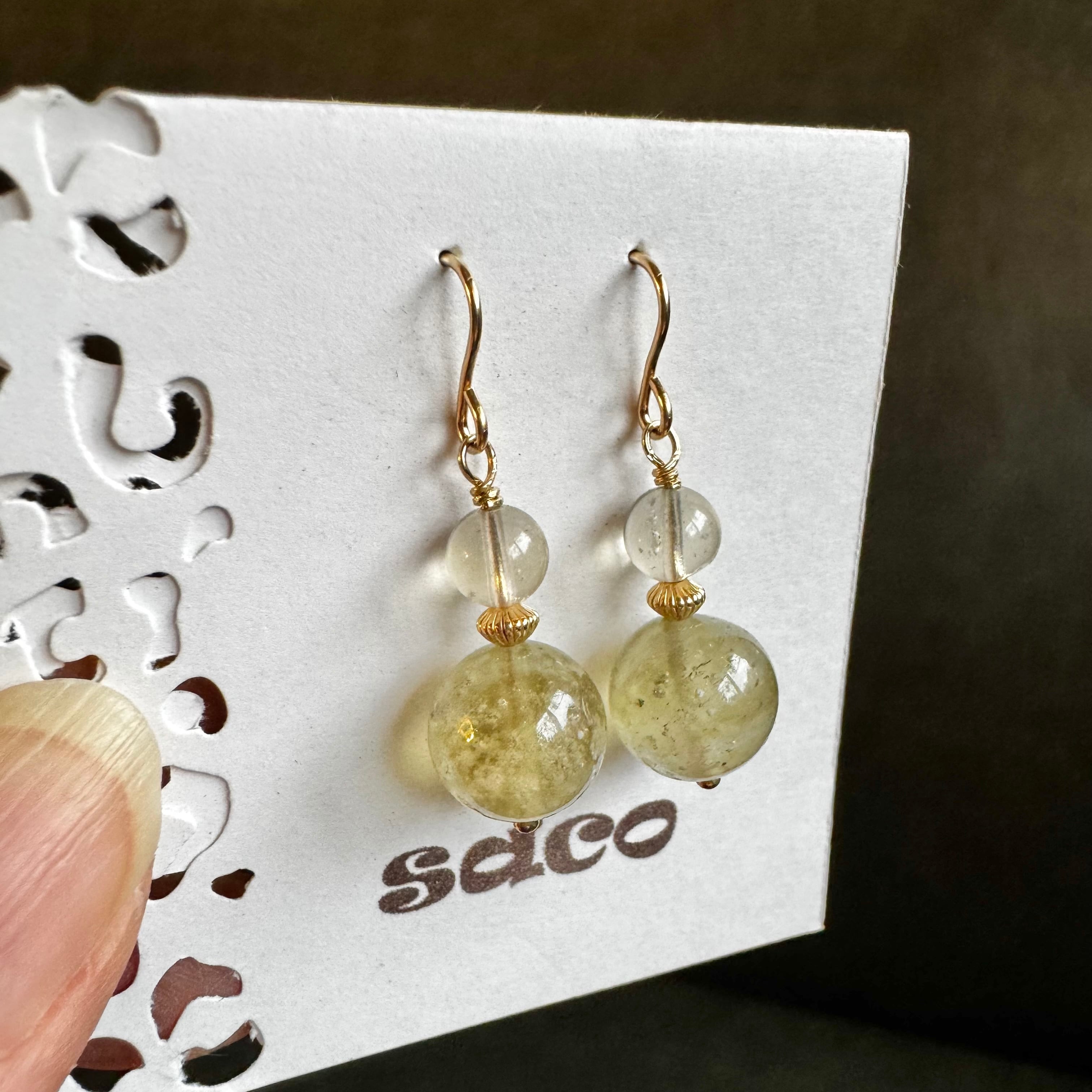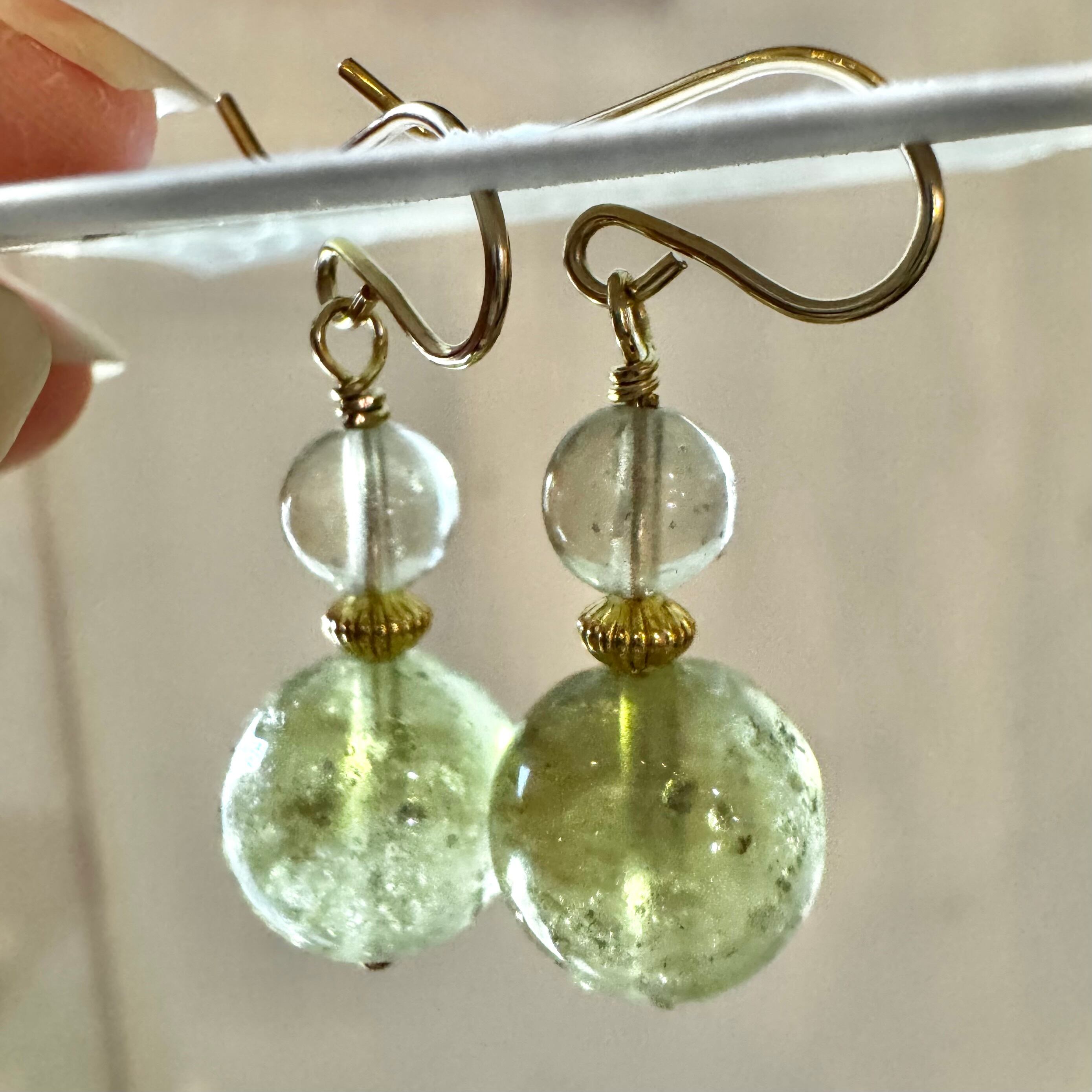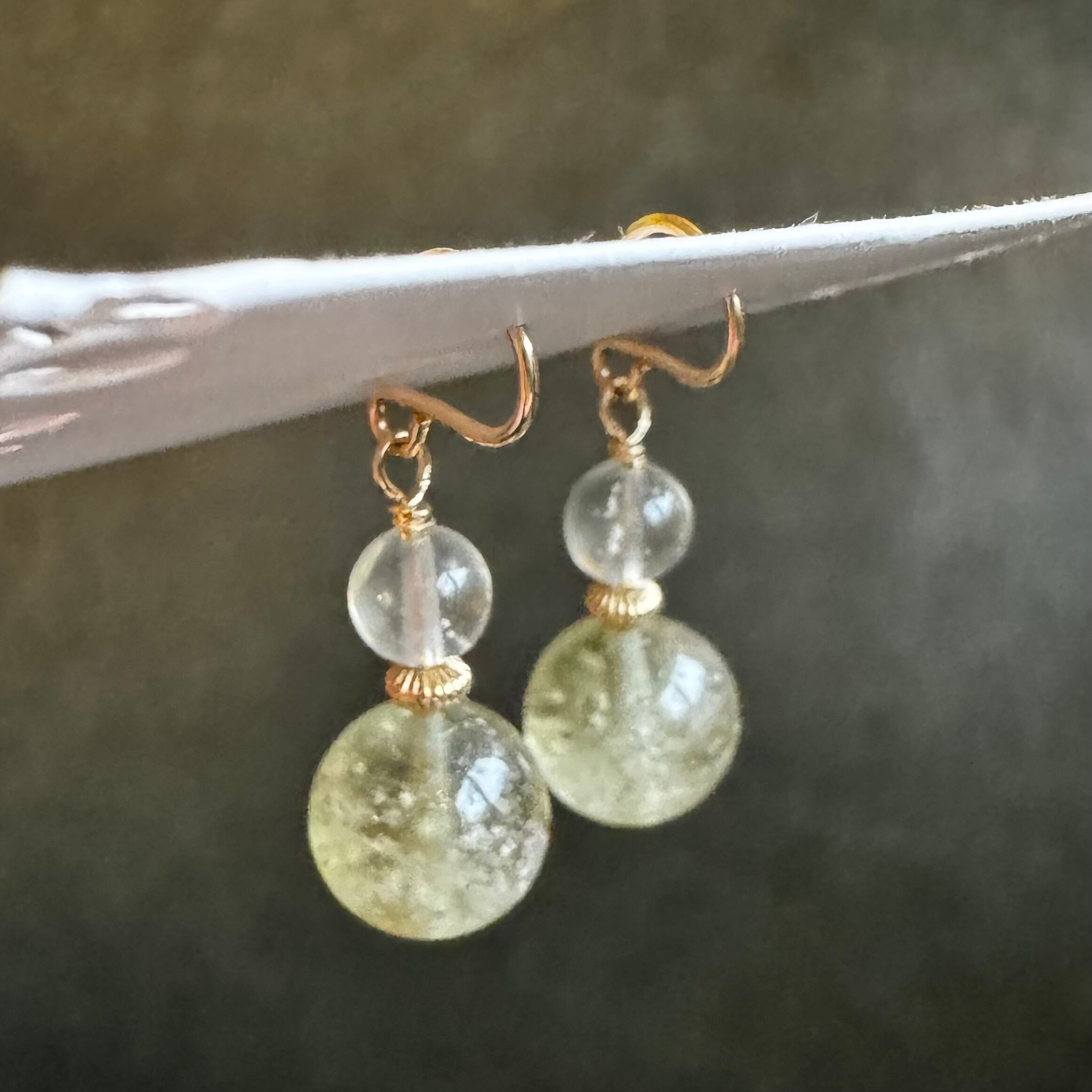 こちらは定番の丸玉を使用していますが、透明で少し鉱物クリストバライトが入った小さな粒とブラックの2種類を大小で合わせたピアスです