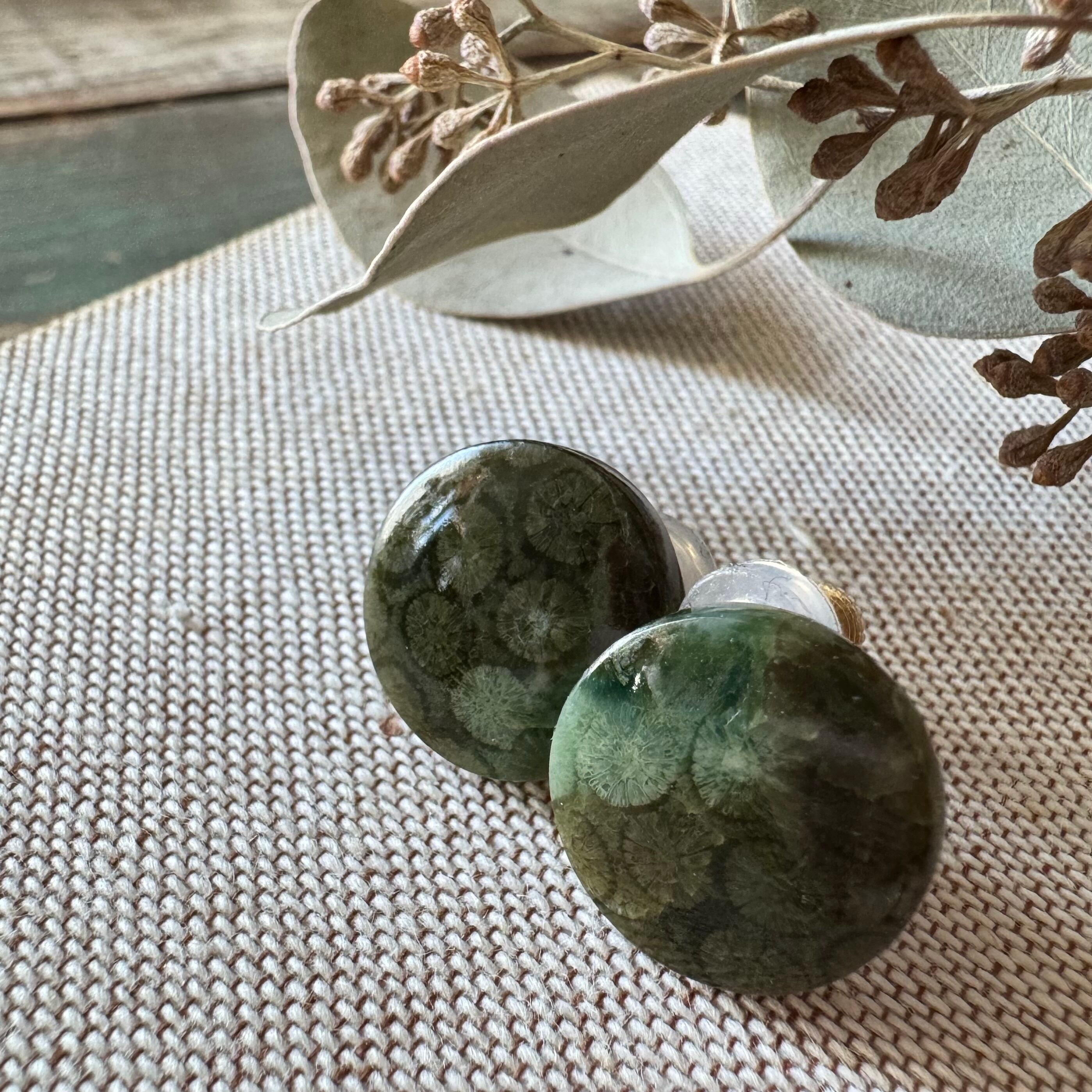 フォッシルコーラル*1粒イヤリング・渋めダークグリーン系(ピアス不可)