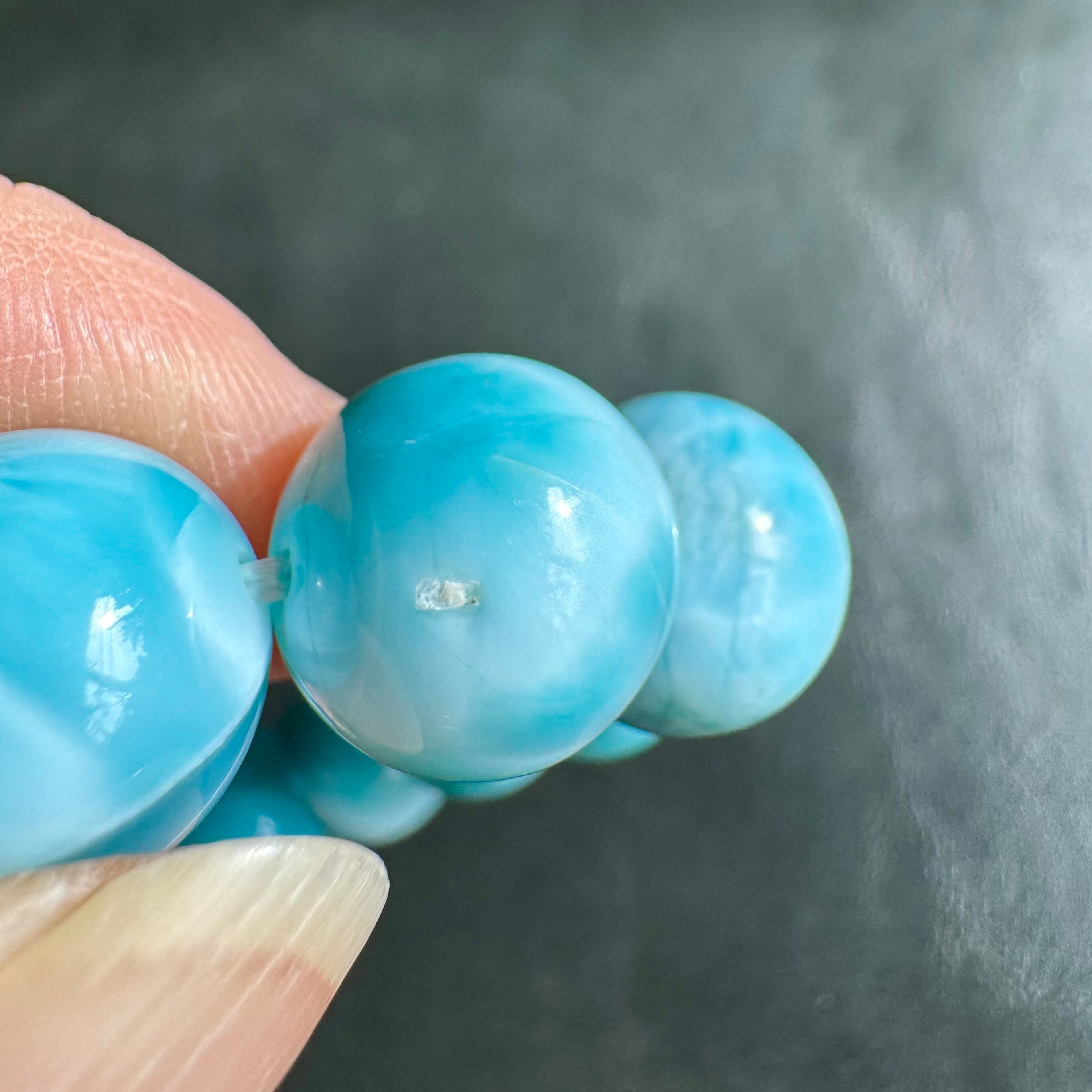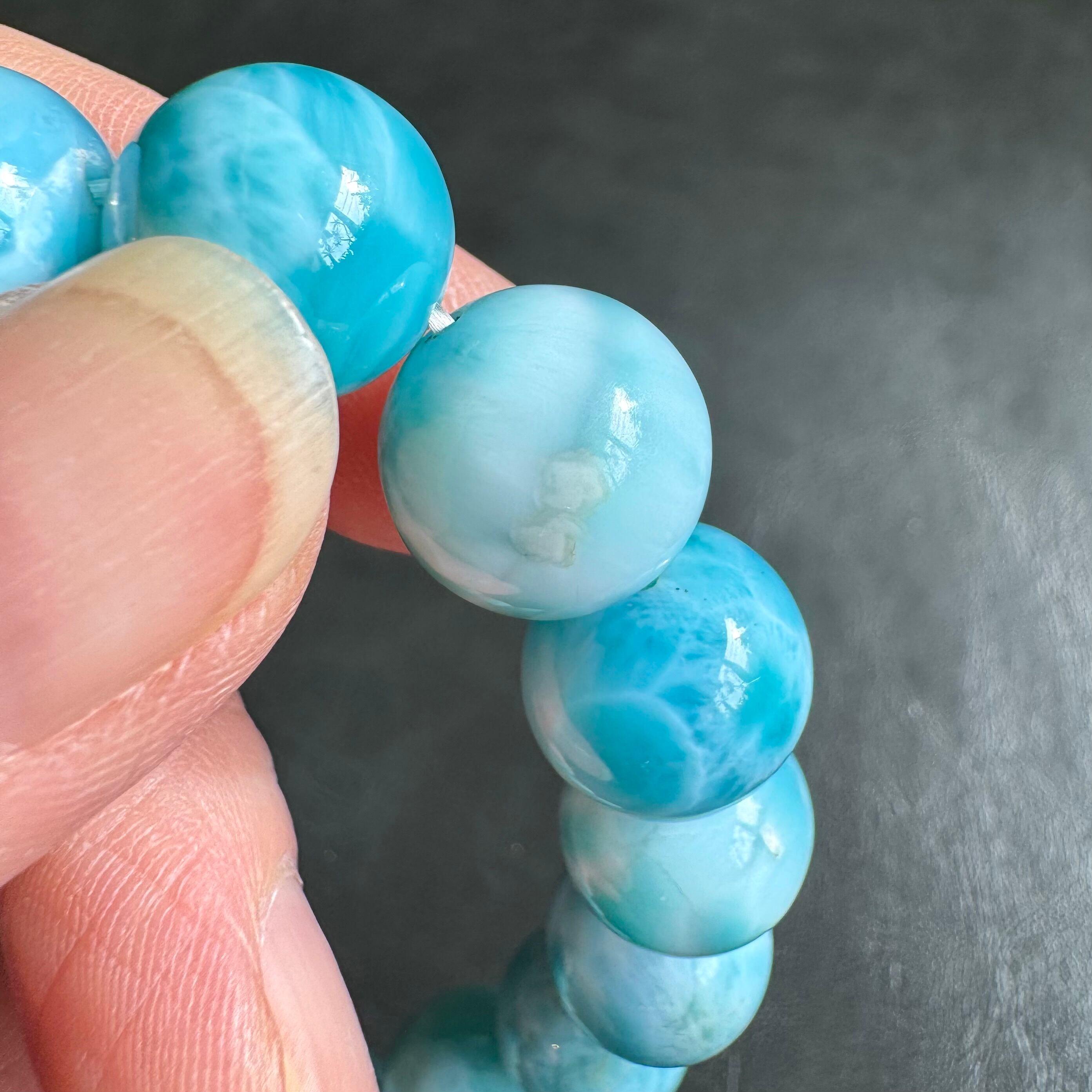 12mmと比較をすると、色はこちらの方が濃く鮮やかで黒点も少なく模様が多いですが、ほんの少しグリーン寄りに見える感じもあります。ただ、それも比較した場合で、単品で見た場合、グリーン寄りではなくしっかり青みのある綺麗なラリマーと言えると思います。