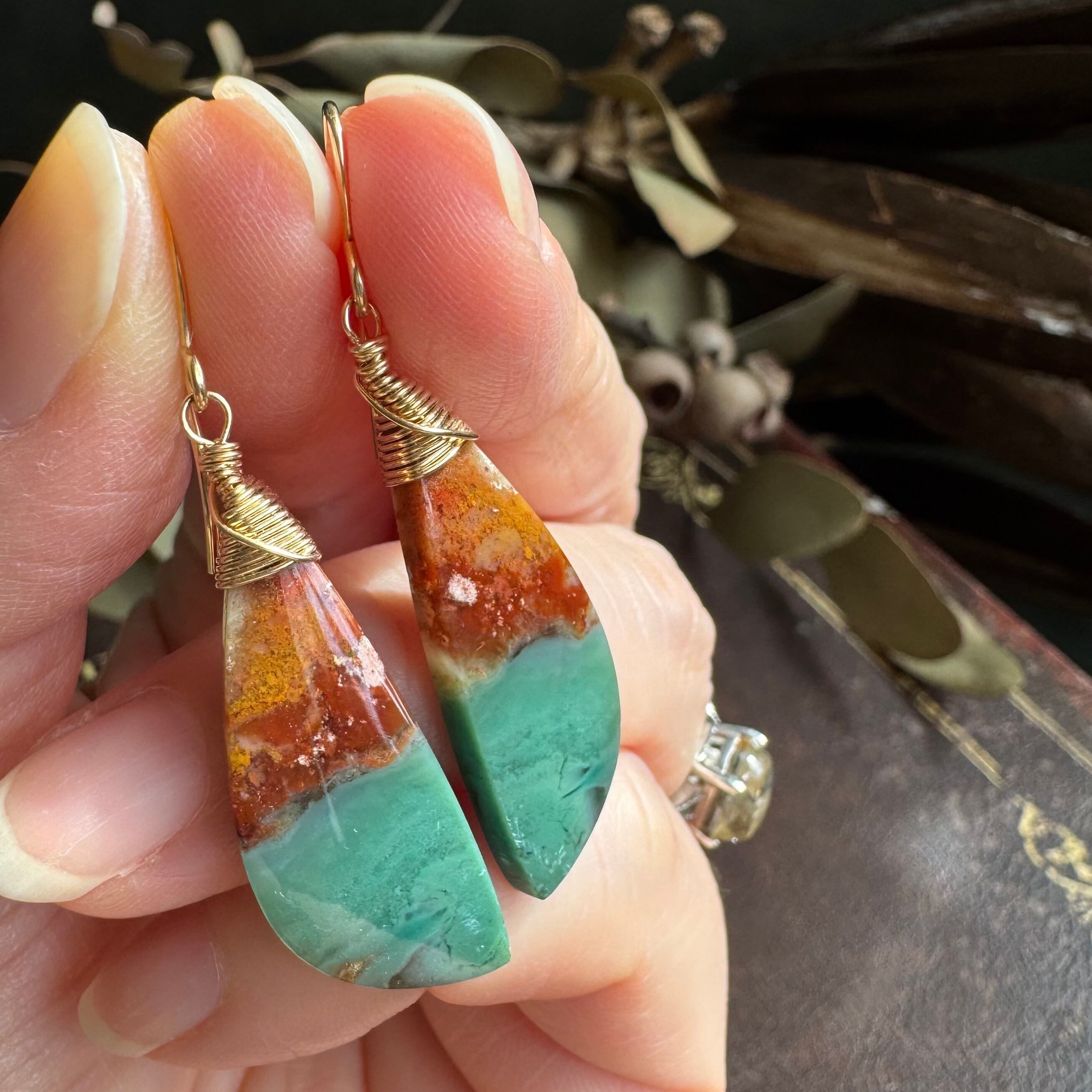 こちらは、明るめのブラウンとブルーグリーンのバイカラー風のピアスです