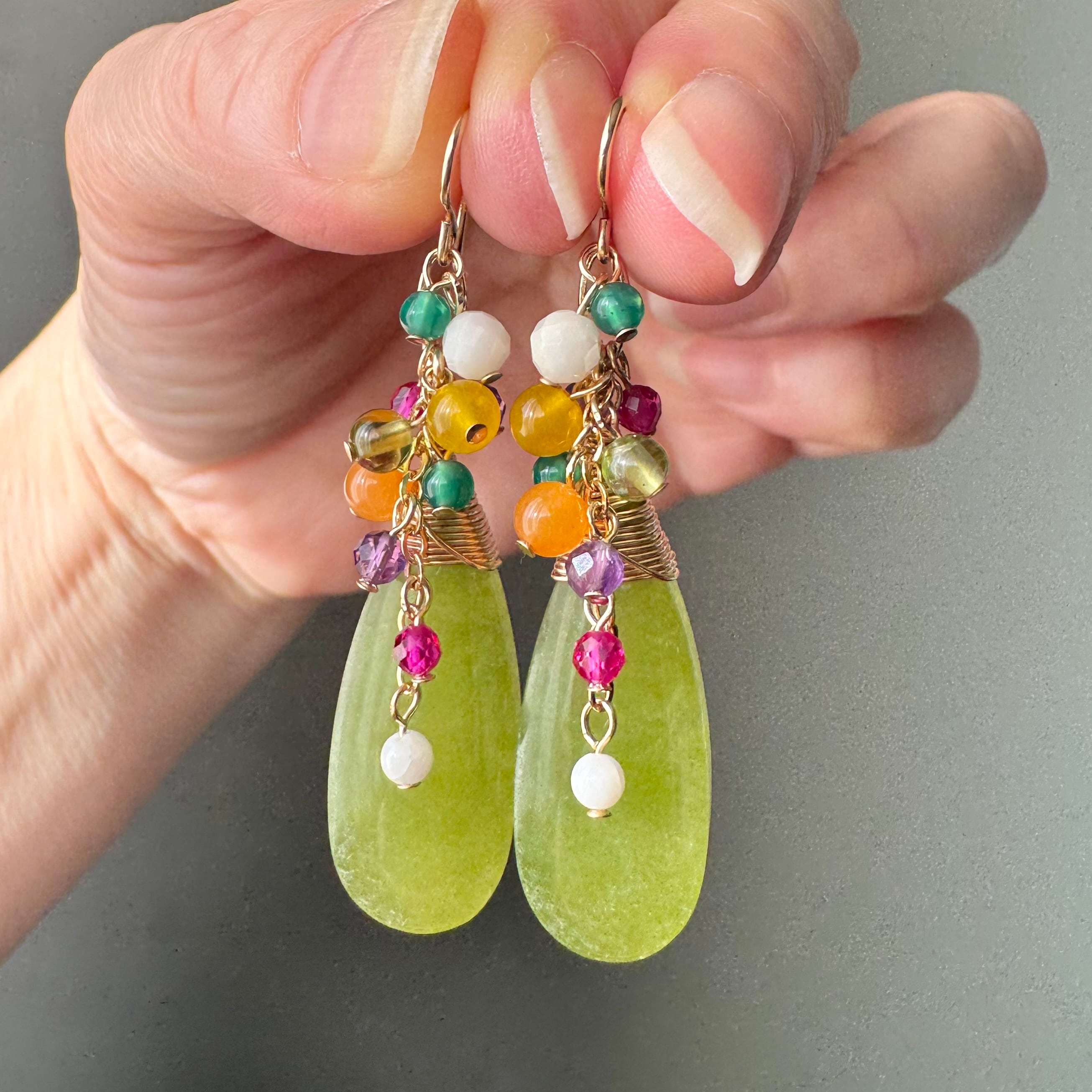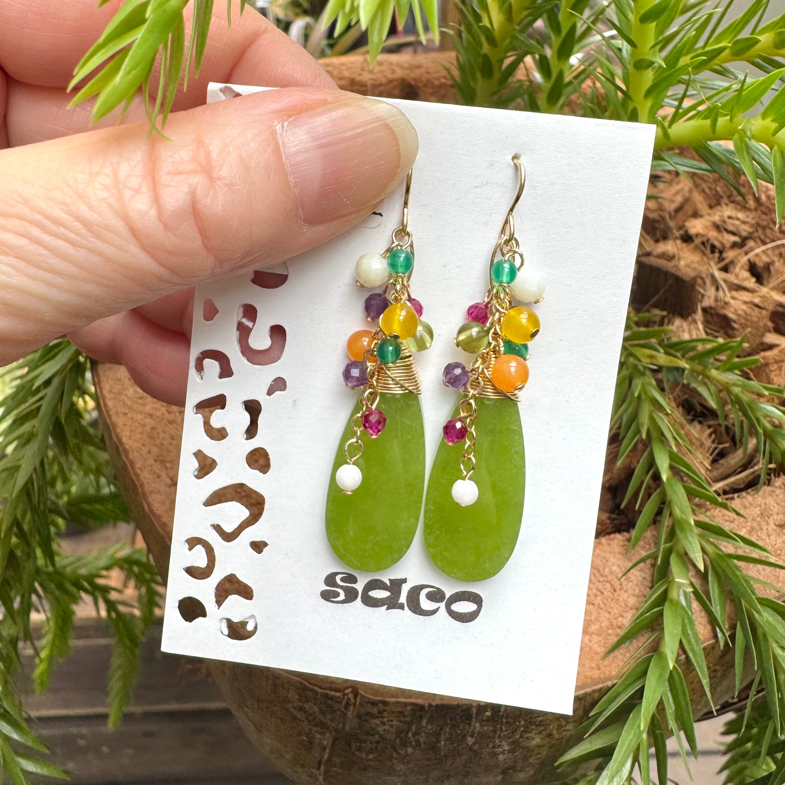 こちらは、アイドクレースという鮮やかさのあるグリーンの大粒の石に、カラフルなつぶつぶを合わせています