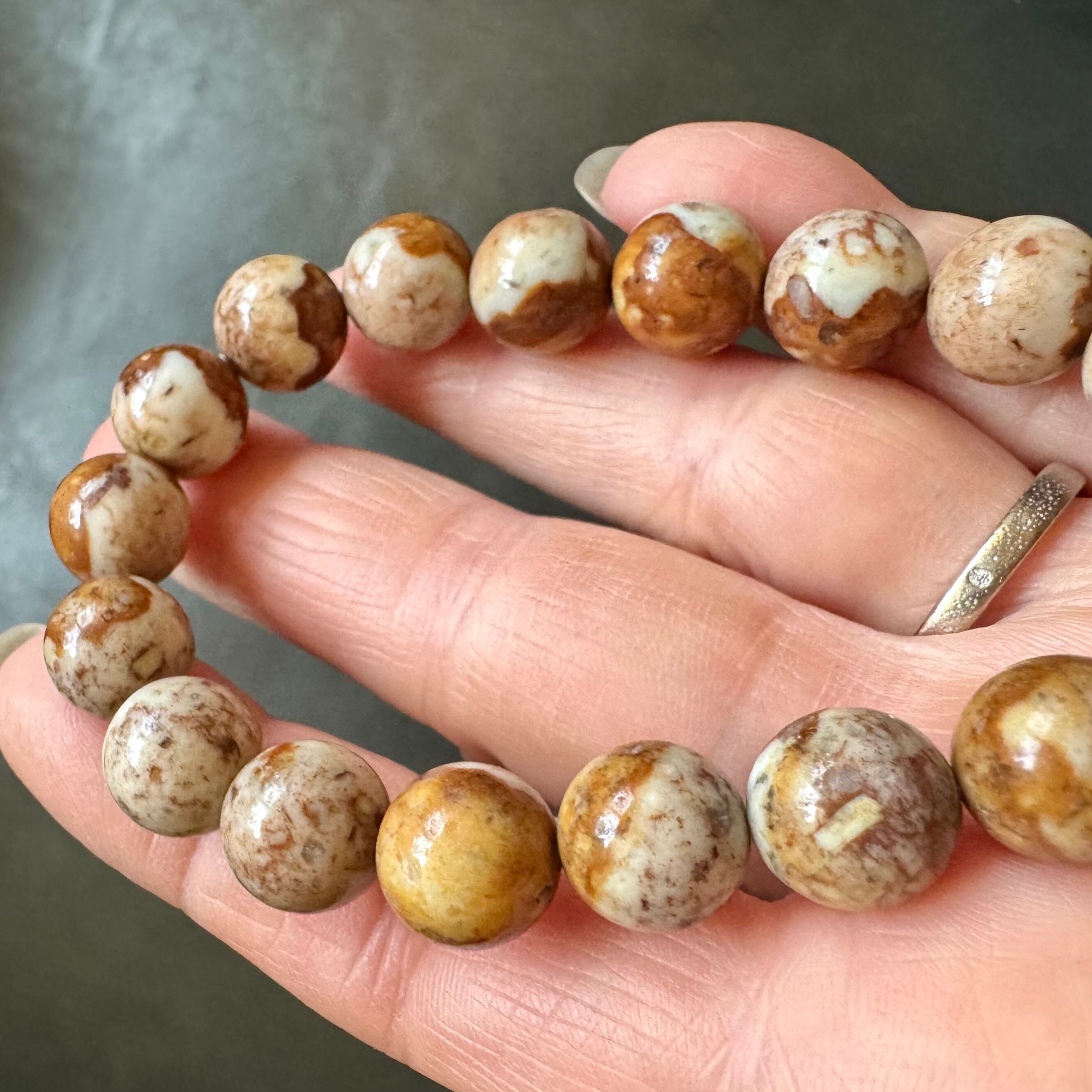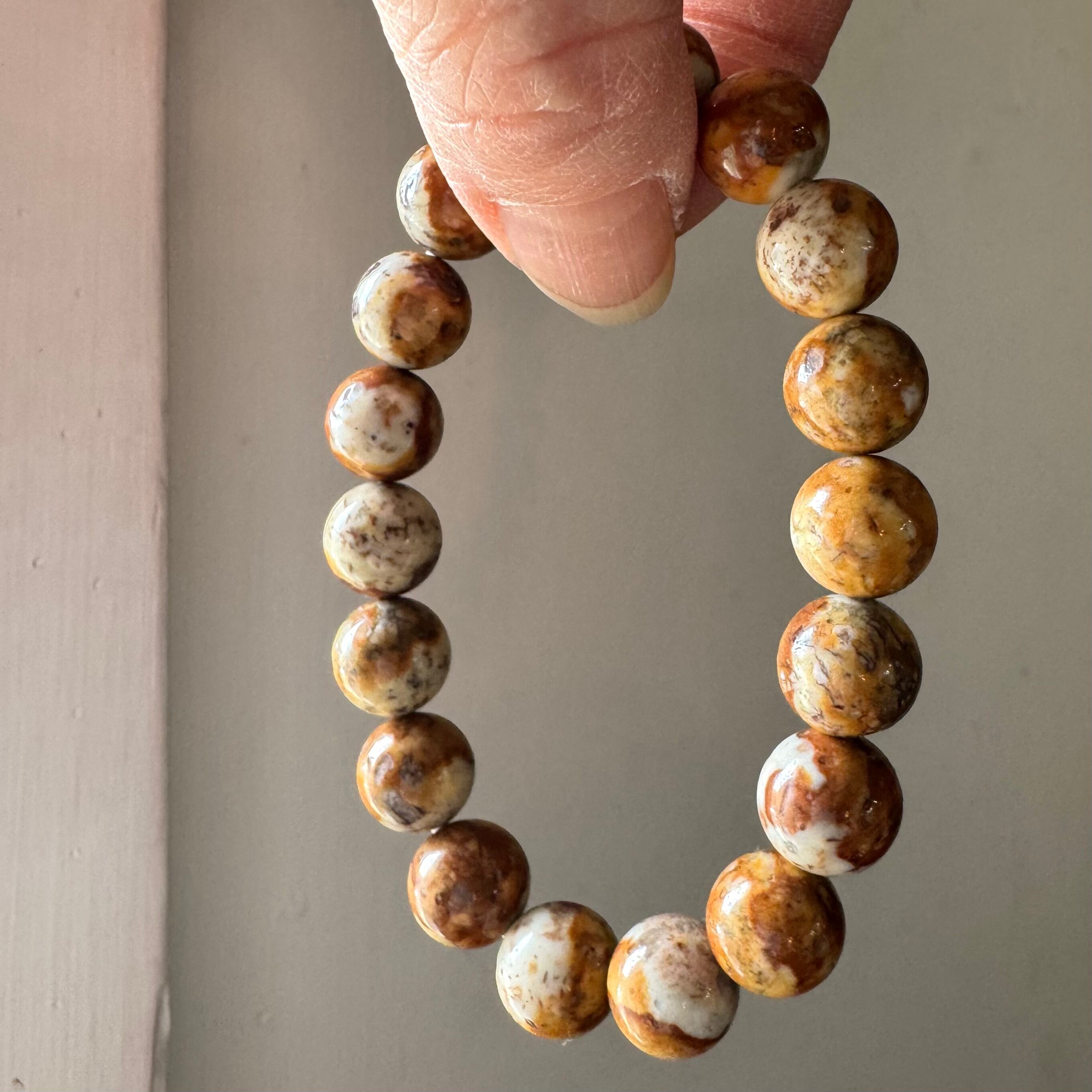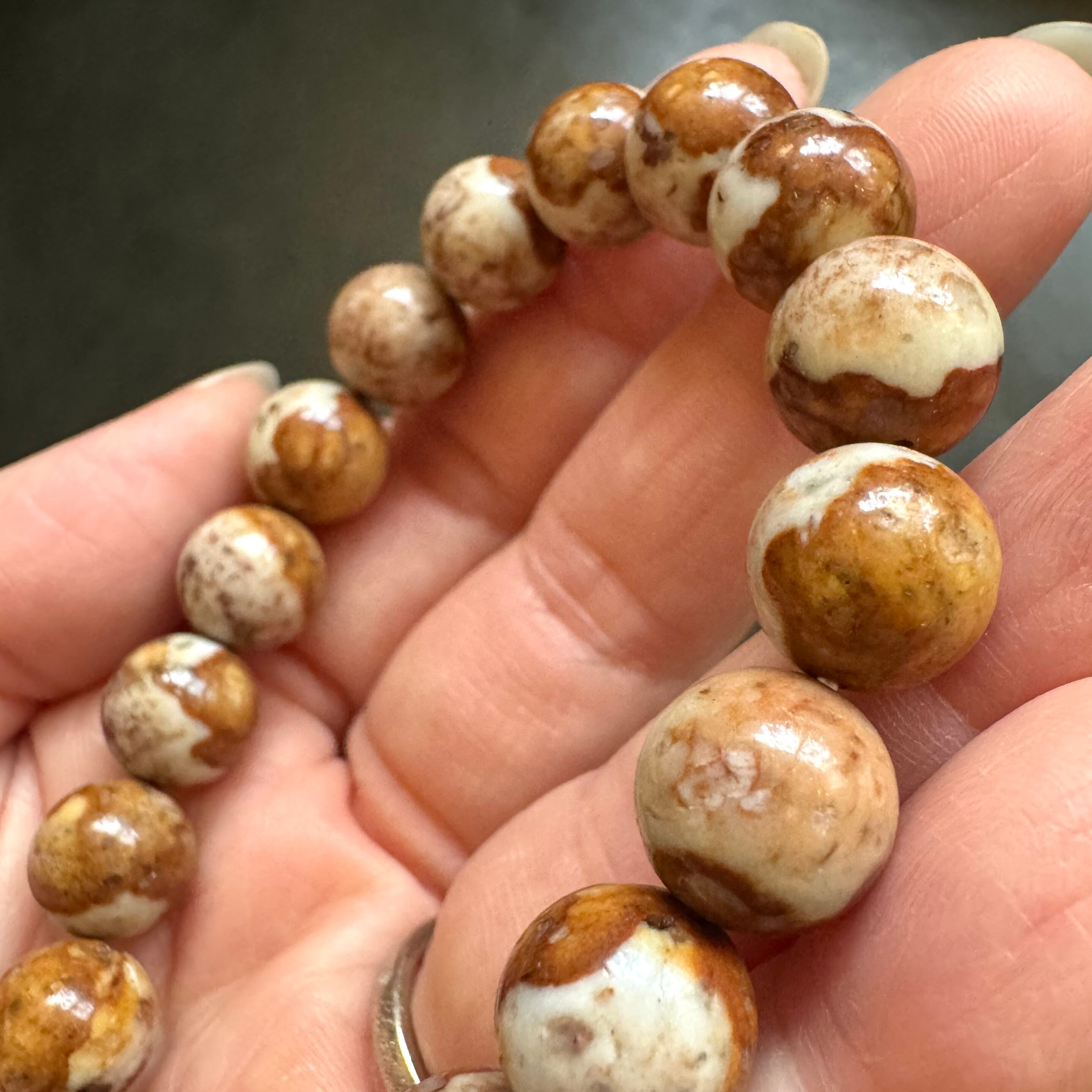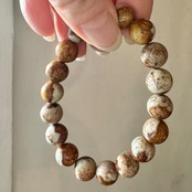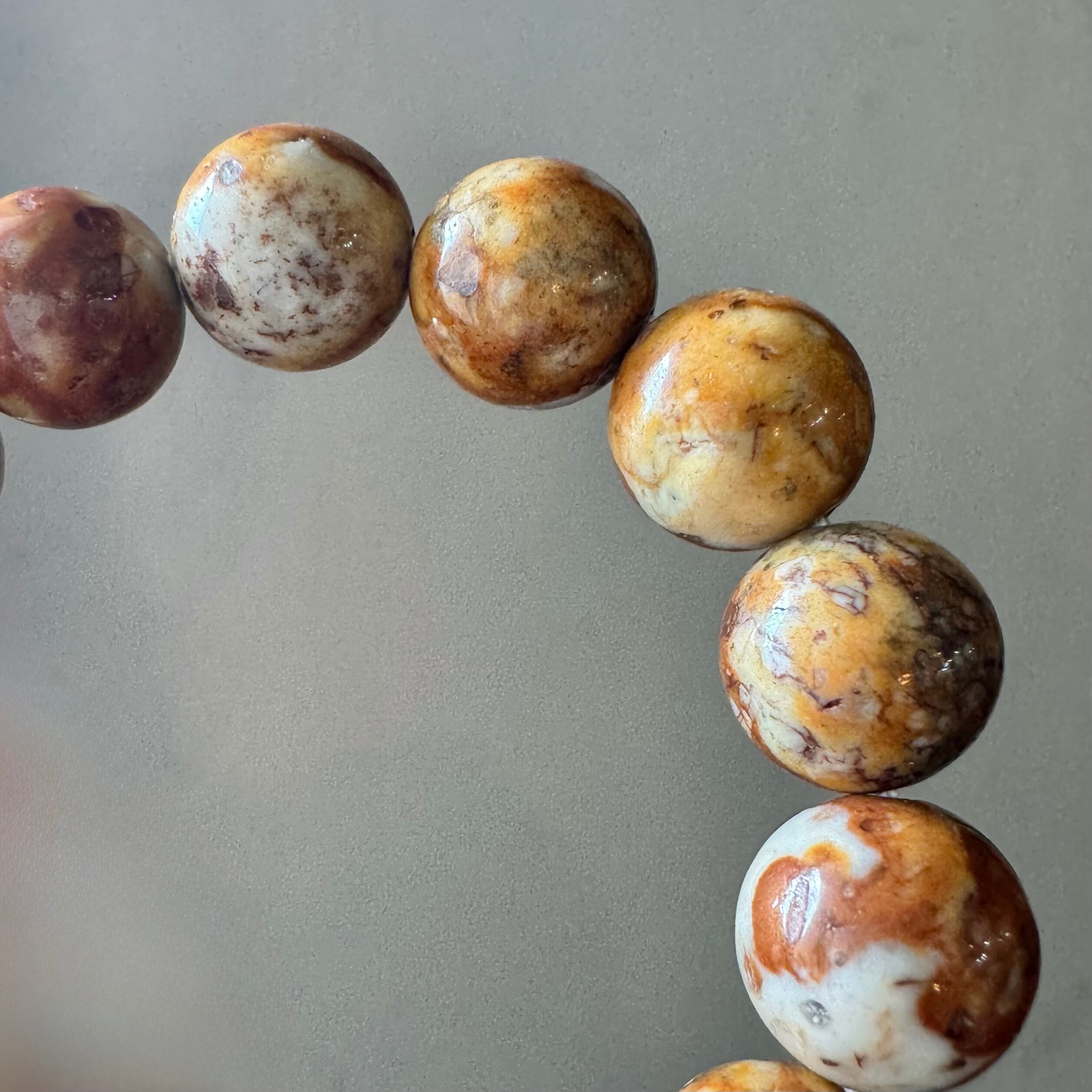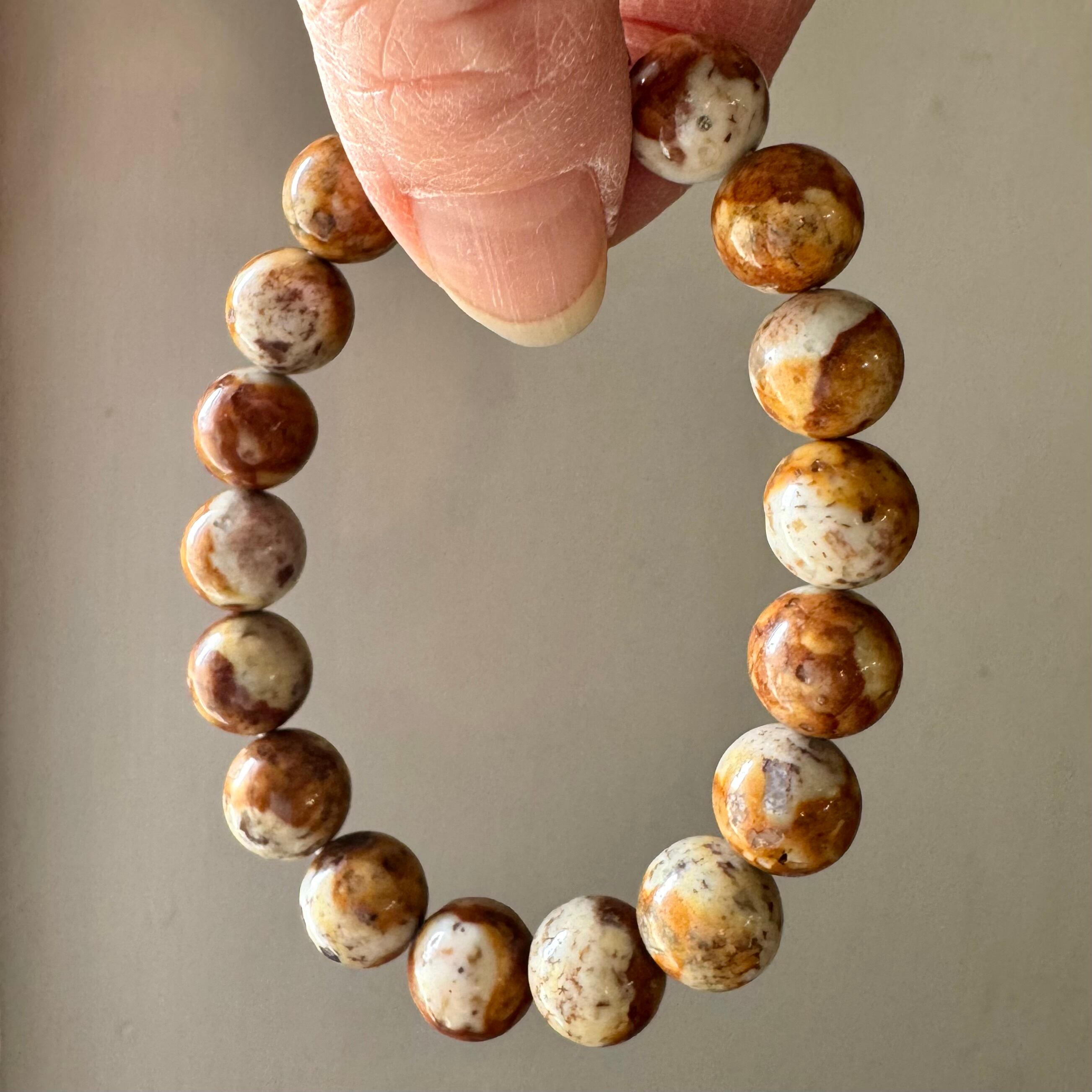 こちらのブレスレットは、薄いベージュにブラウンや落ち着いたイエローが混ざって模様を成しているタイプです。