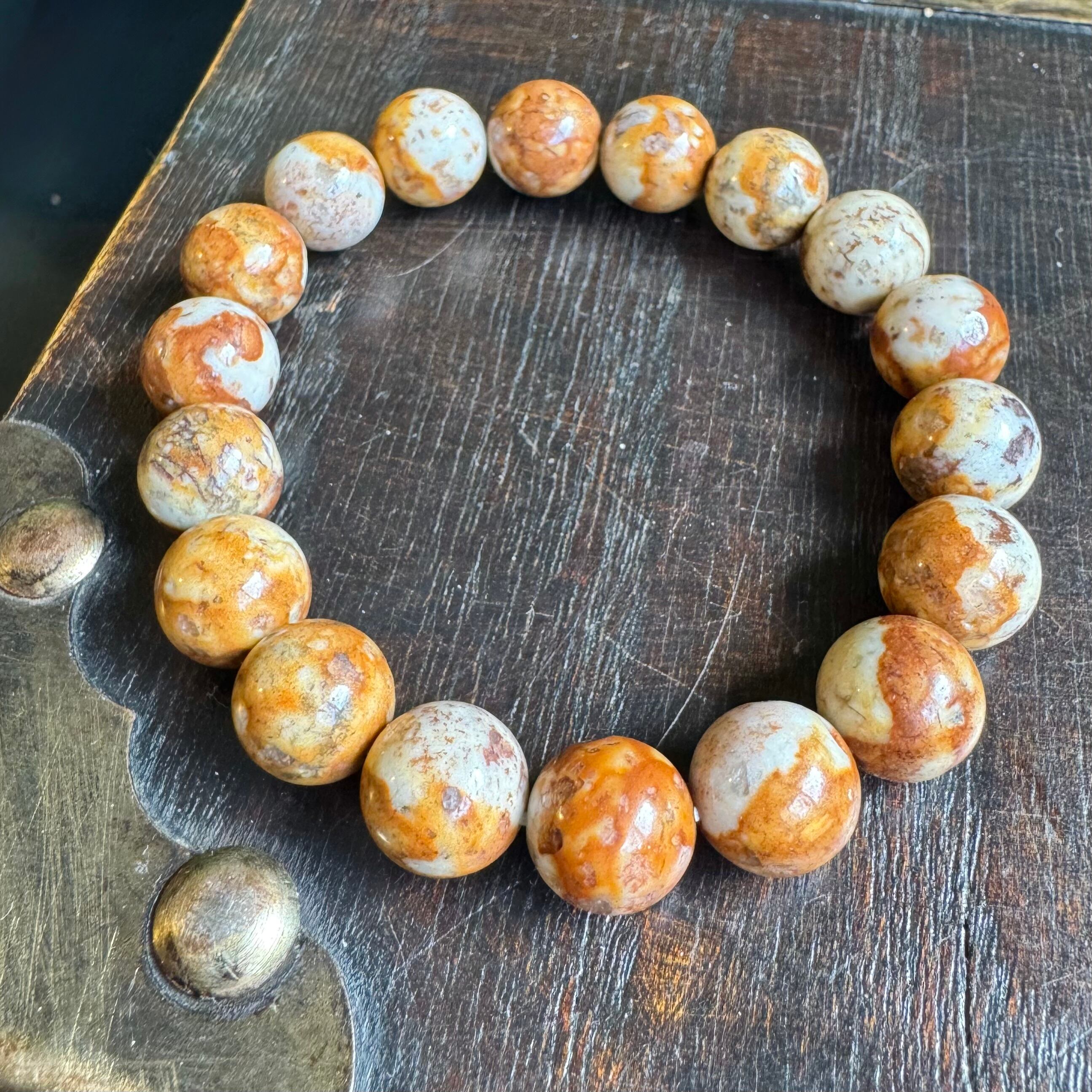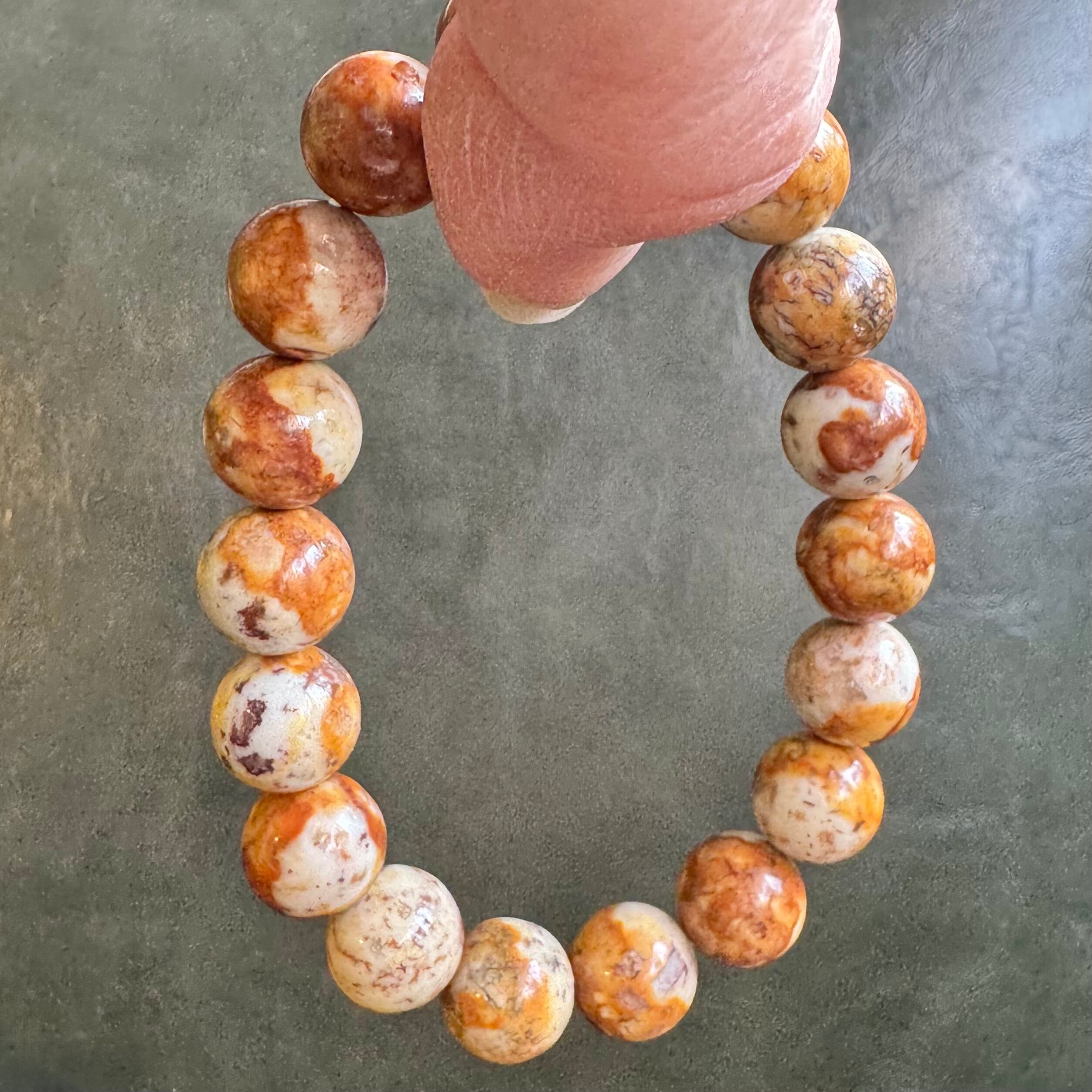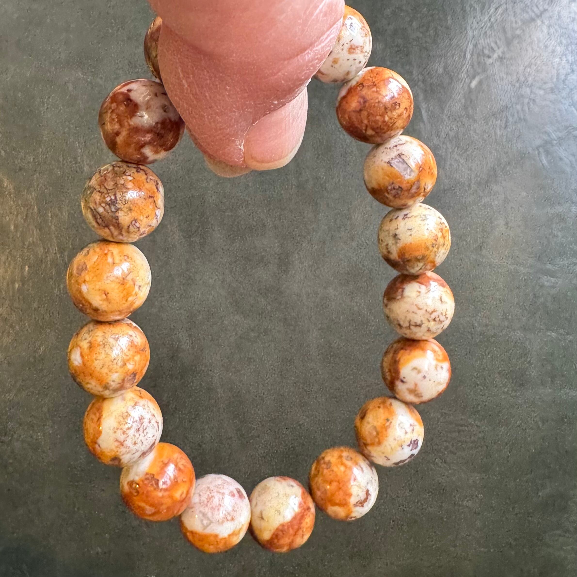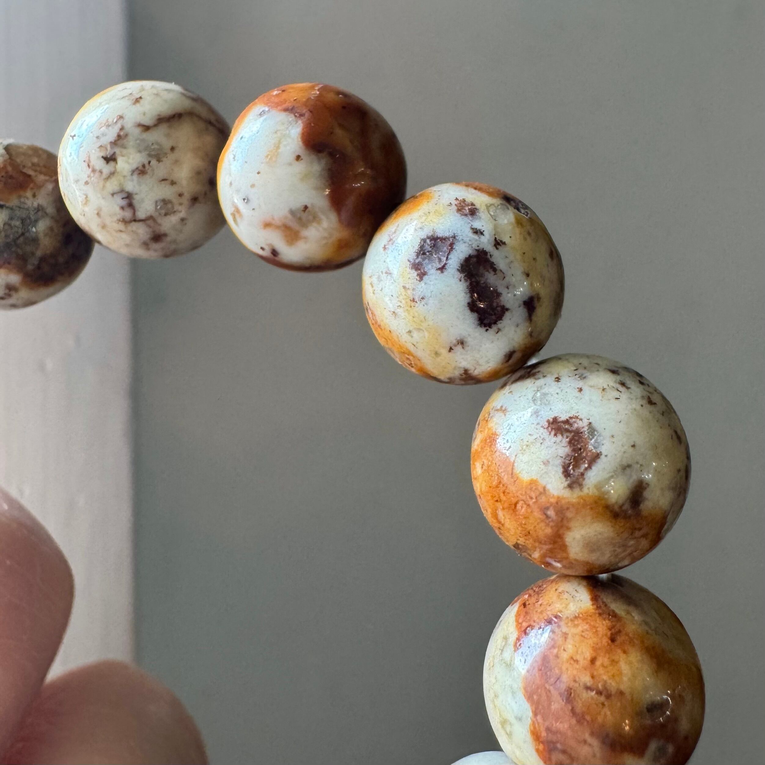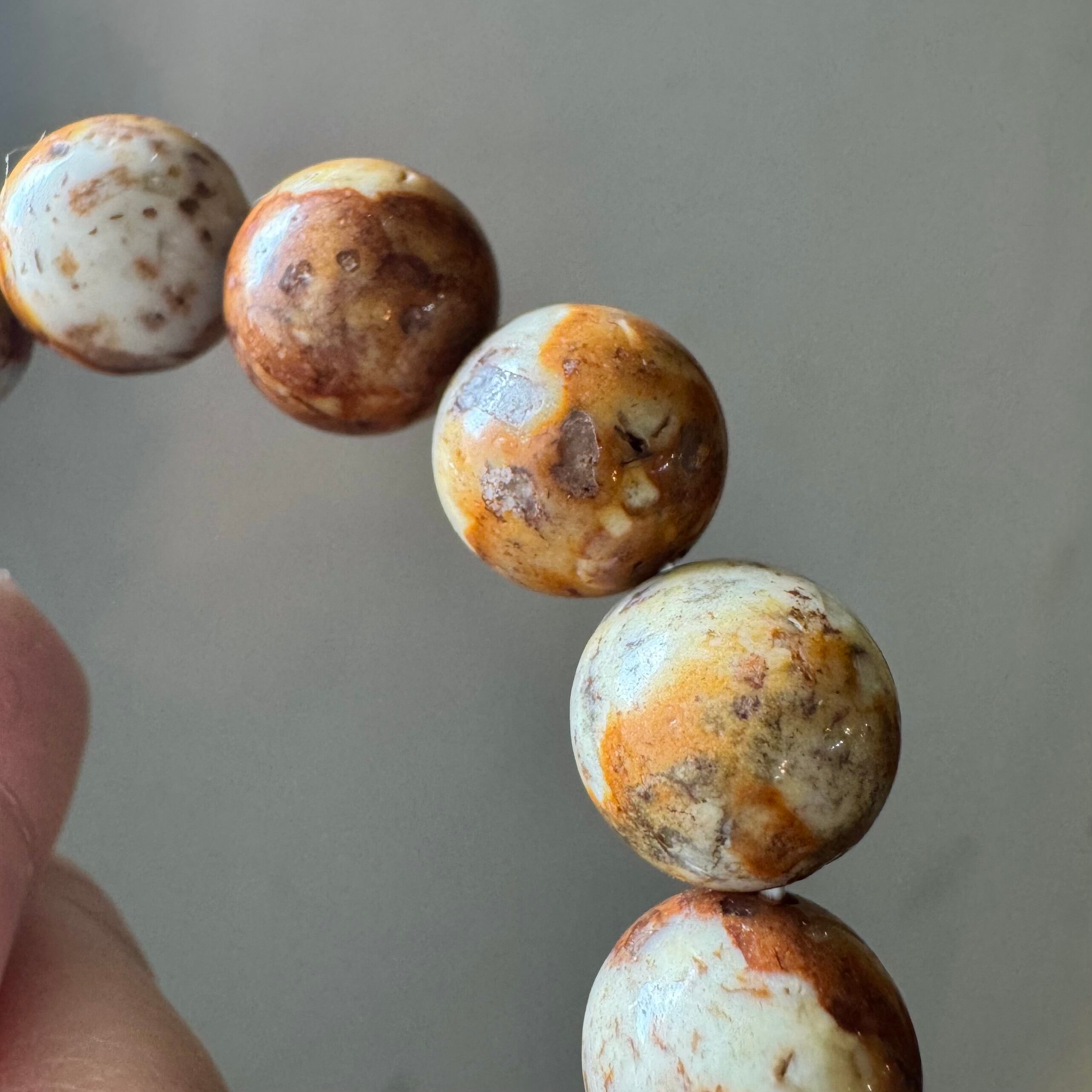 こちらのブレスレットは、薄いベージュにブラウンや落ち着いたイエローが混ざって模様を成しているタイプです。