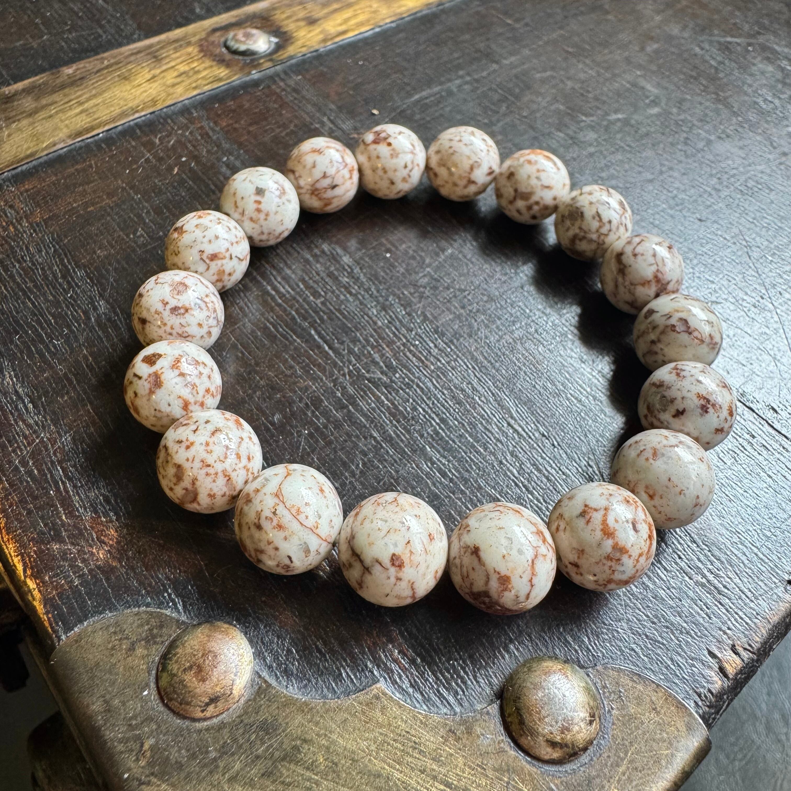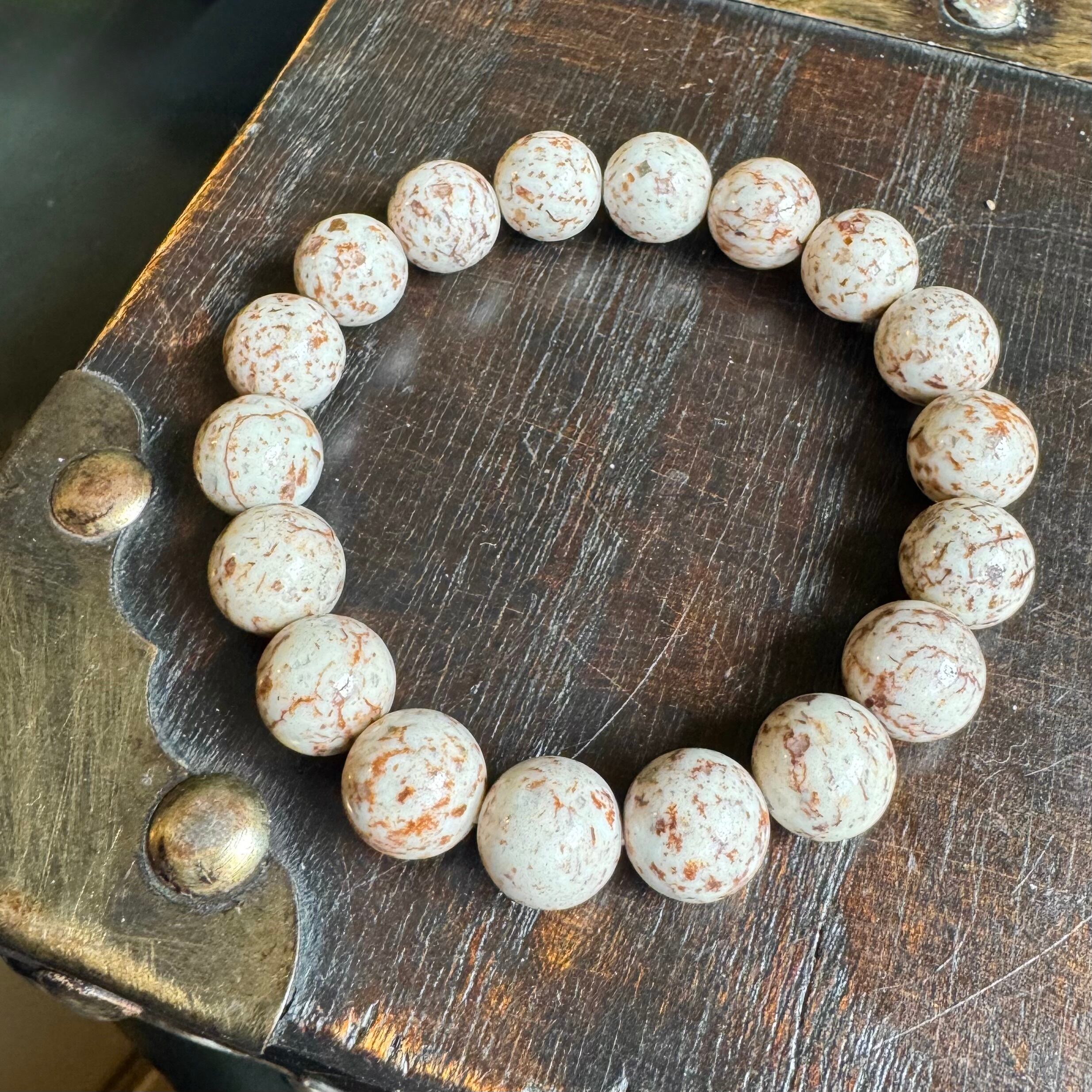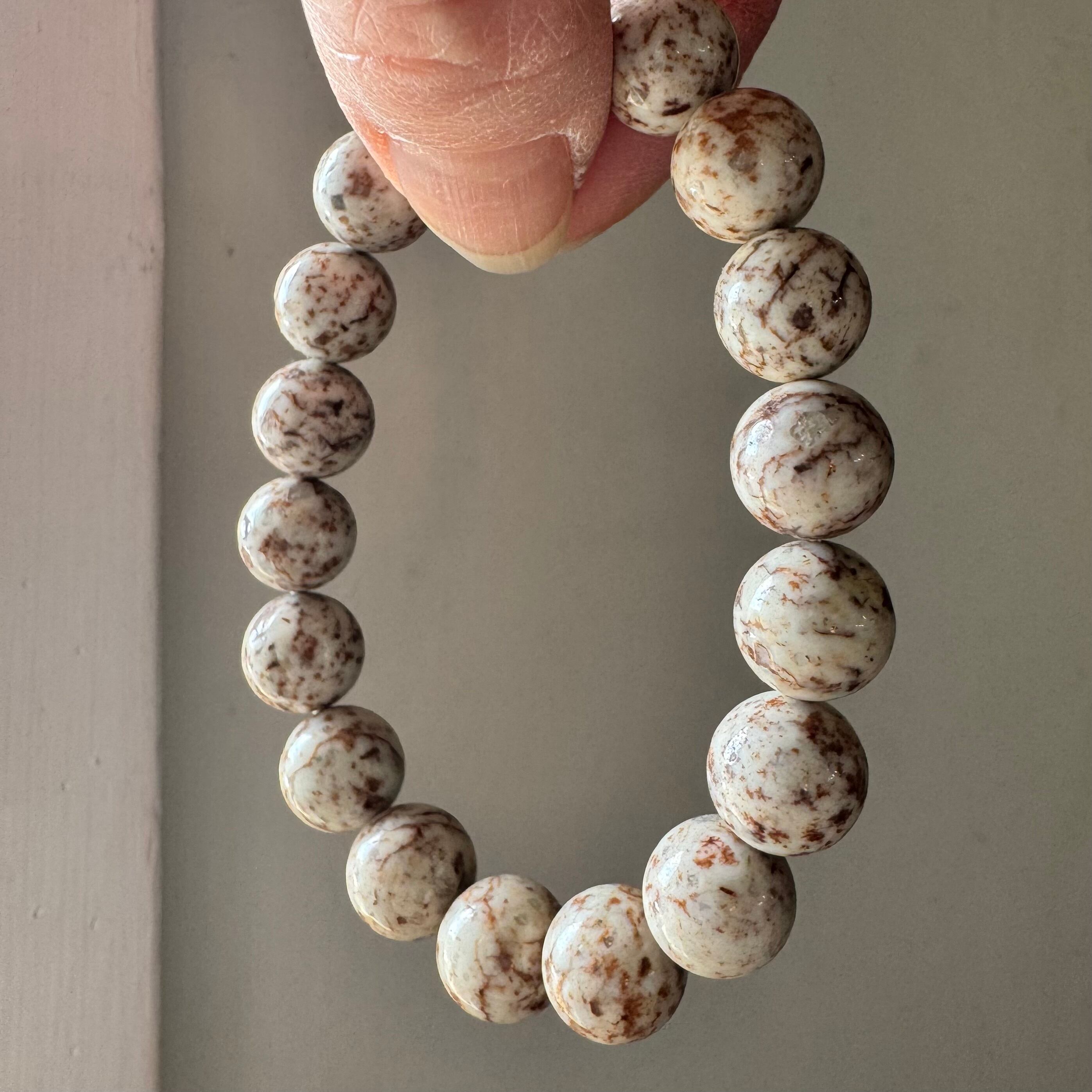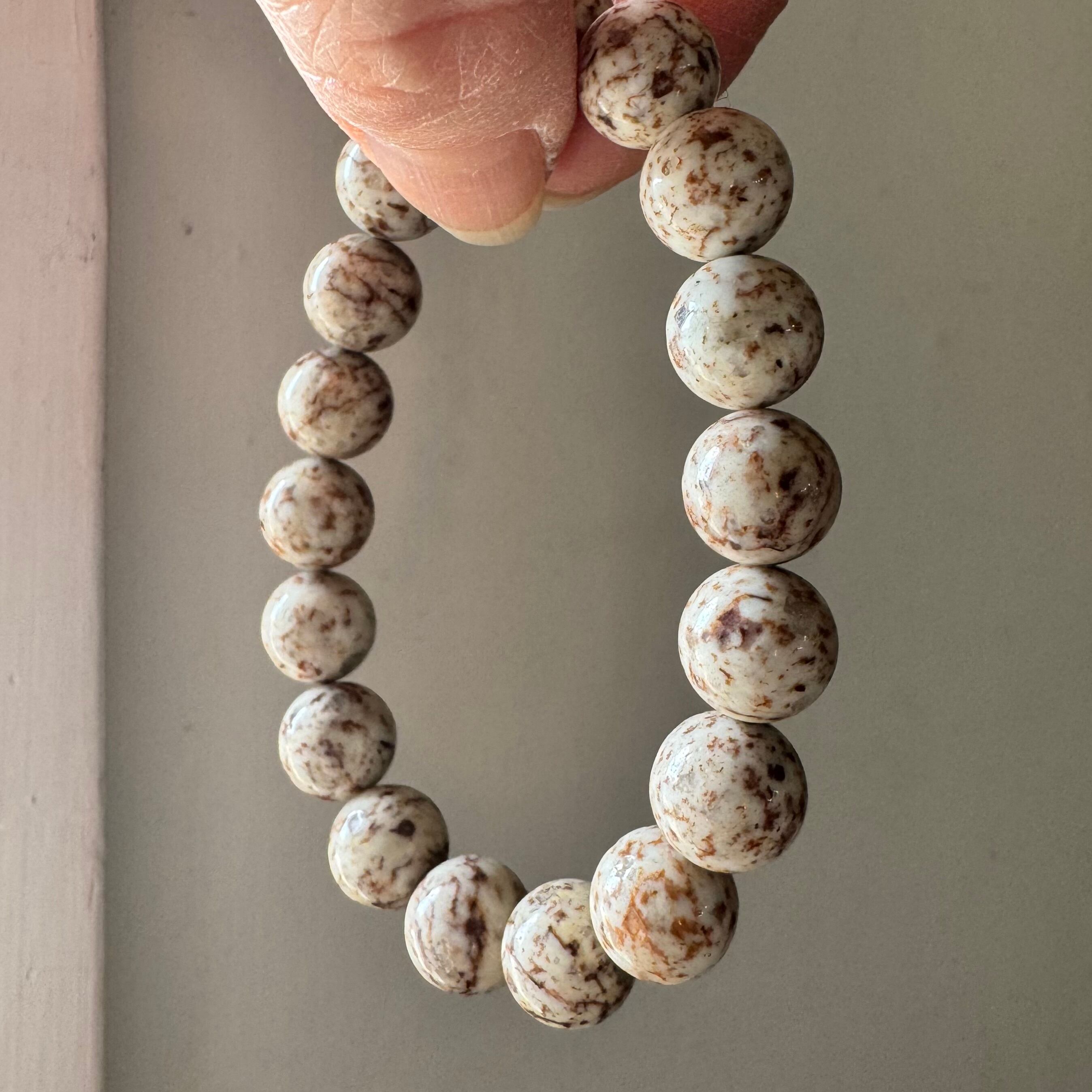 こちらのブレスレットは、白っぽいベージュにブラウン系の模様が見られるタイプです。