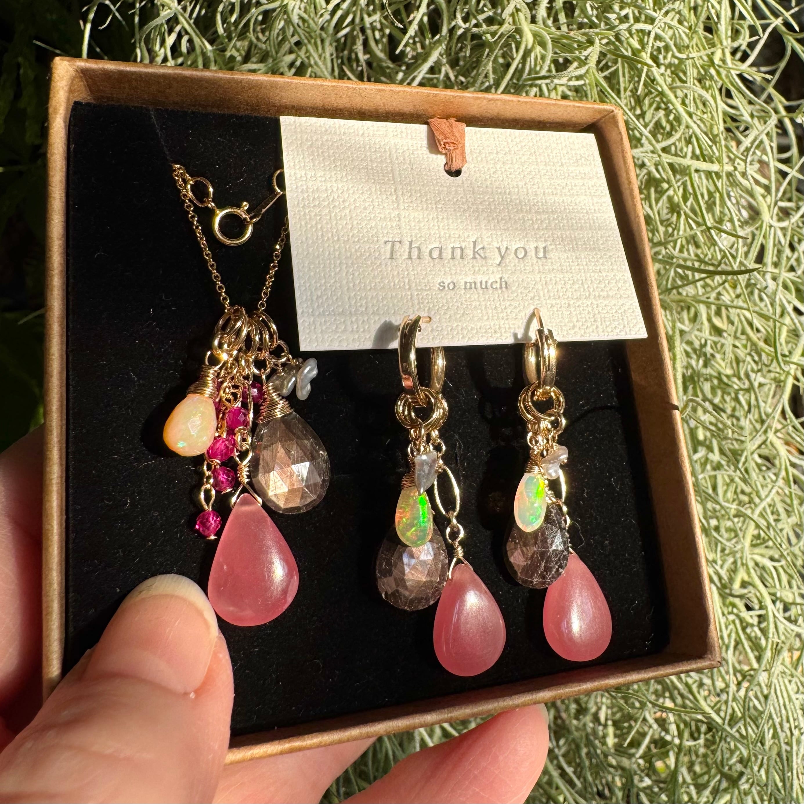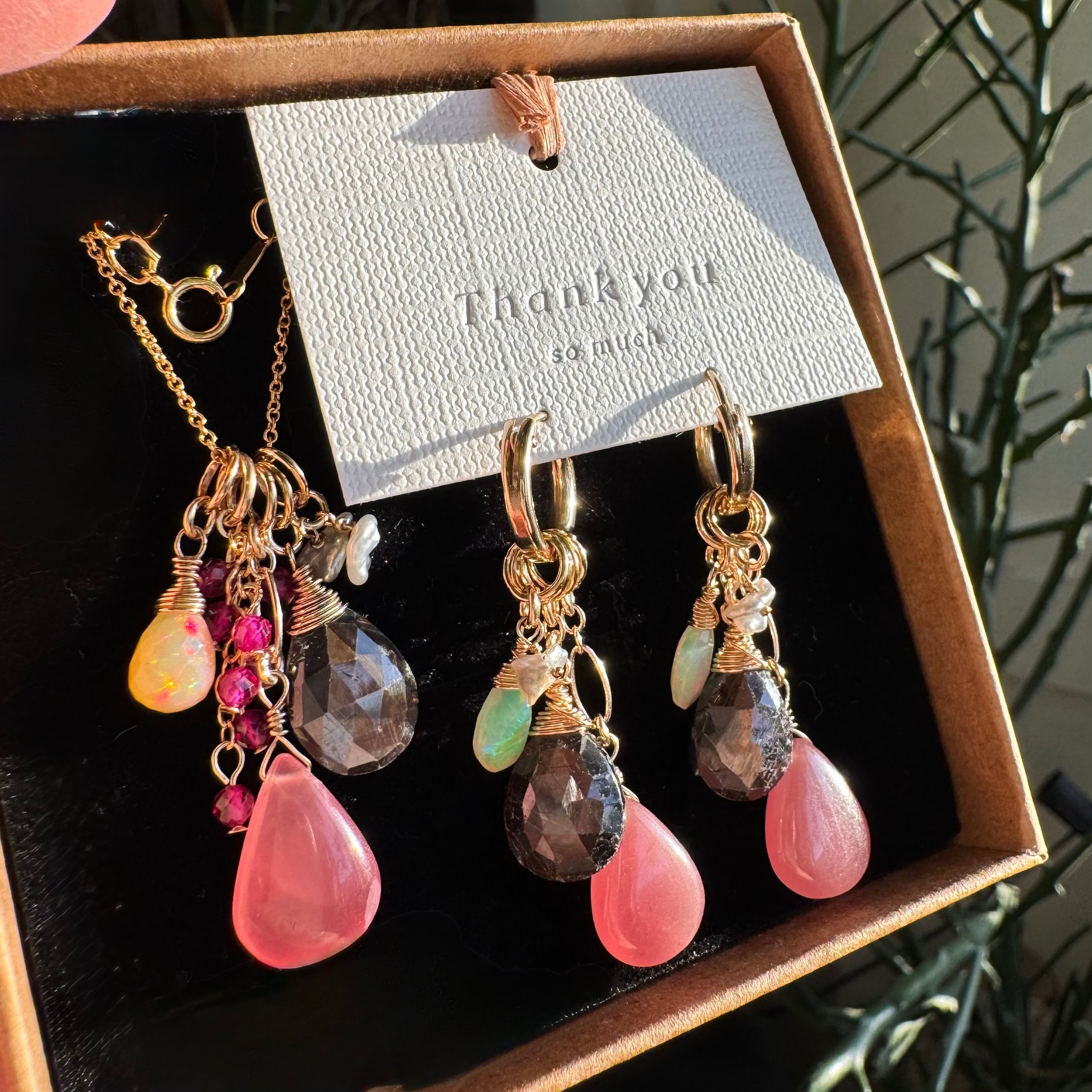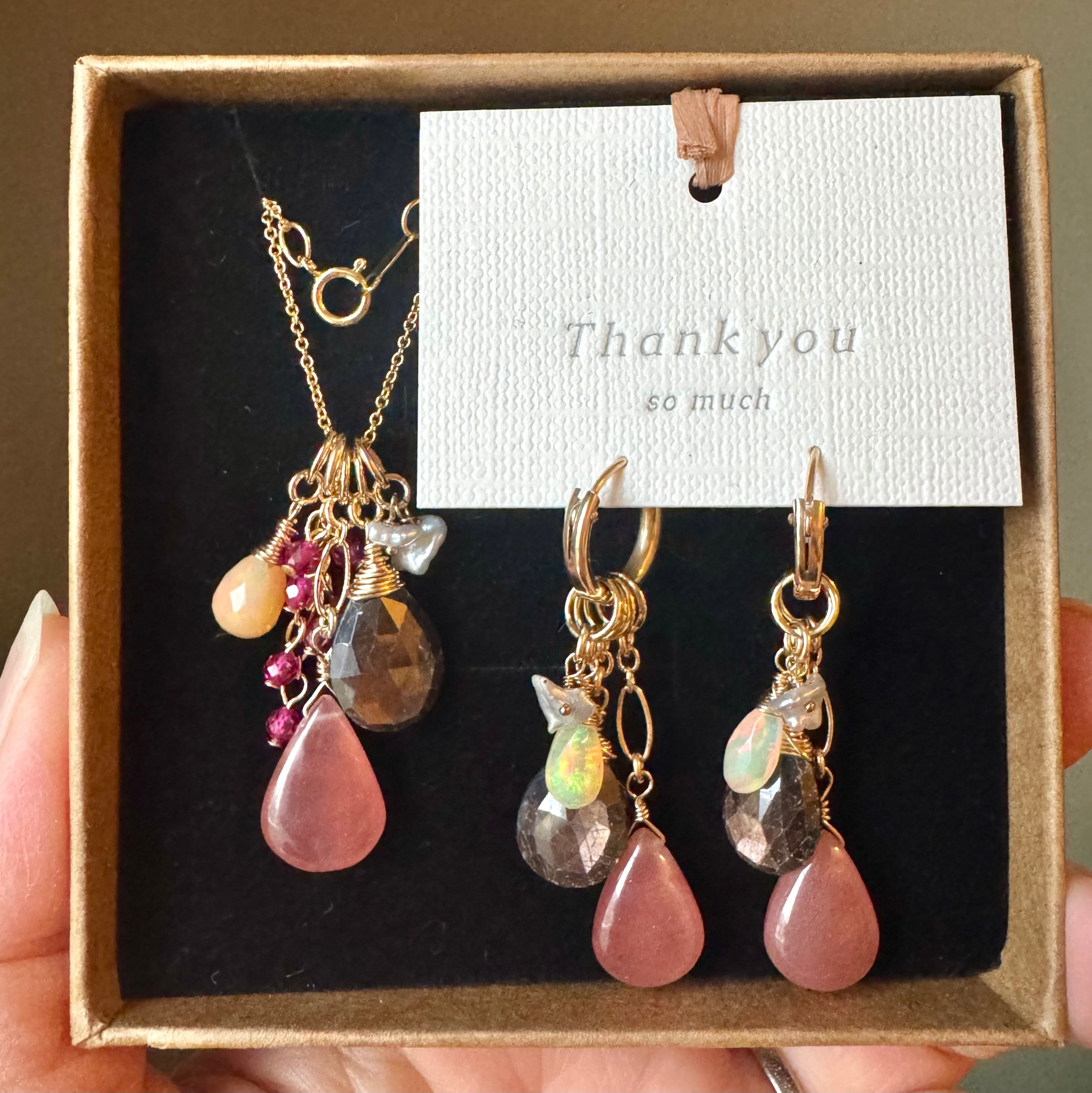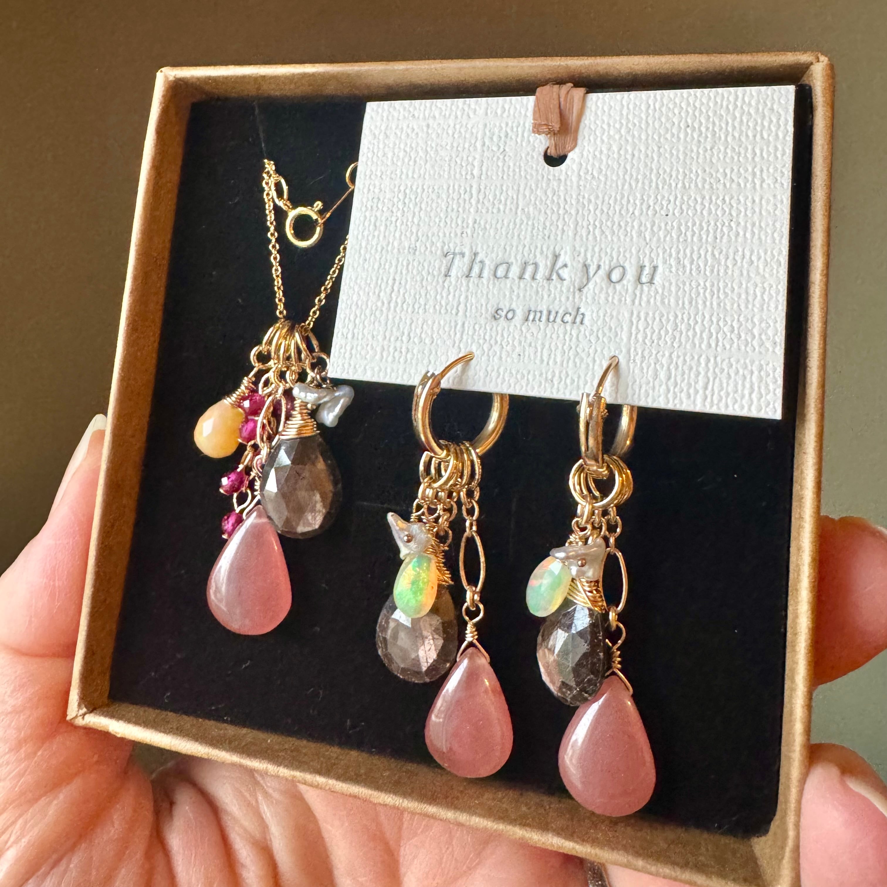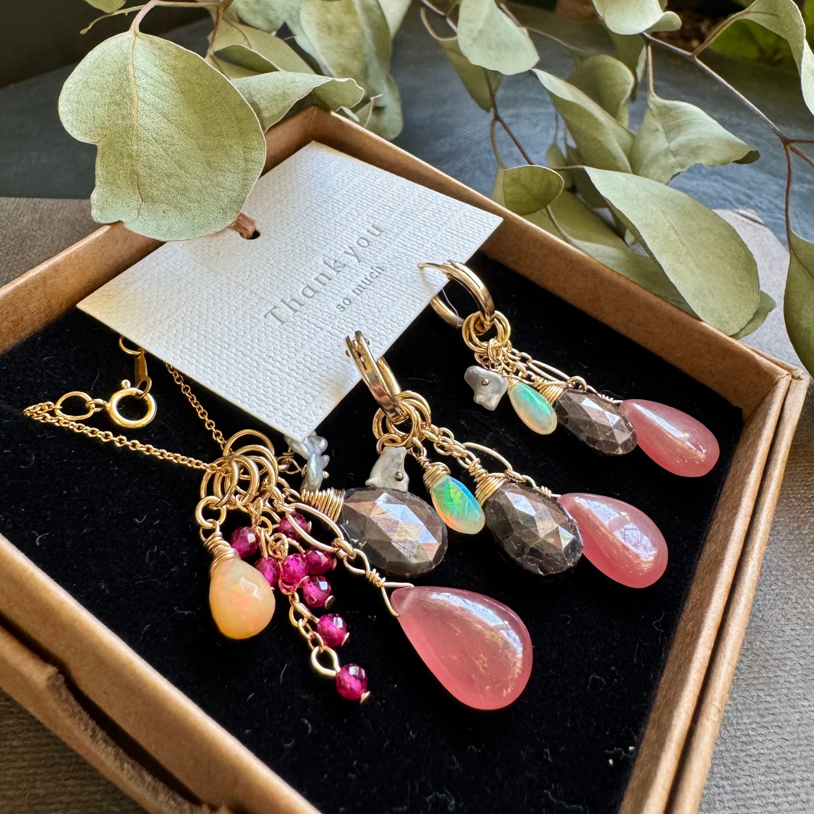 ピンクのロードクロサイトを加えれば女性的な華やかな印象に…ブラウンサファイアとオパールだけにすれば大人なシックなイメージに…とイメージを変えられます