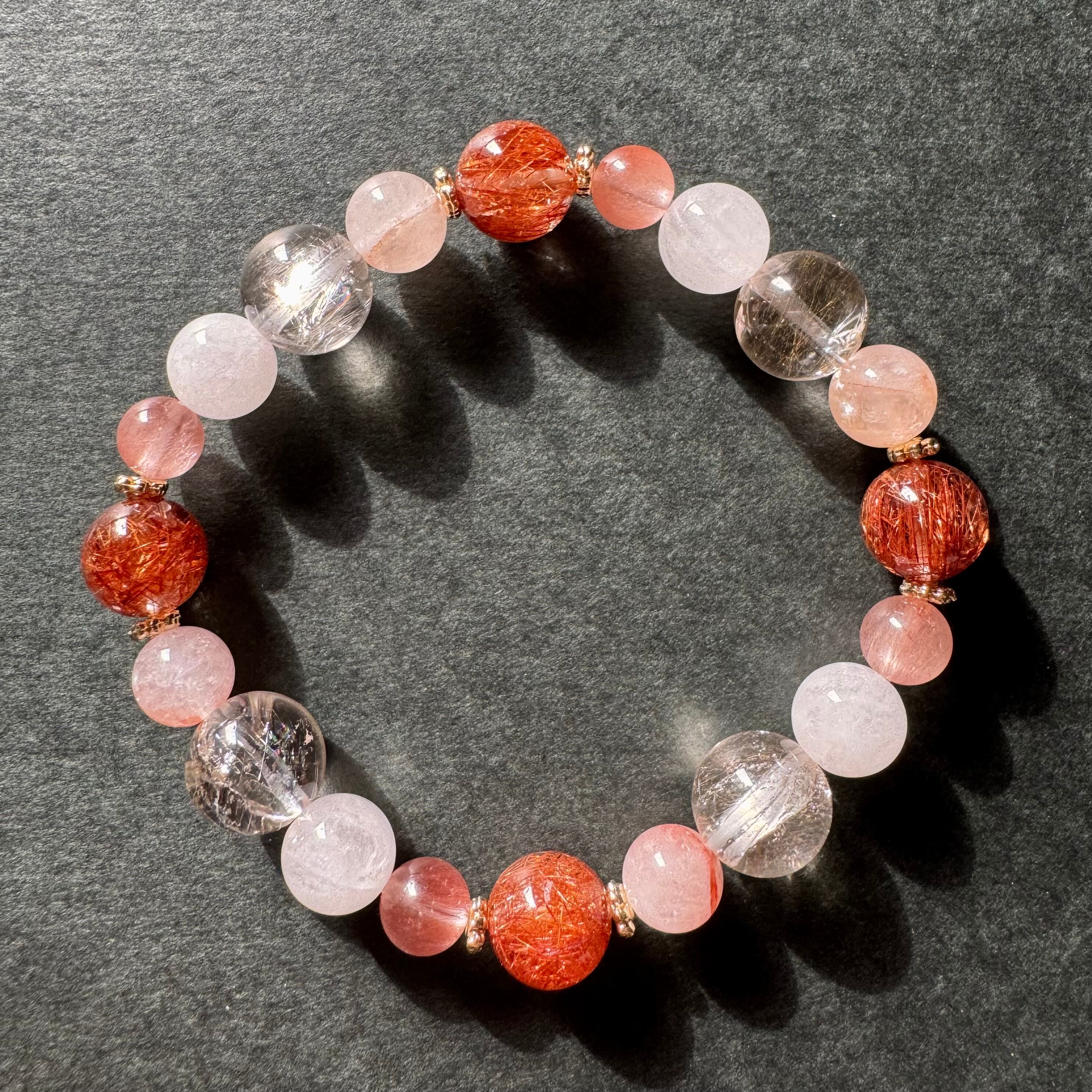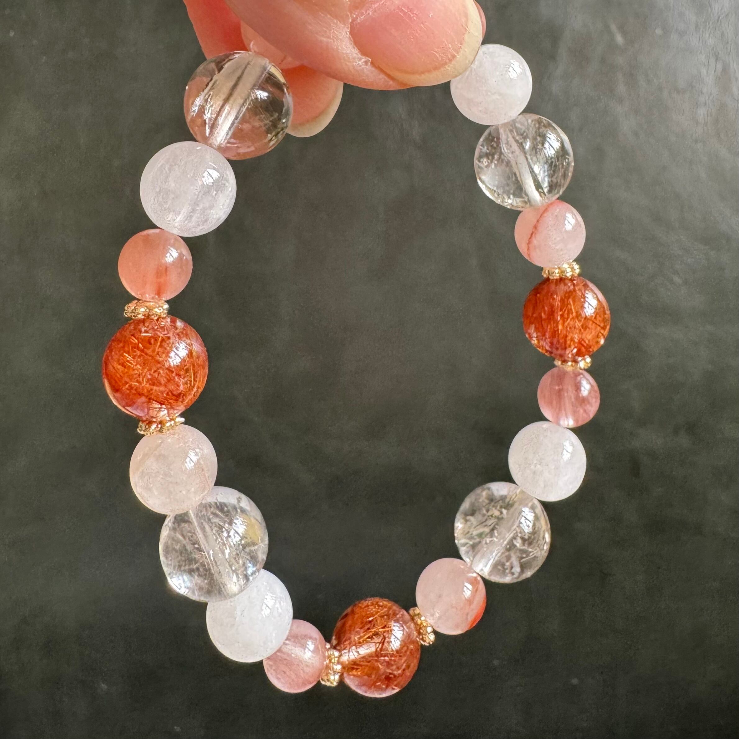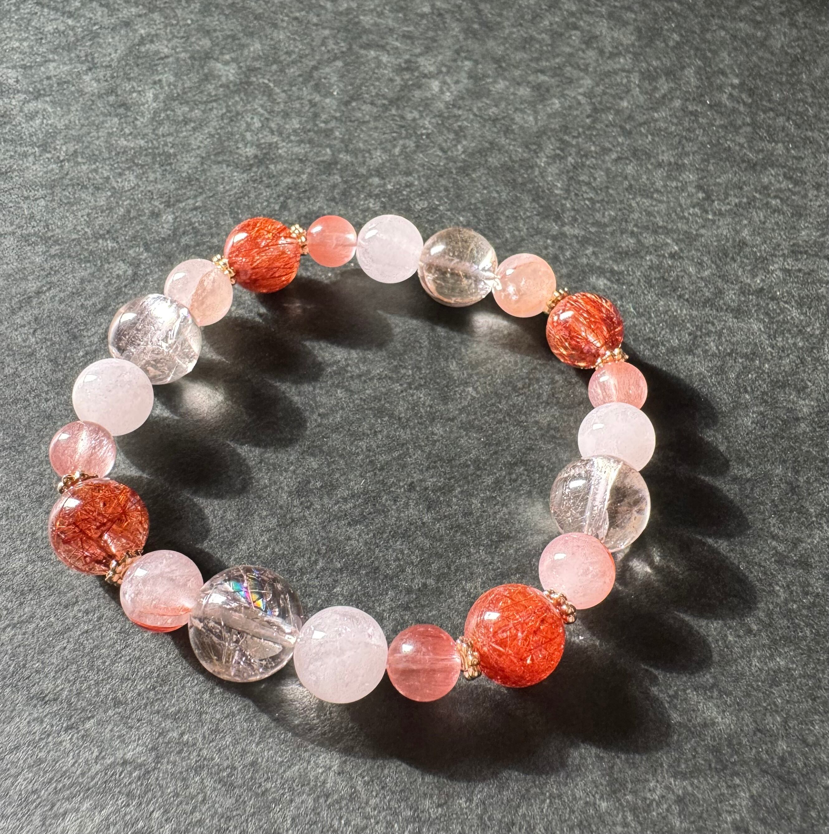ひとつ可愛らしいブレスレットもご用意したくて、赤・ピンク・白で、綺麗で優しい印象の石でおまとめしました