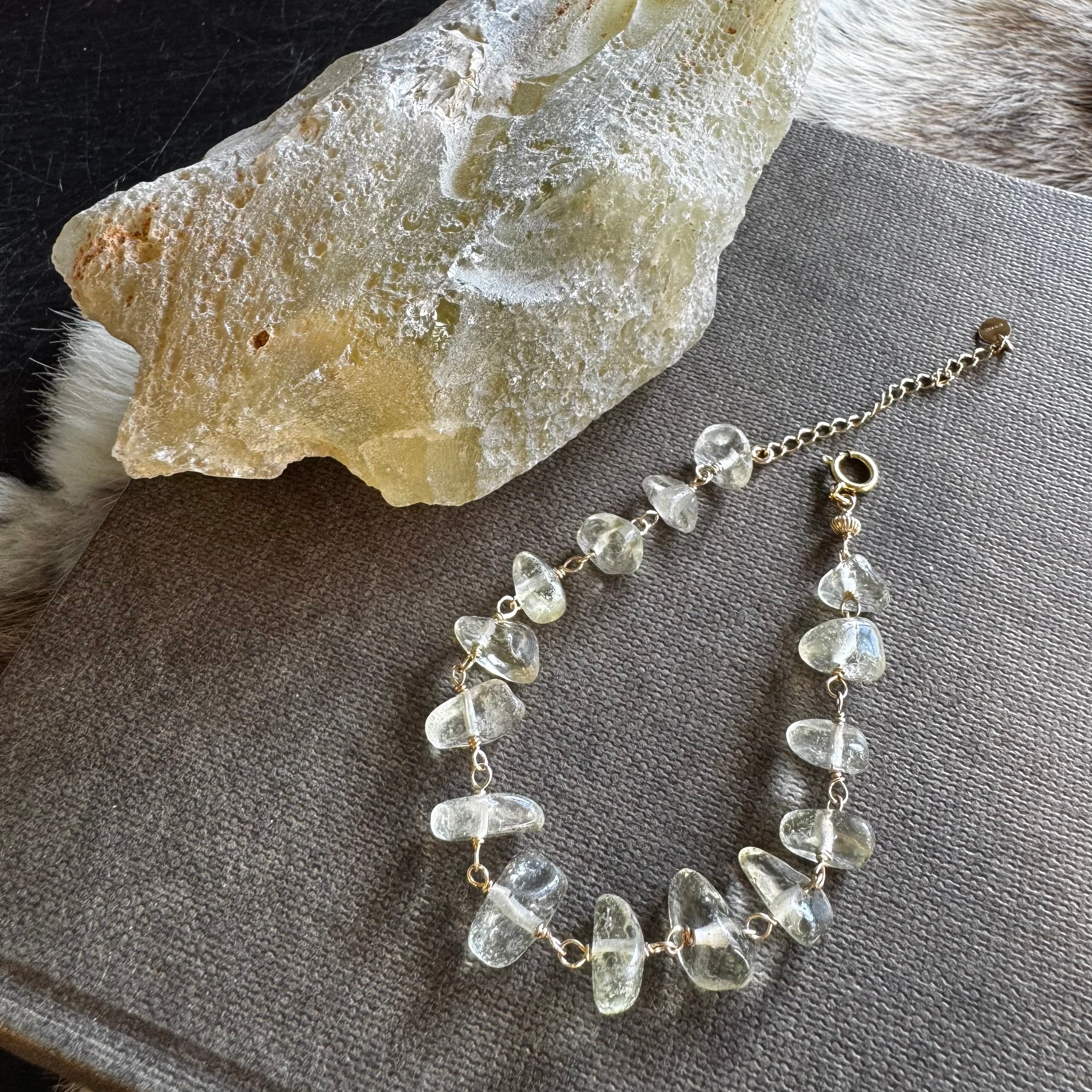 こちらは、丸玉のゴムのブレスレット間違い、細石をワイヤーで繋いで、華奢な雰囲気のブレスレットに仕上げました