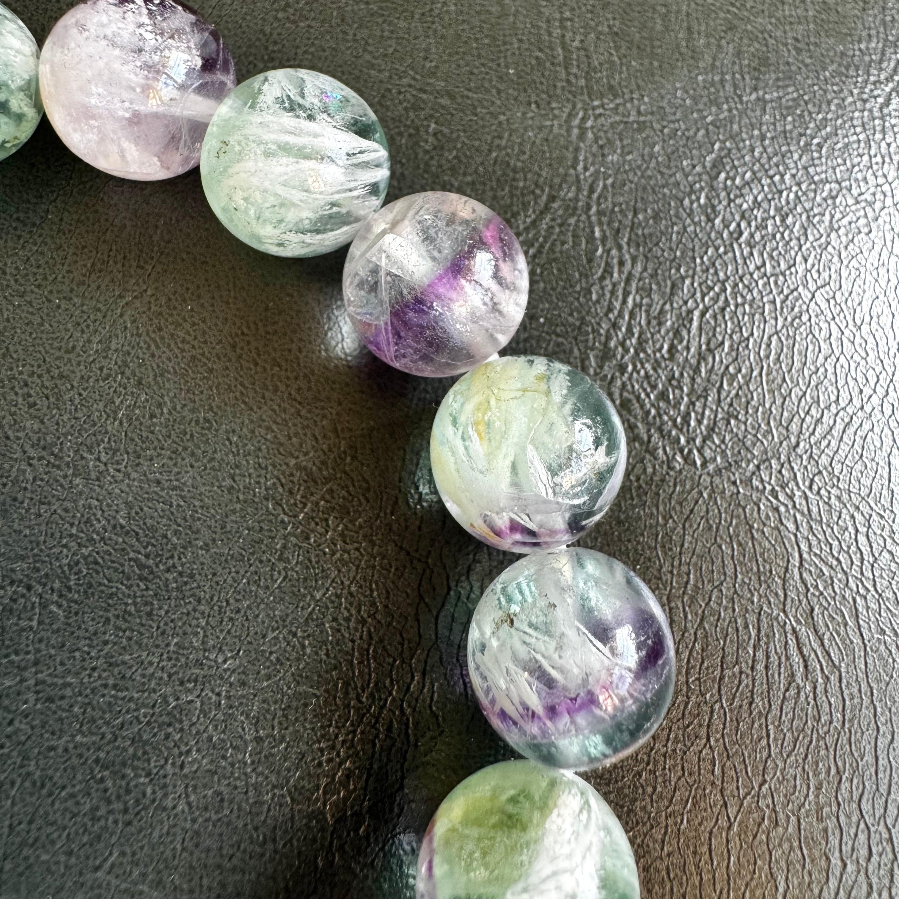 こちらは、透明度が高めのお品で薄いグリーンとパープルがメインの全体的にお色が明るめのブレスレットです
