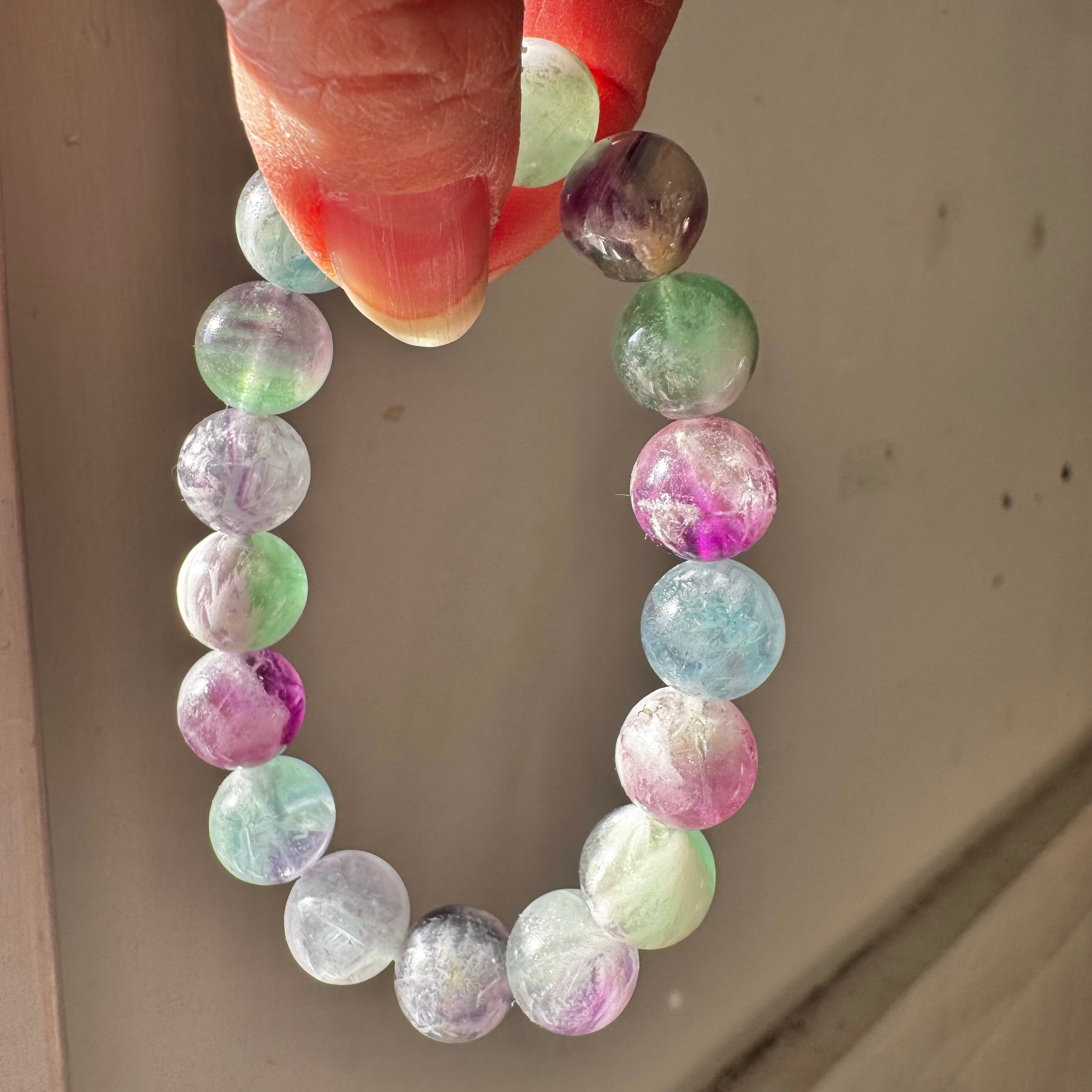 こちらは、内包物多めのお品でグリーンとパープルがメインのところに少しブルーが混ざっています