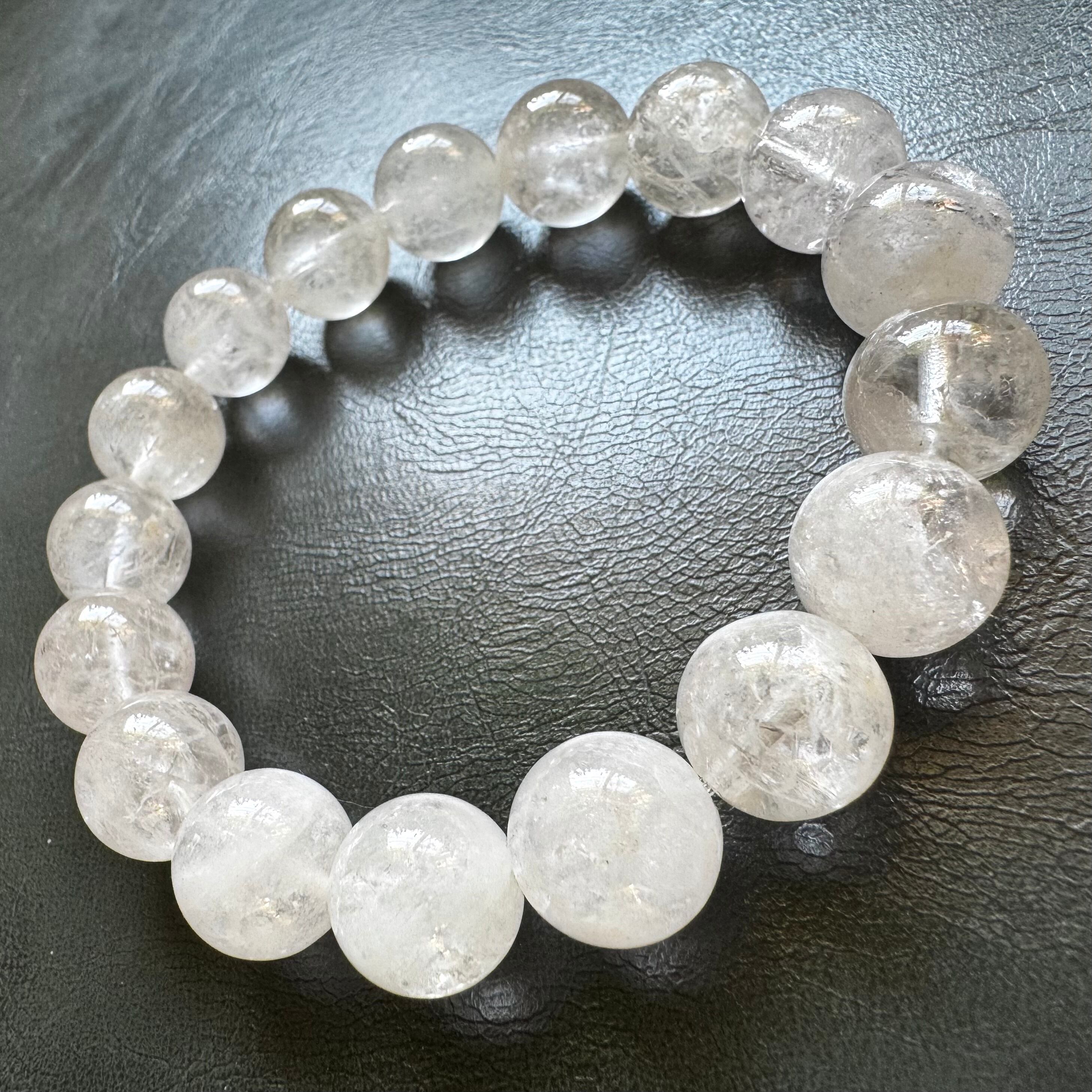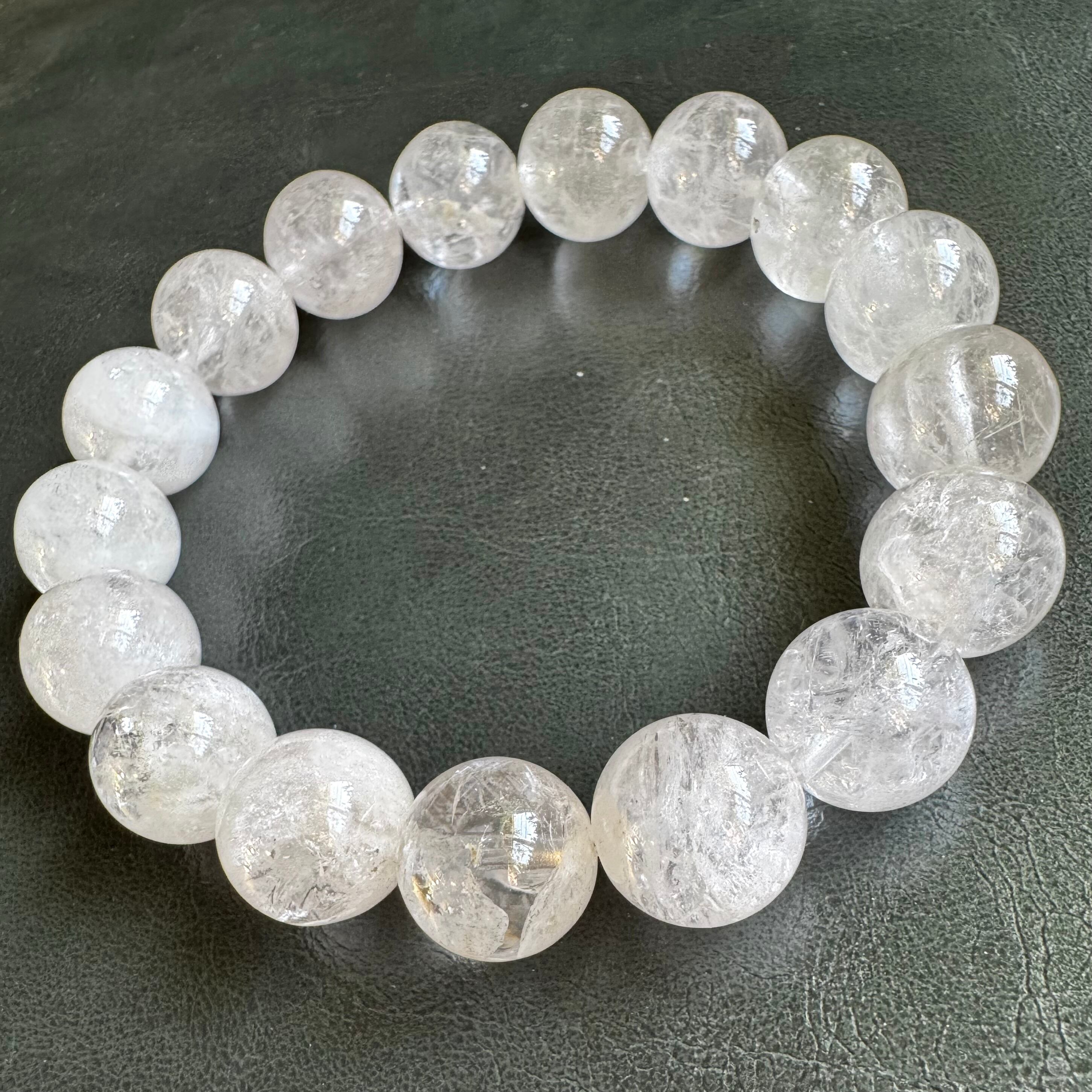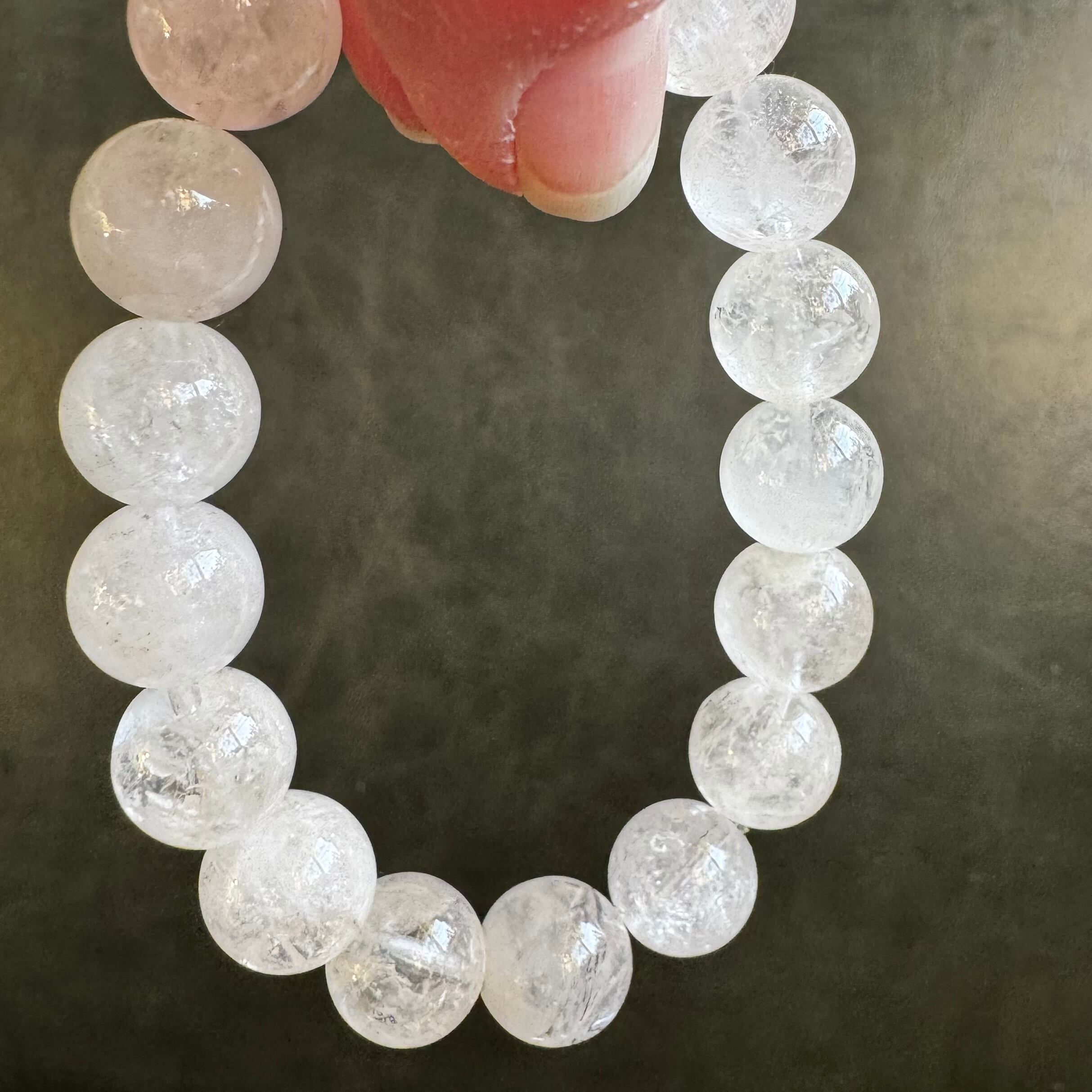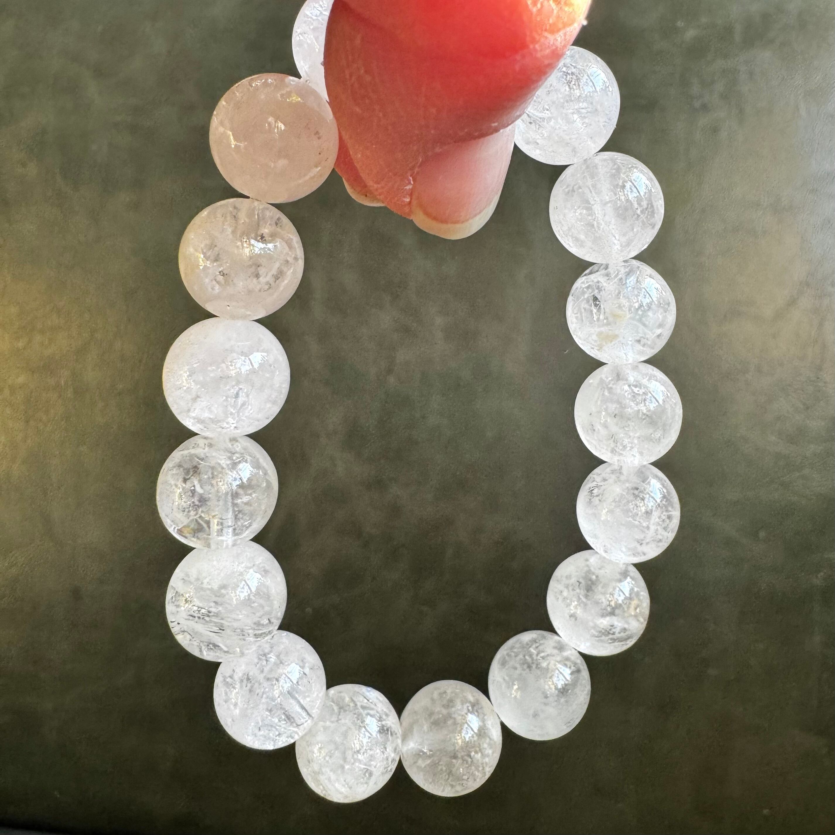 こちらのブレスレットは、お色味はなくホワイトとクリアが混ざった様な粒になります