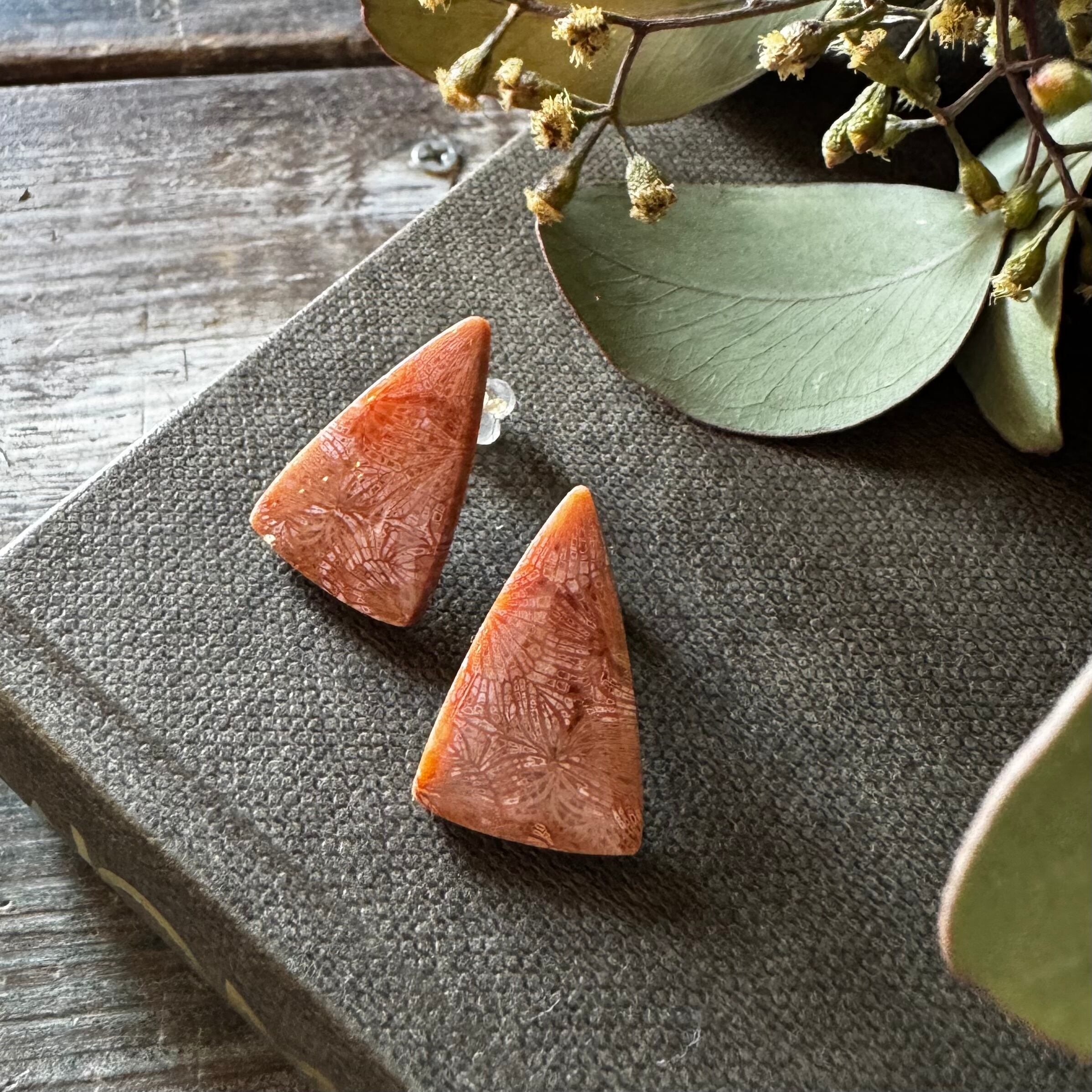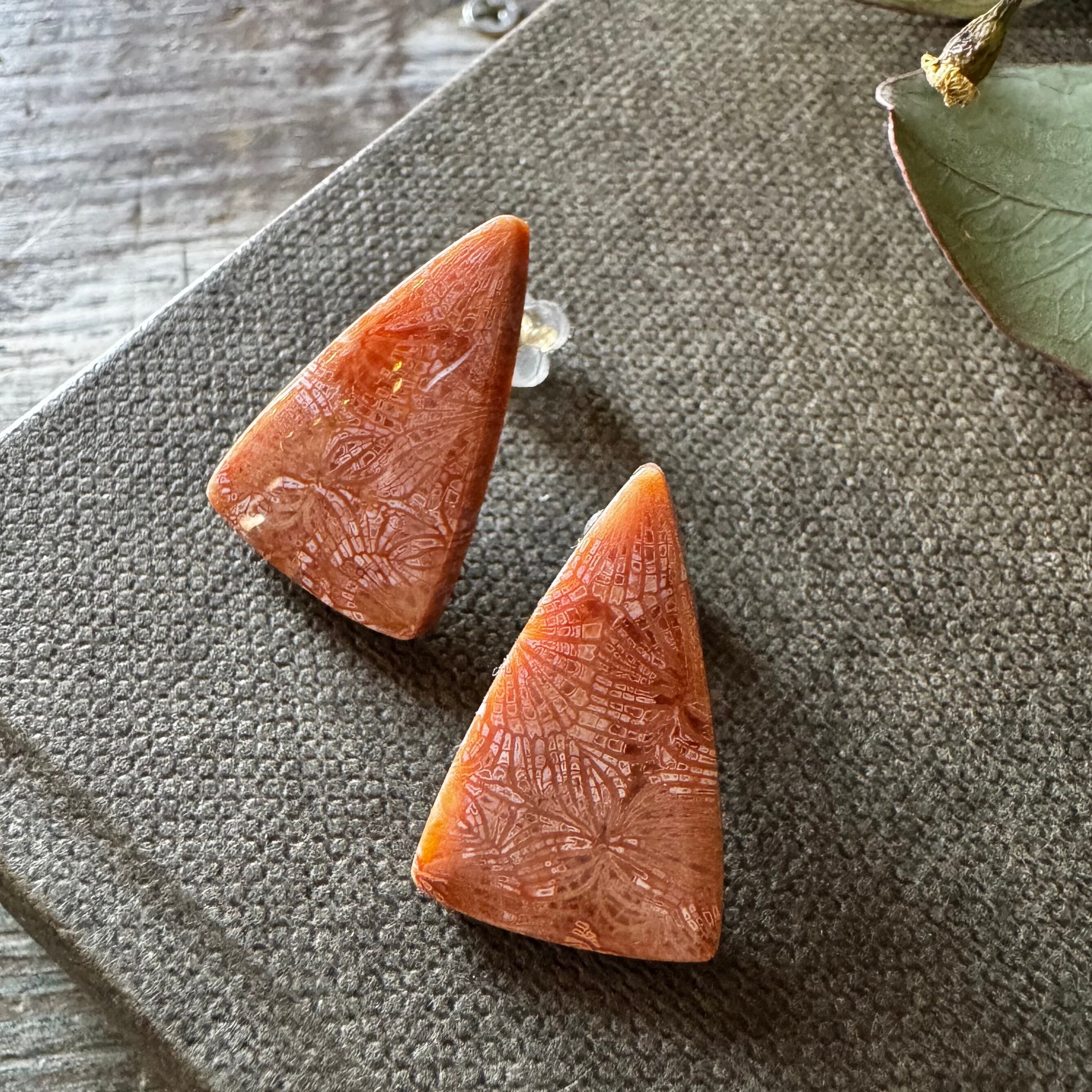 フォッシルコーラル*1粒ピアス・ピンク系三角(イヤリング不可)