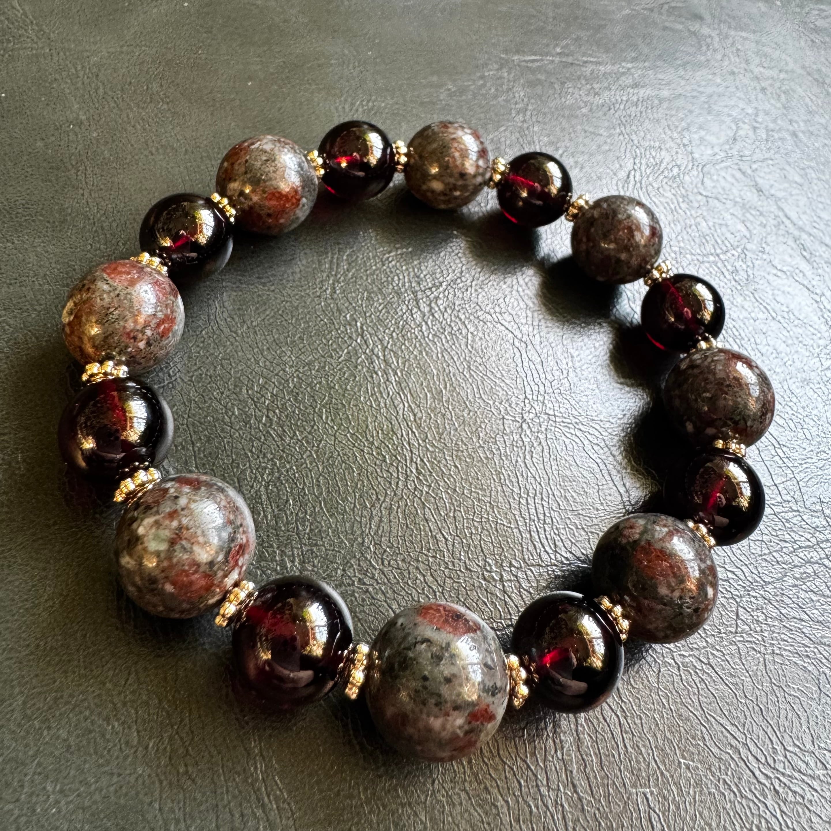 深いカーキ色に渋めの赤などが細かい模様の様に入った織姫ガーネットと、深い赤色のガーネットを交互に配置したブレスレットです