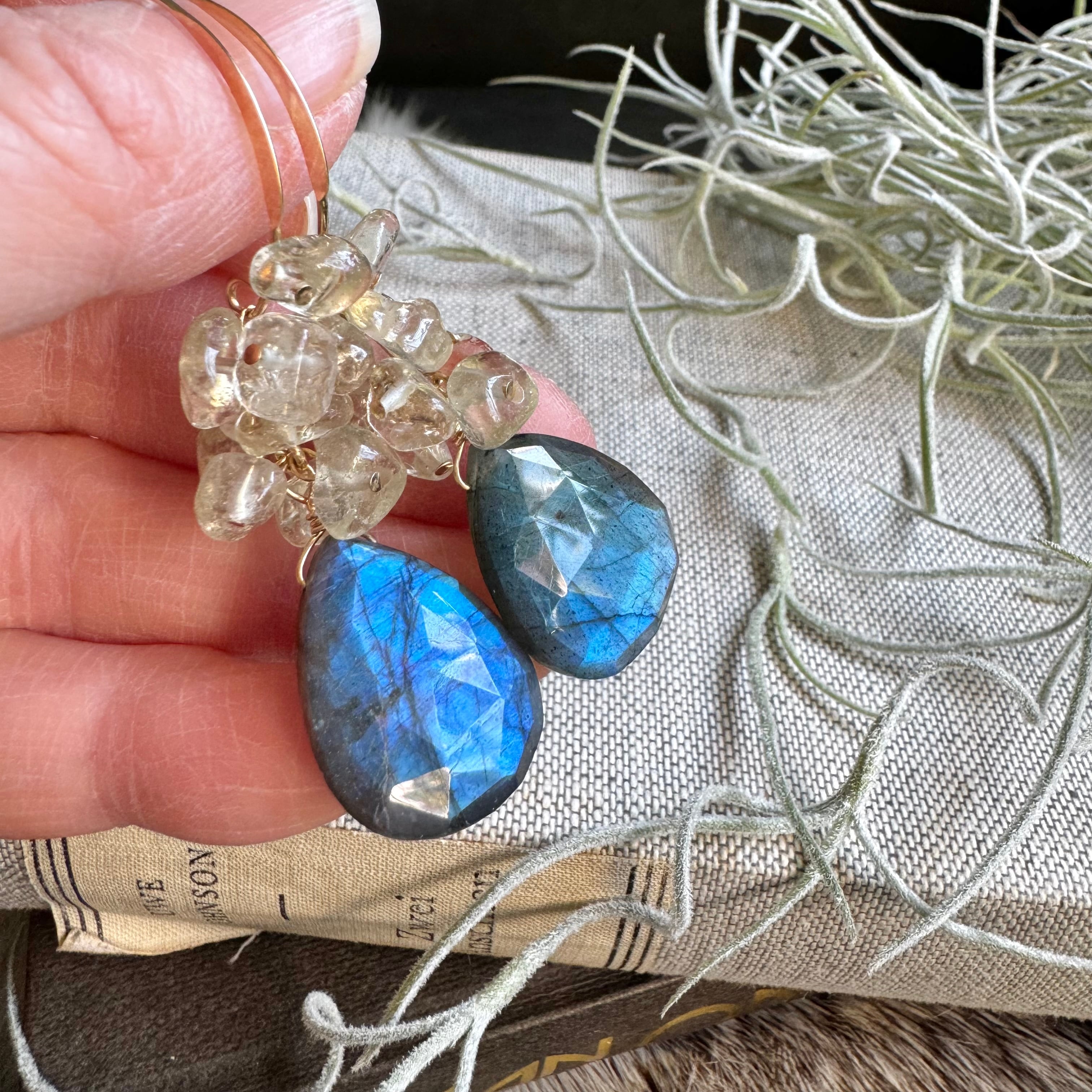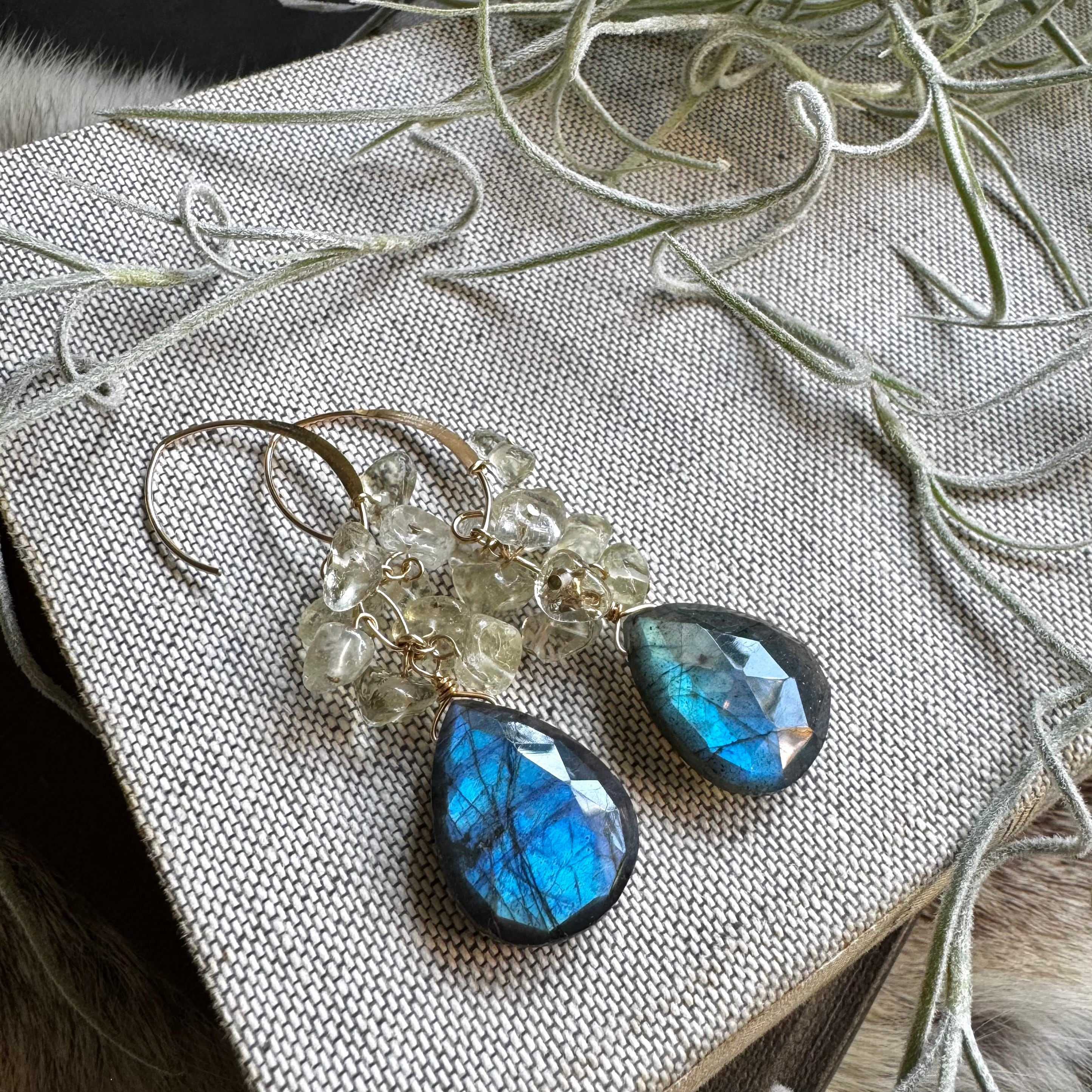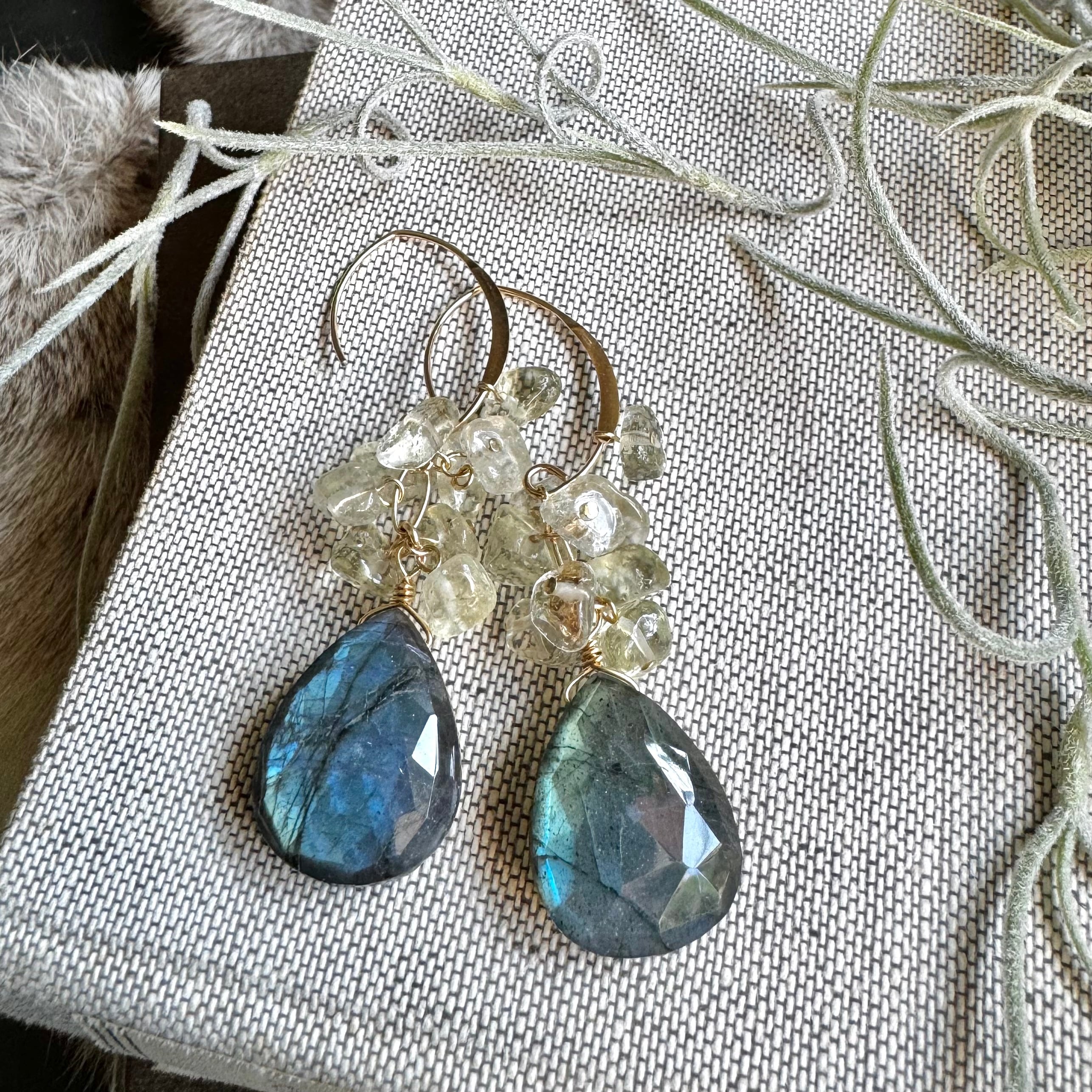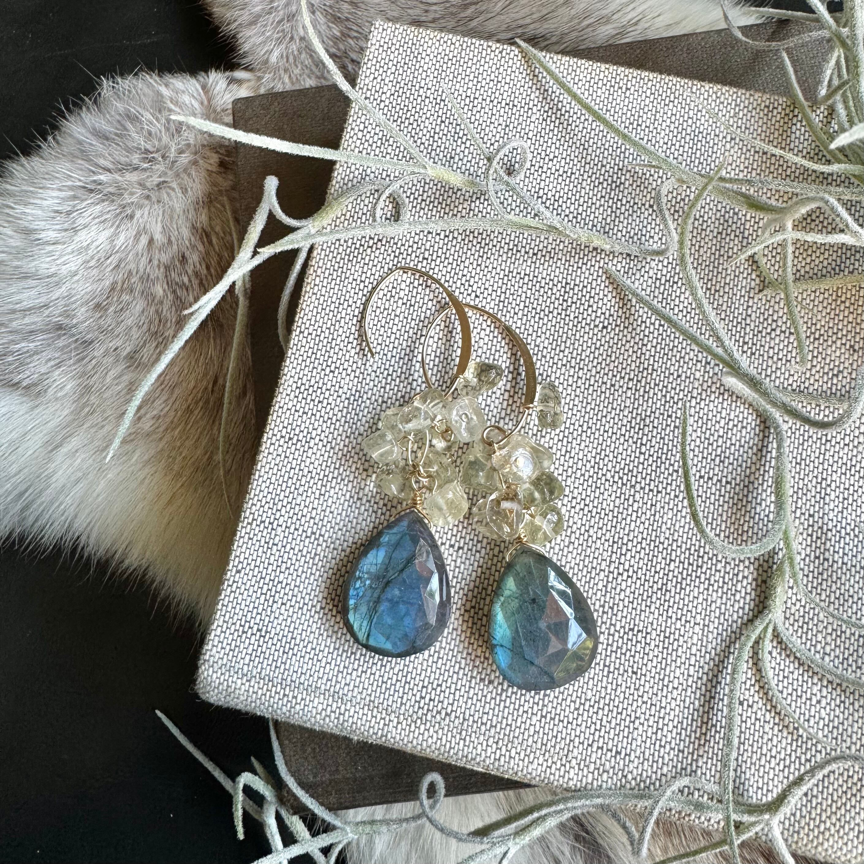 ラブラドライト&リビアングラスピアス(イヤリング)・大粒デザインフック