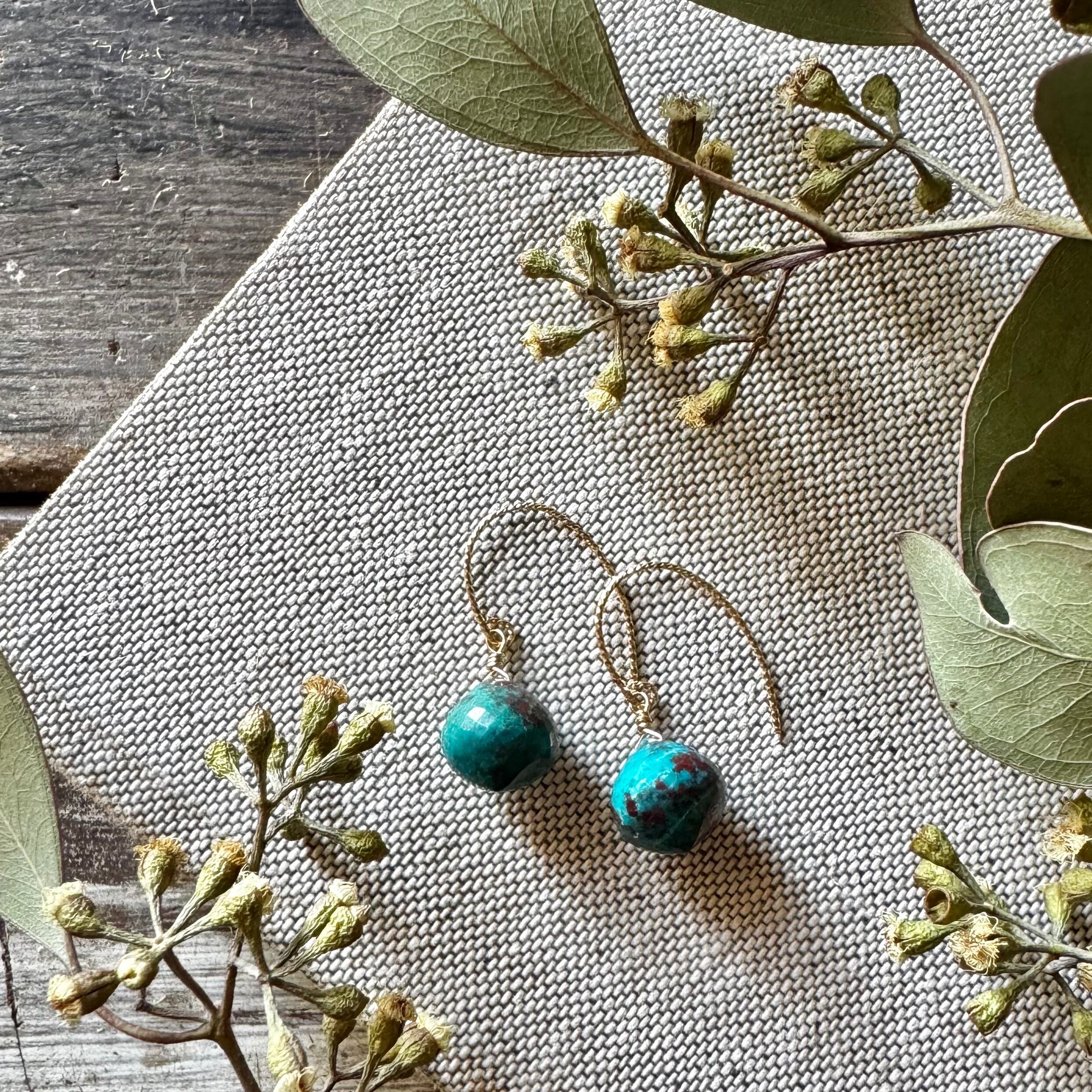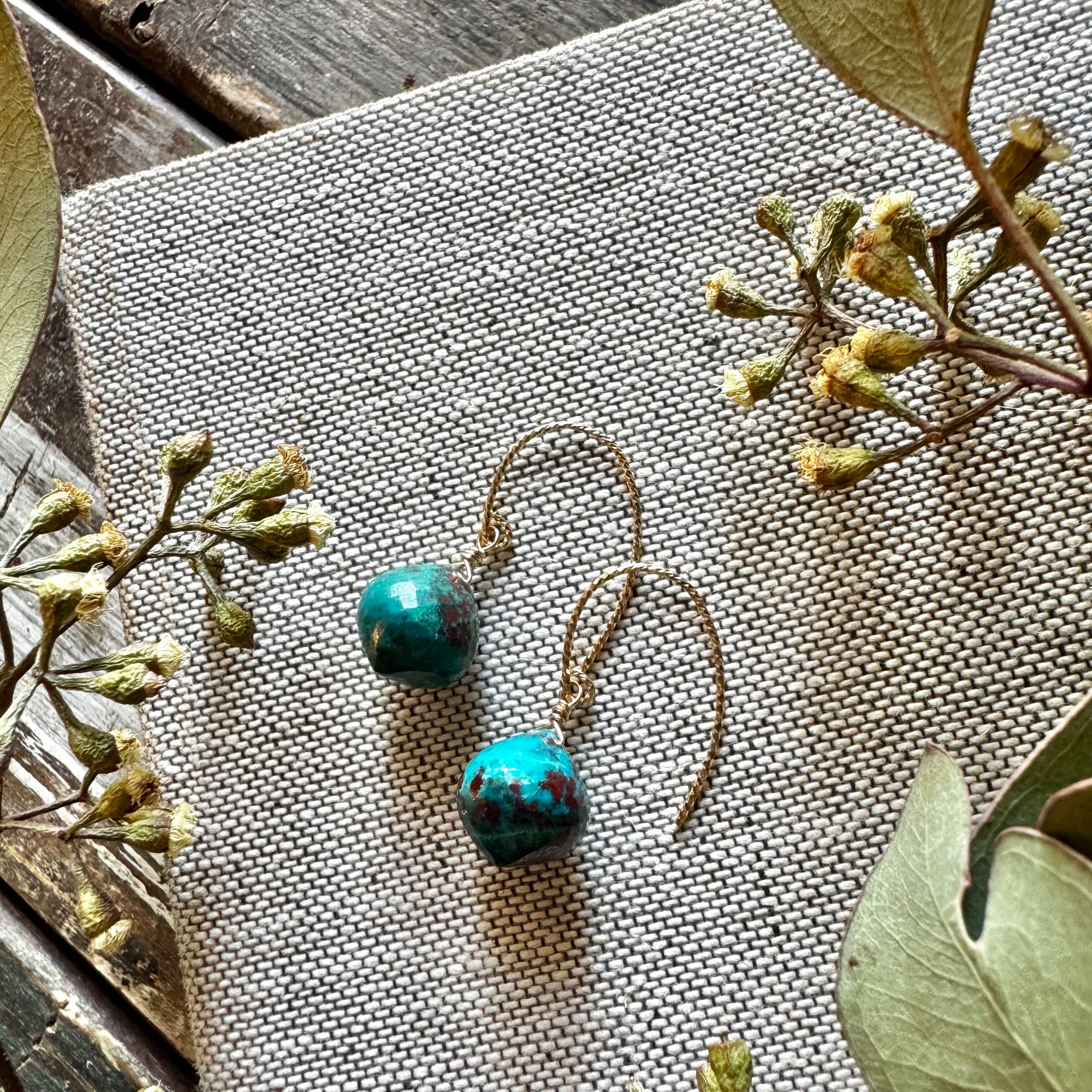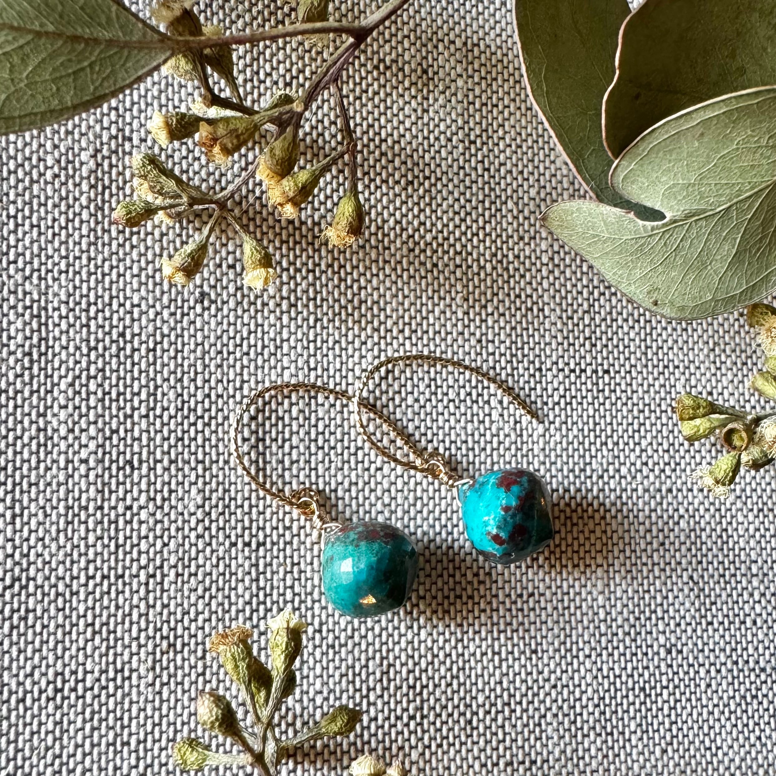 クリソコラは、ブルーやグリーンにブラウンやブラックが混ざった地球の様な色合いの石です