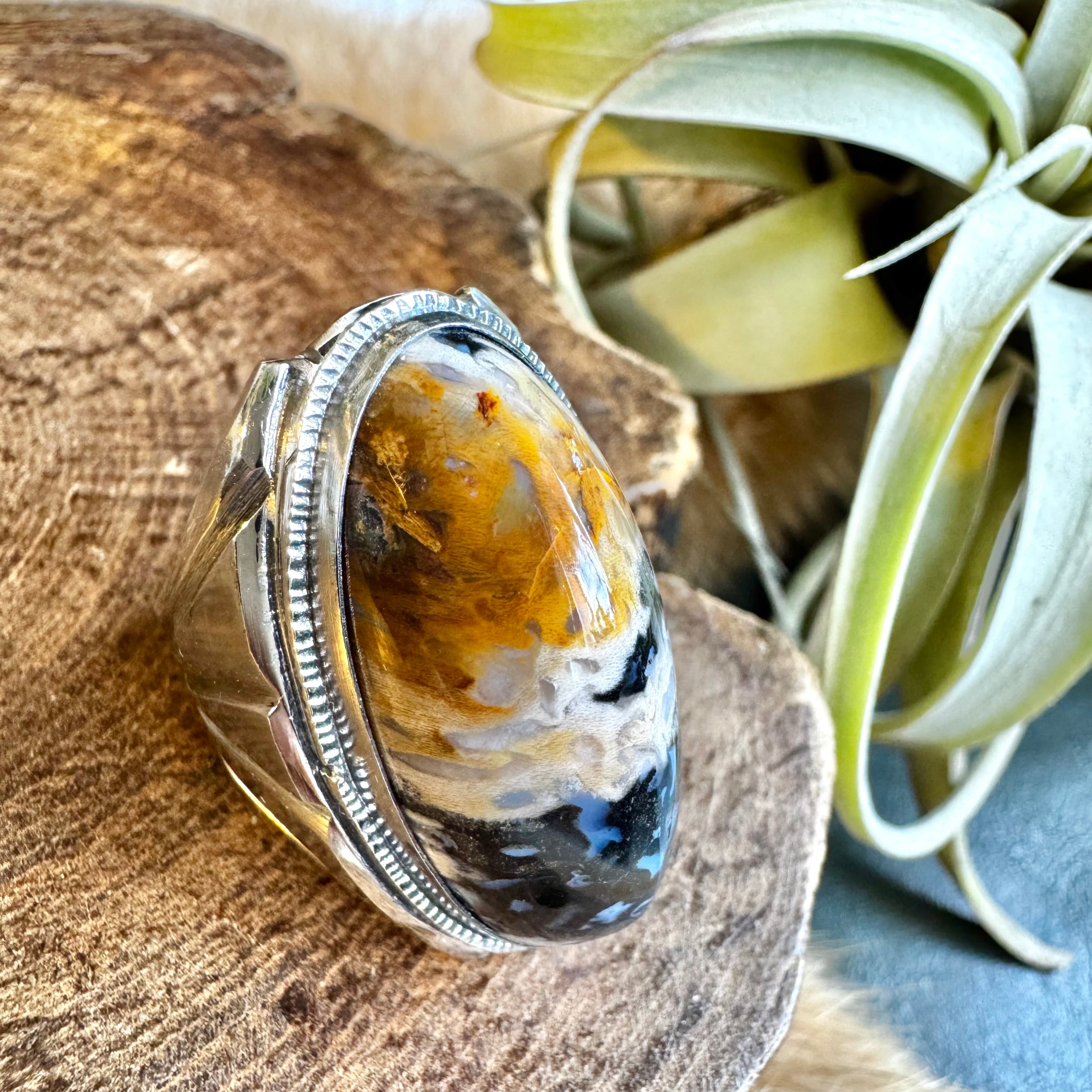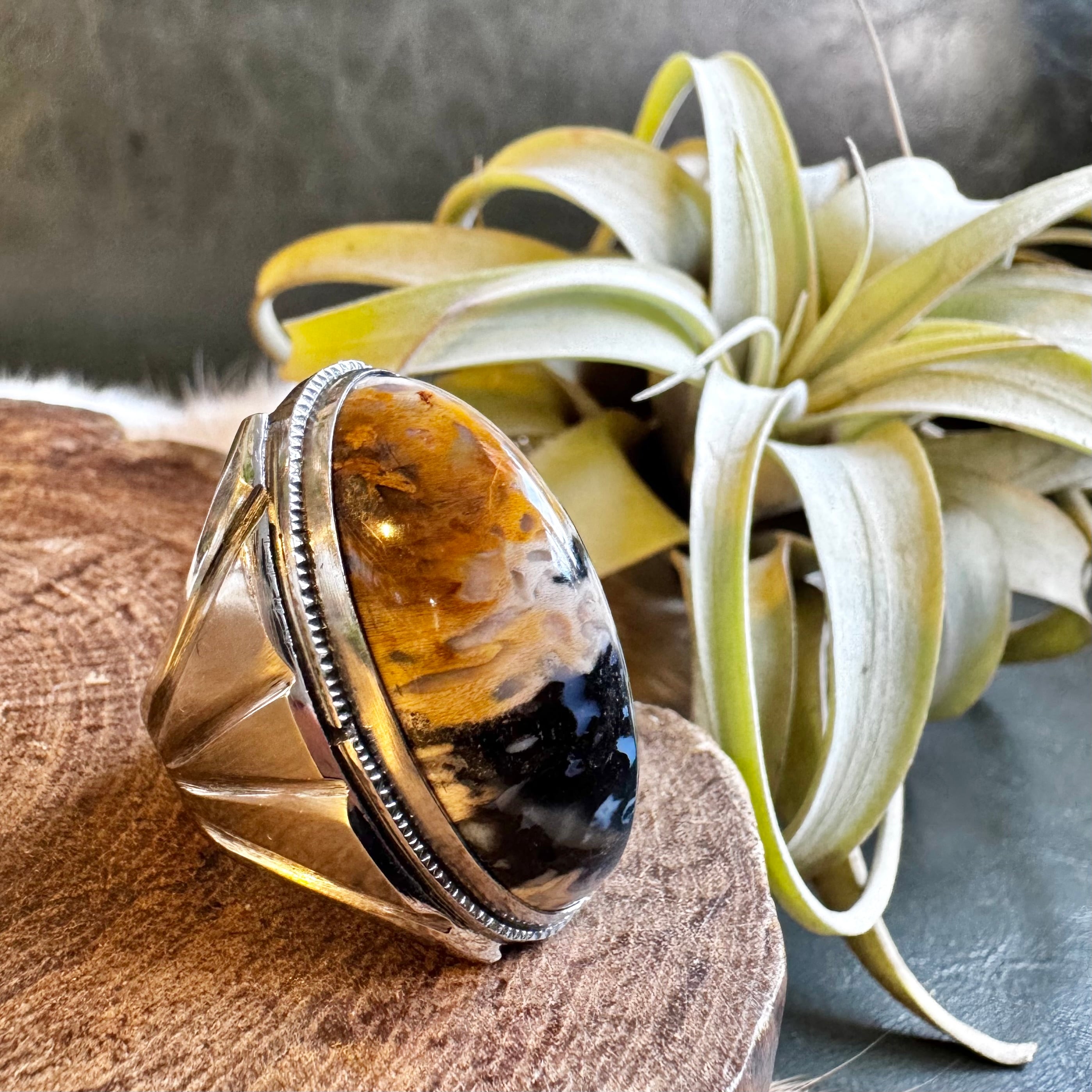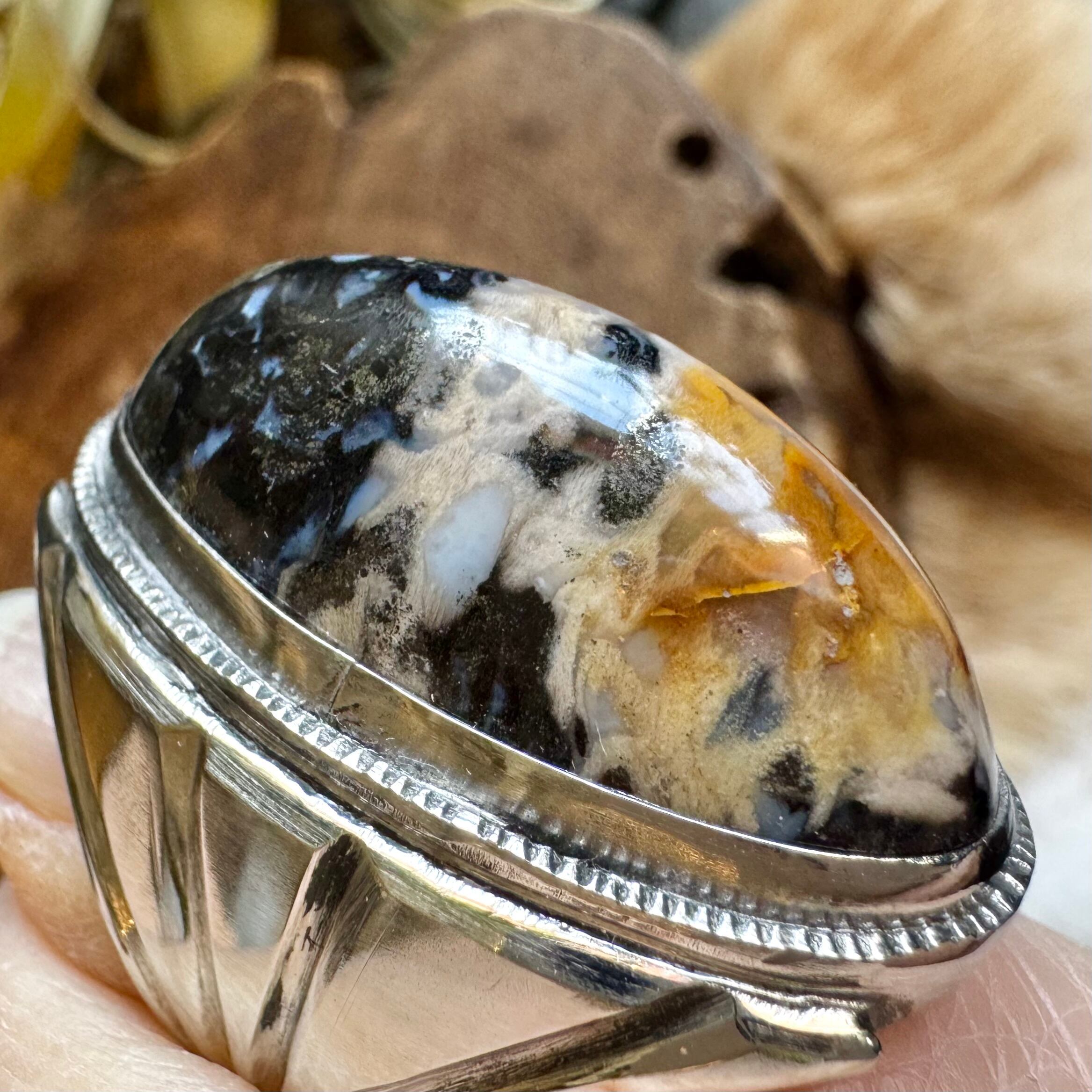 こちらの石は、キャメルからベージュ、ブラックとお色が層の様になっており、とても雰囲気のあるお品です