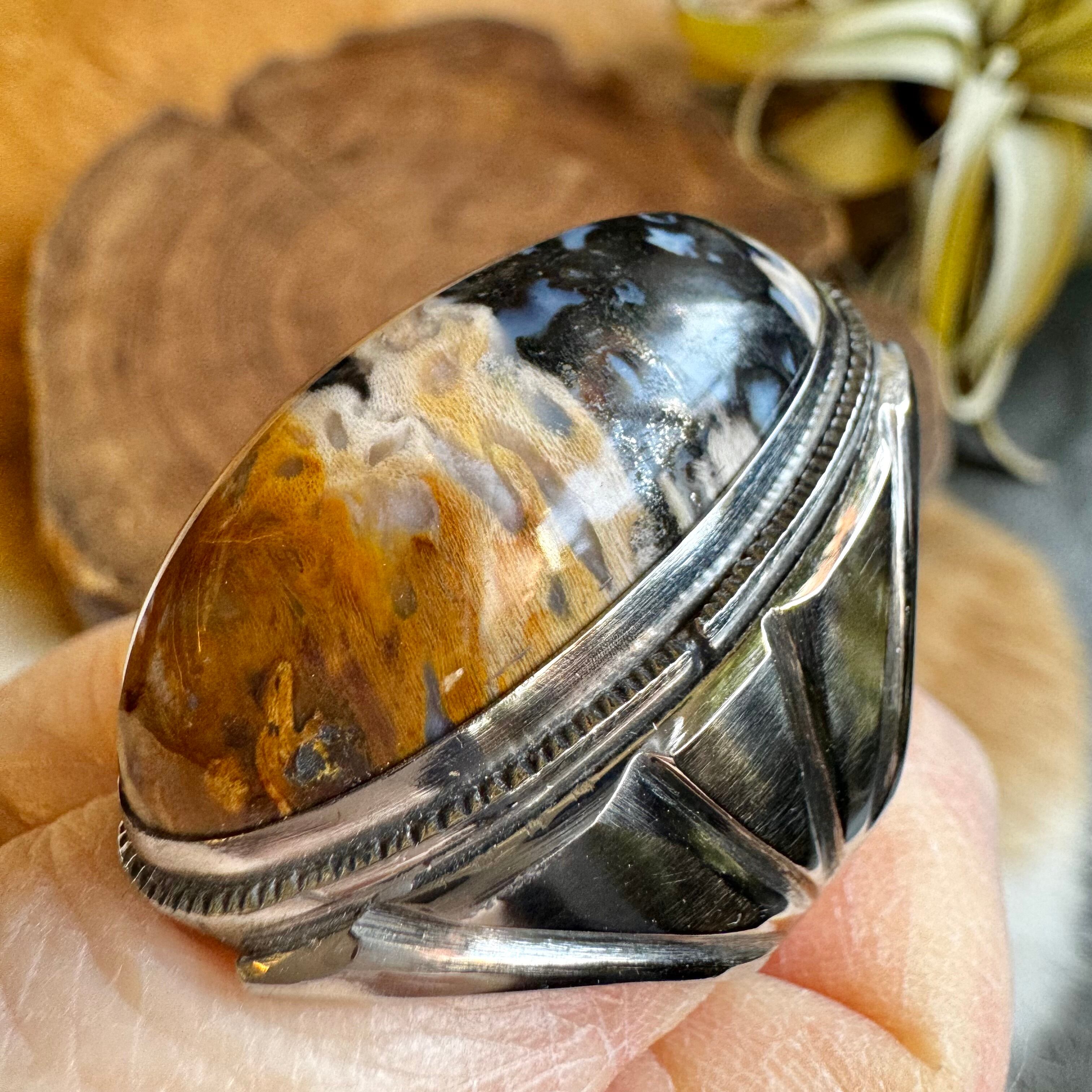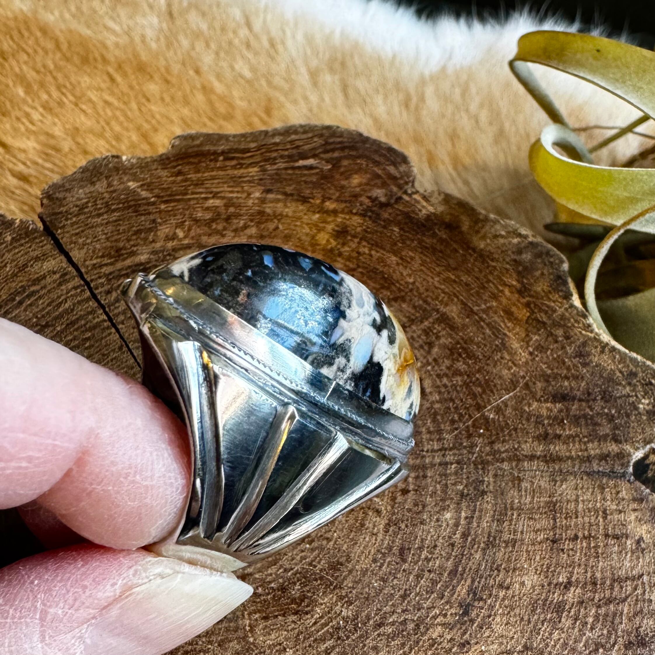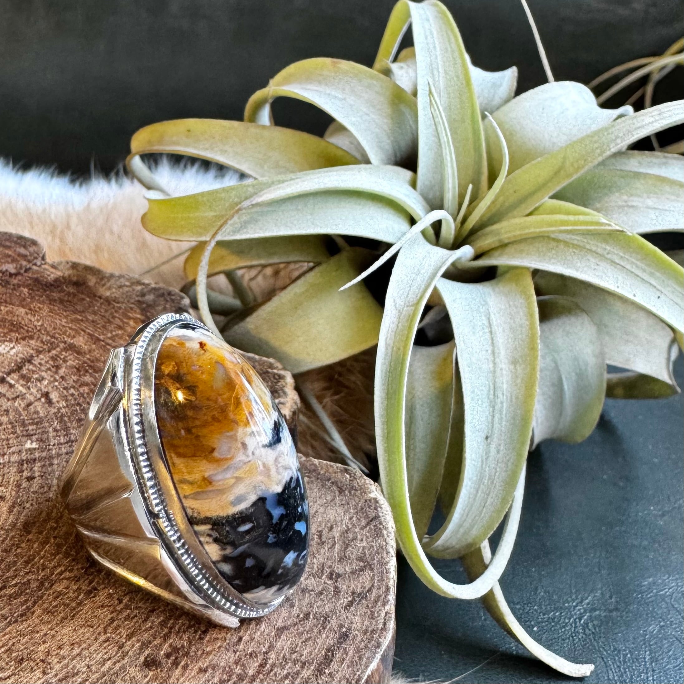 こちらの石は、キャメルからベージュ、ブラックとお色が層の様になっており、とても雰囲気のあるお品です