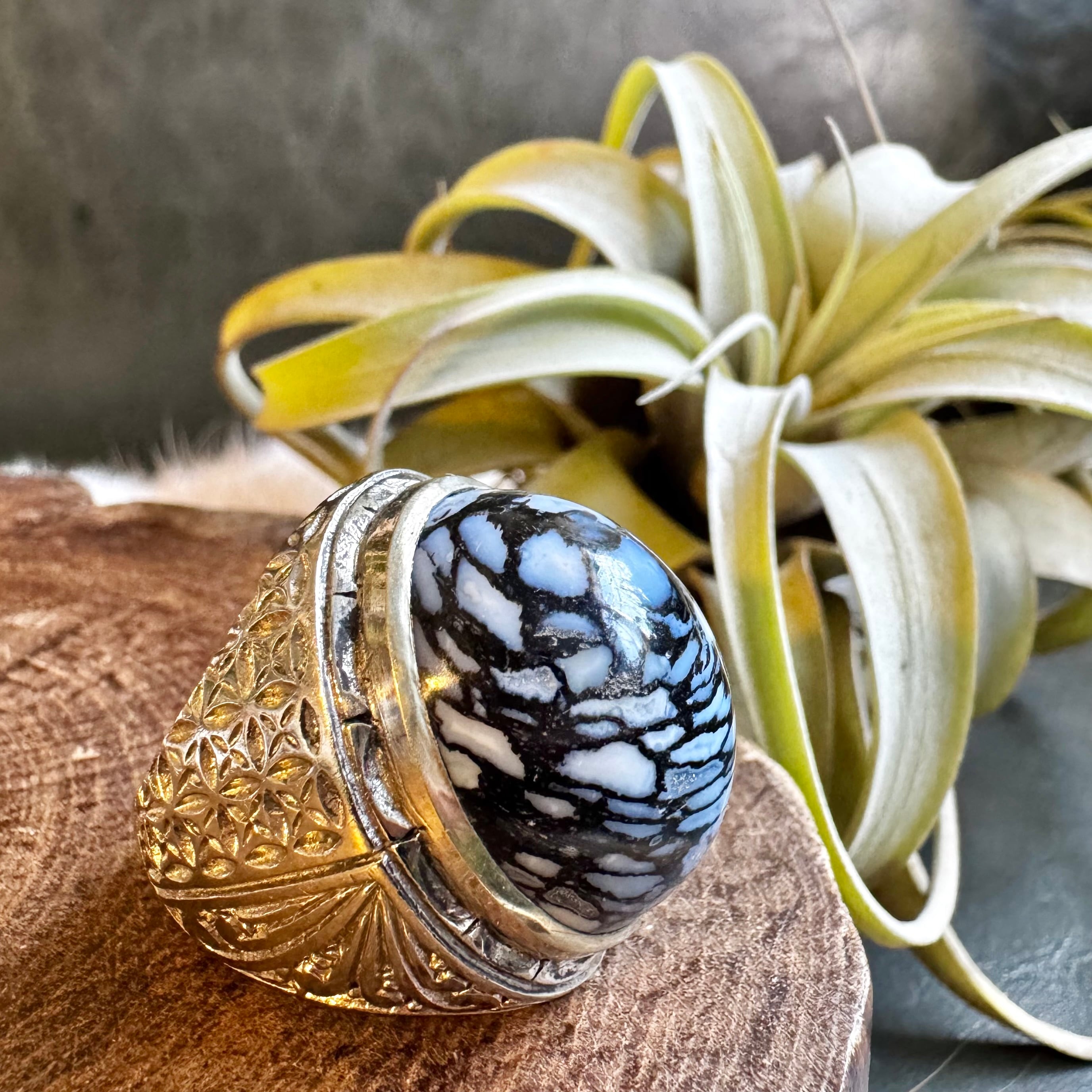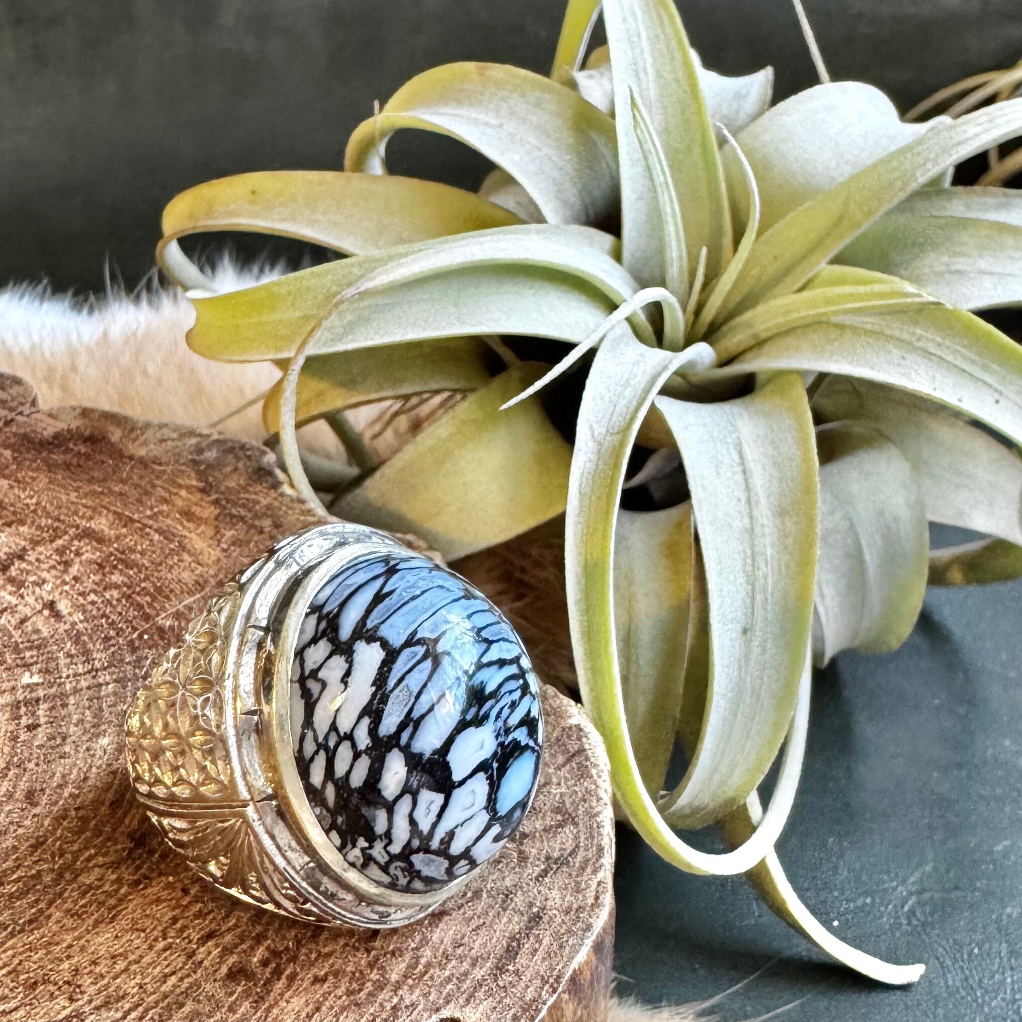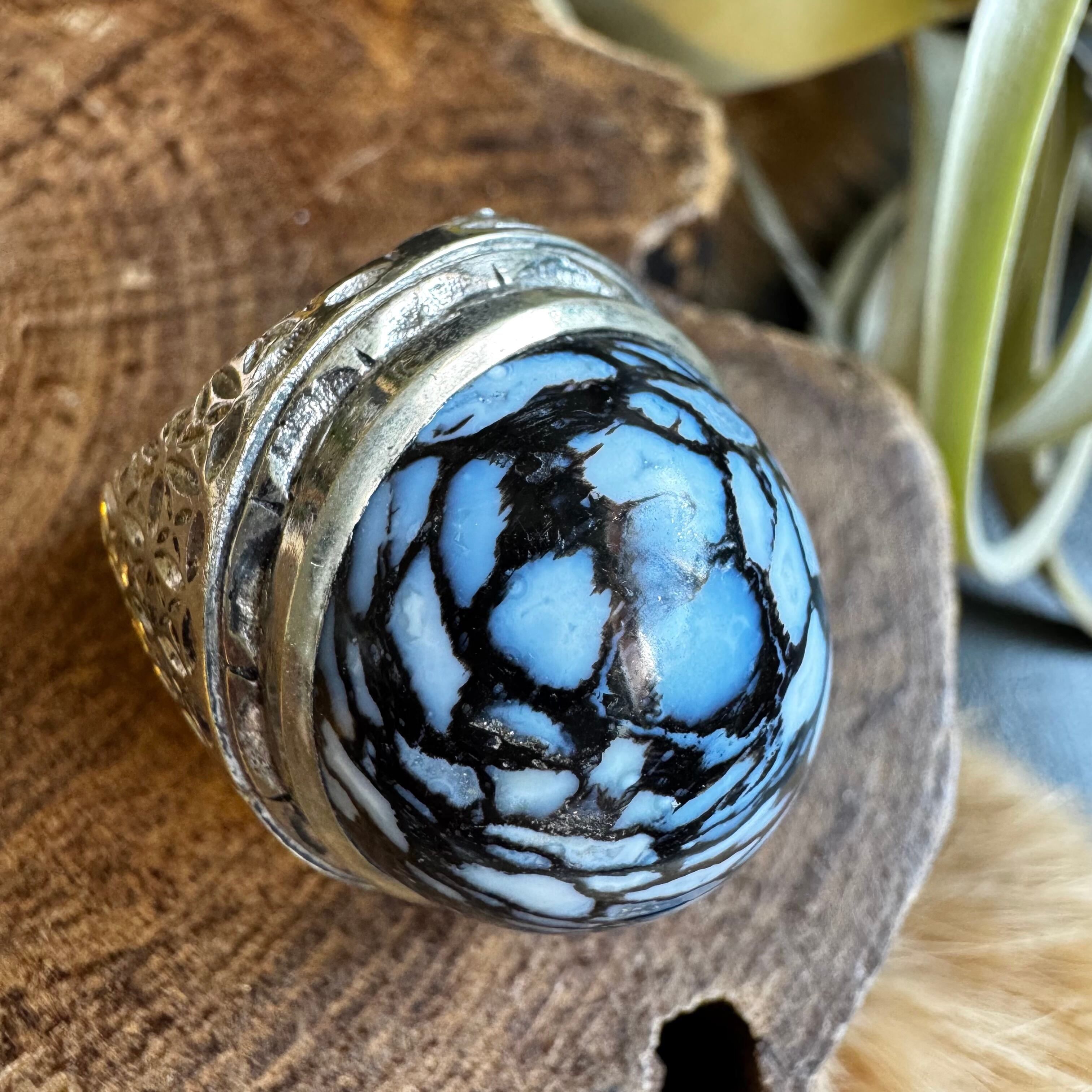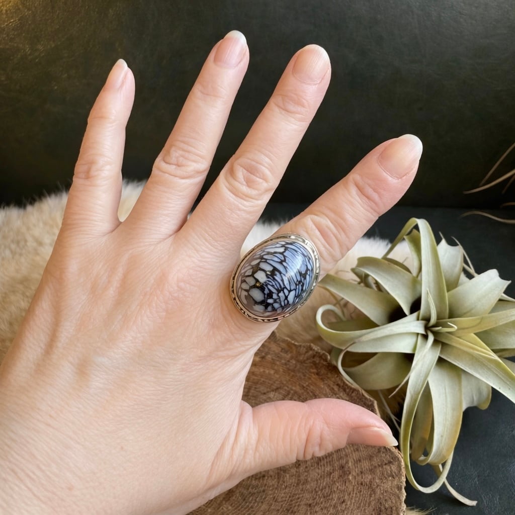 こちらの石は、ブラックベースで間に模様が透け感のある青白いお色のため、蝶の羽のようでとても雰囲気のあるお品です