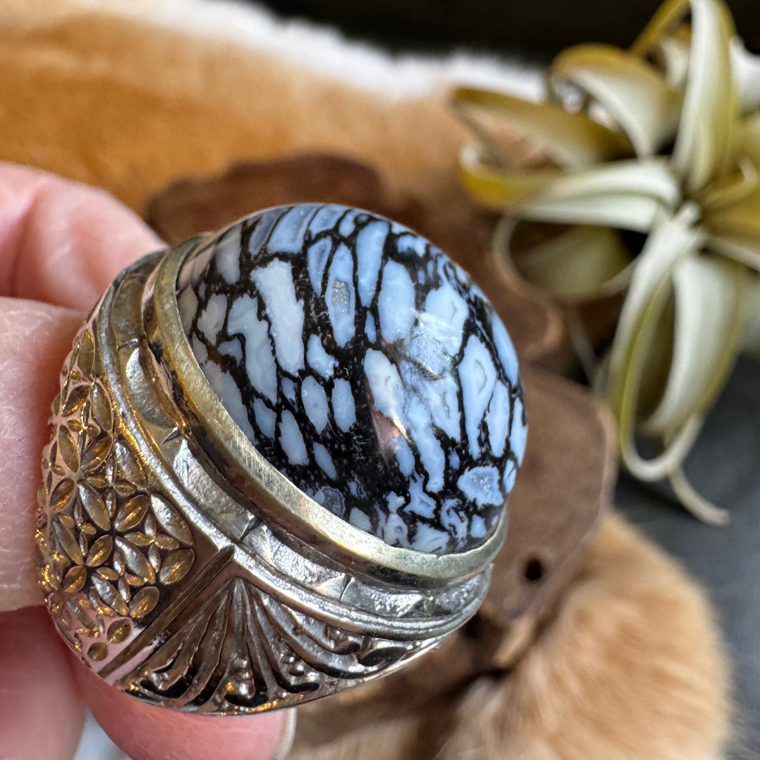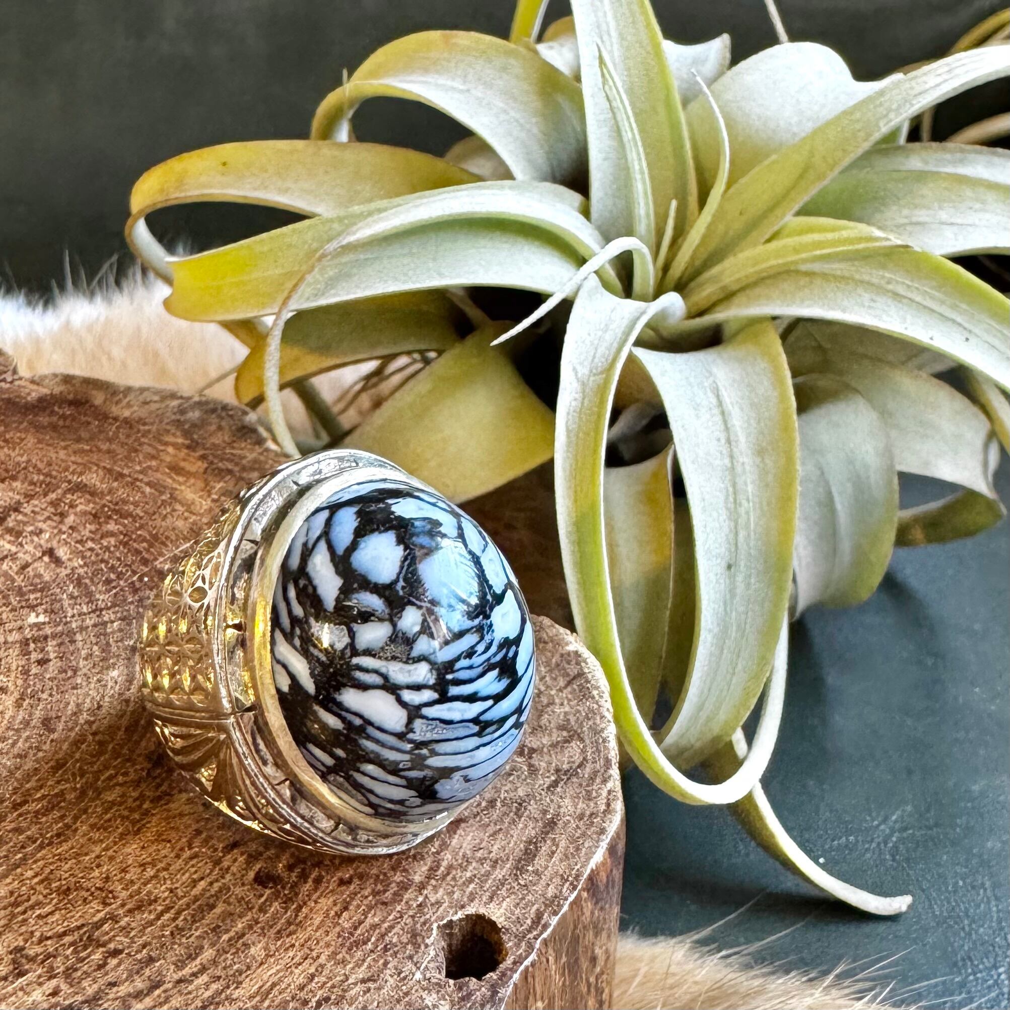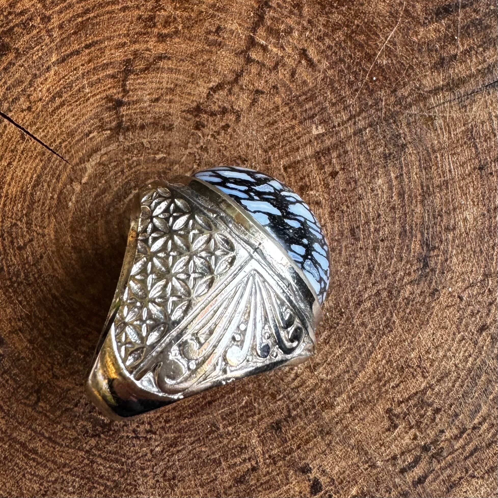 こちらの石は、ブラックベースで間に模様が透け感のある青白いお色のため、蝶の羽のようでとても雰囲気のあるお品です