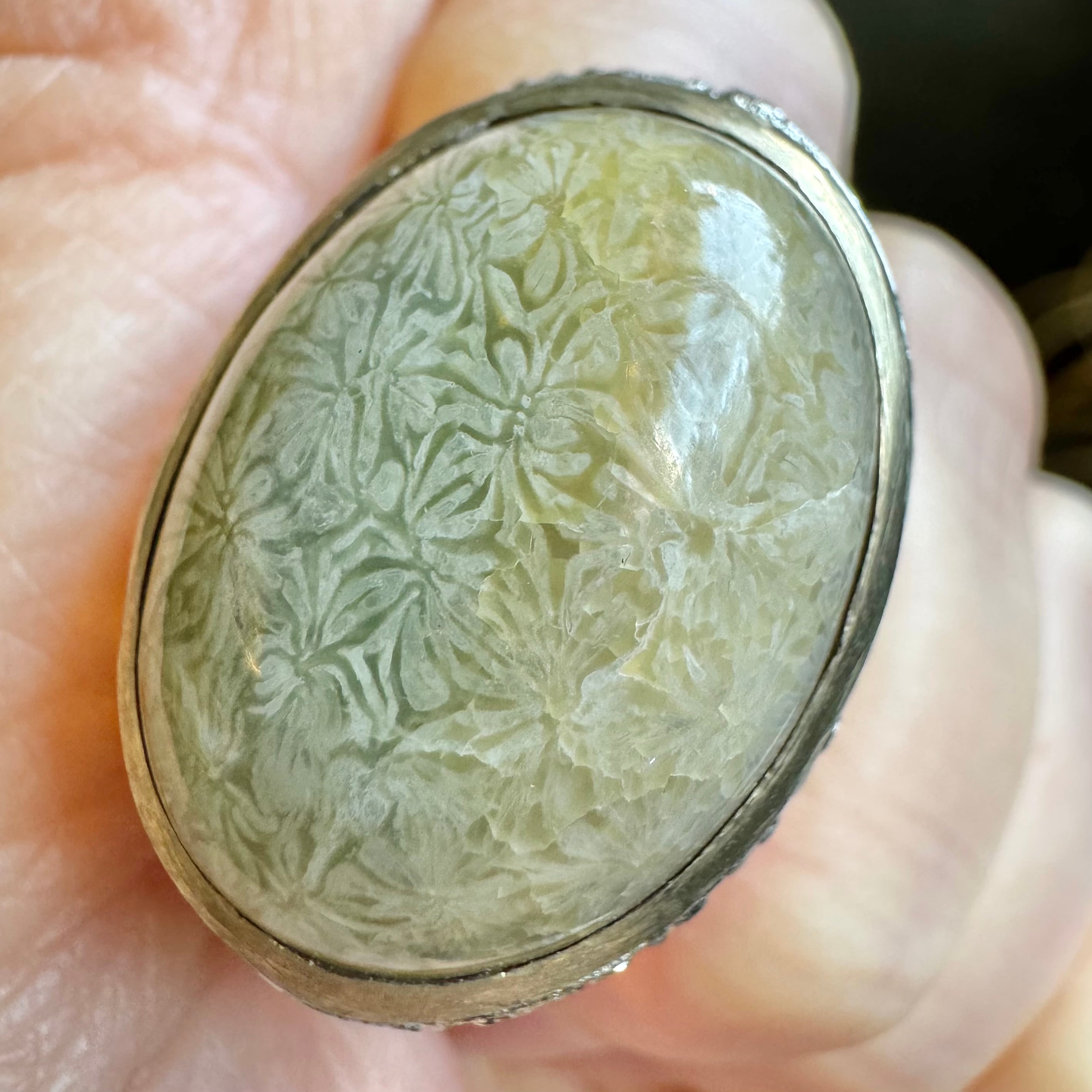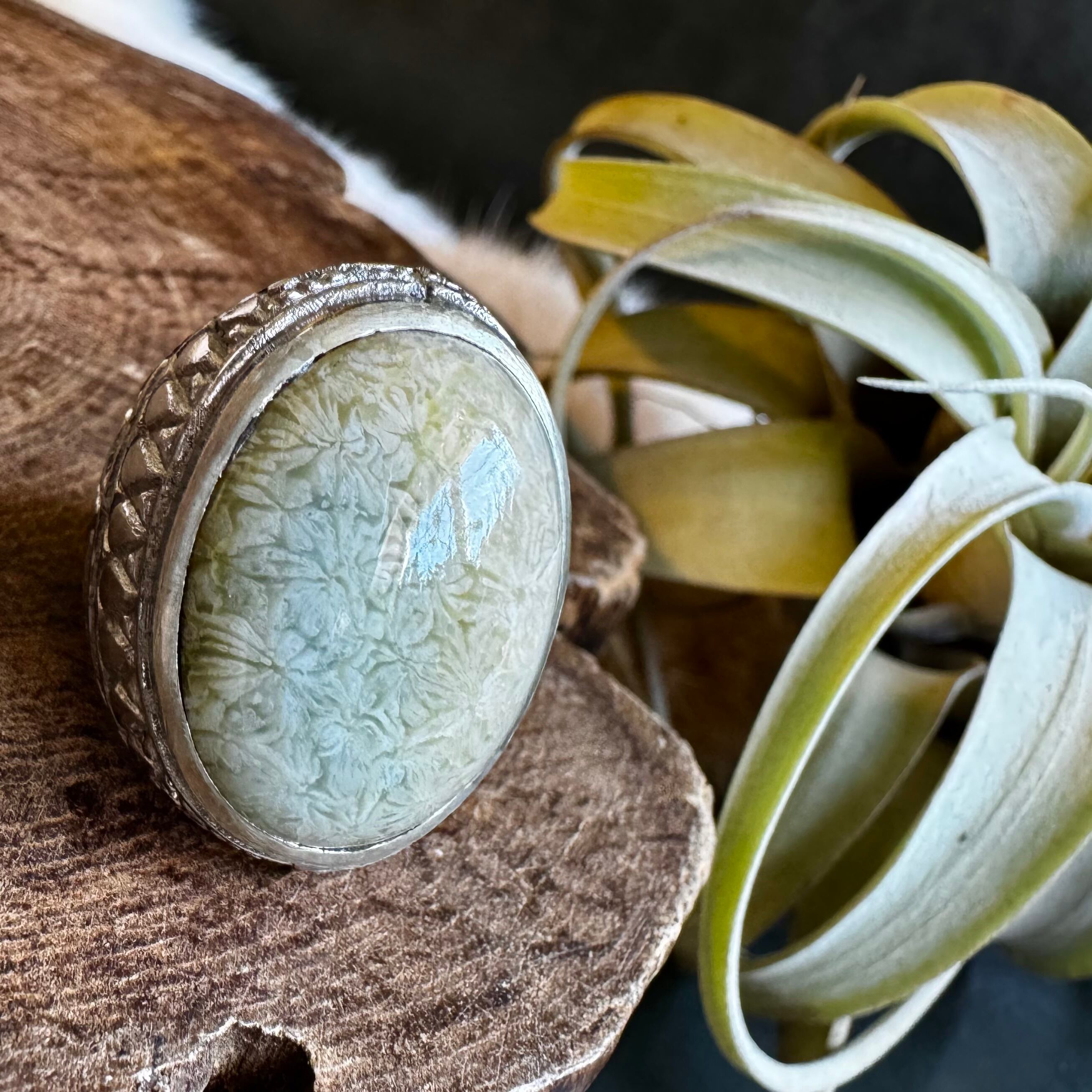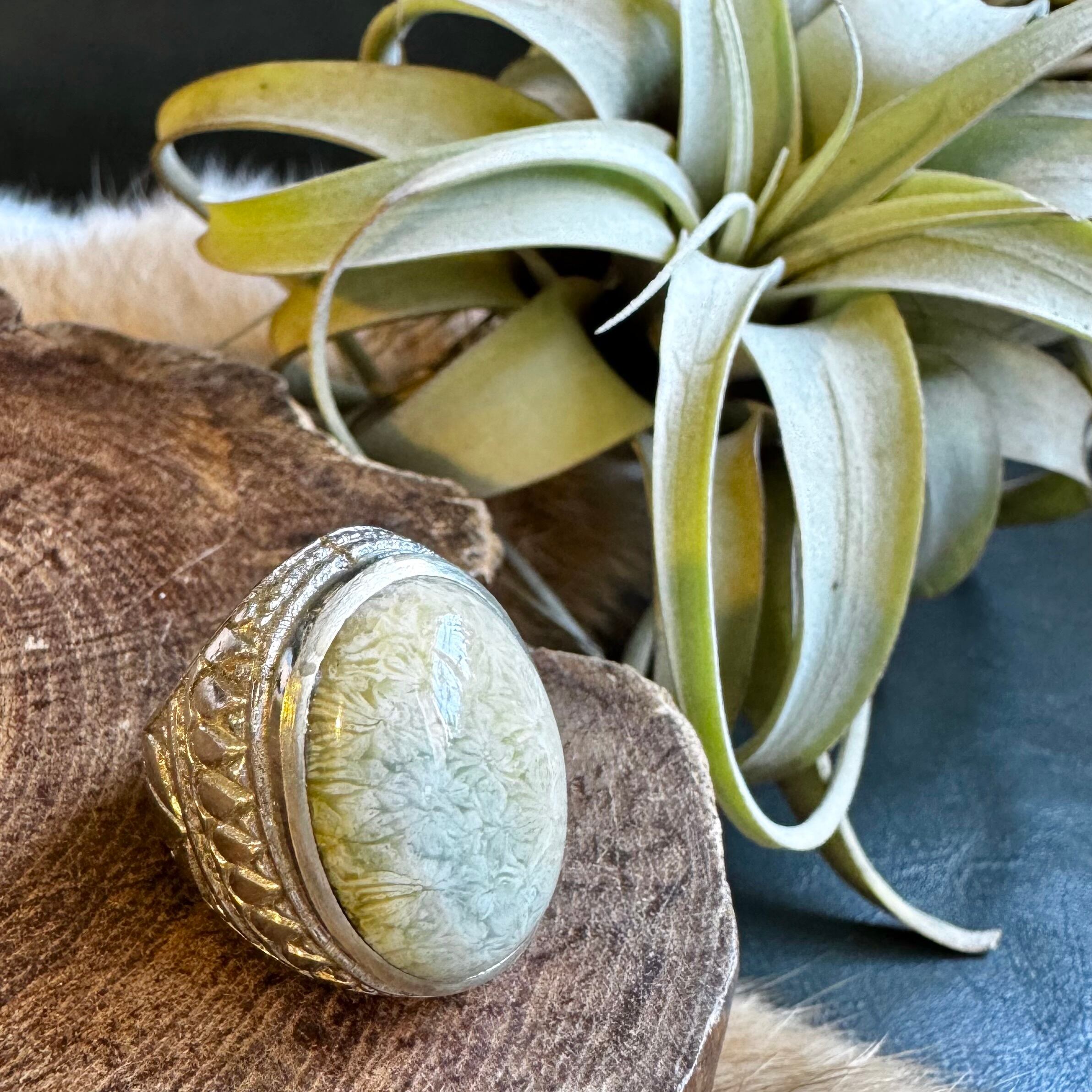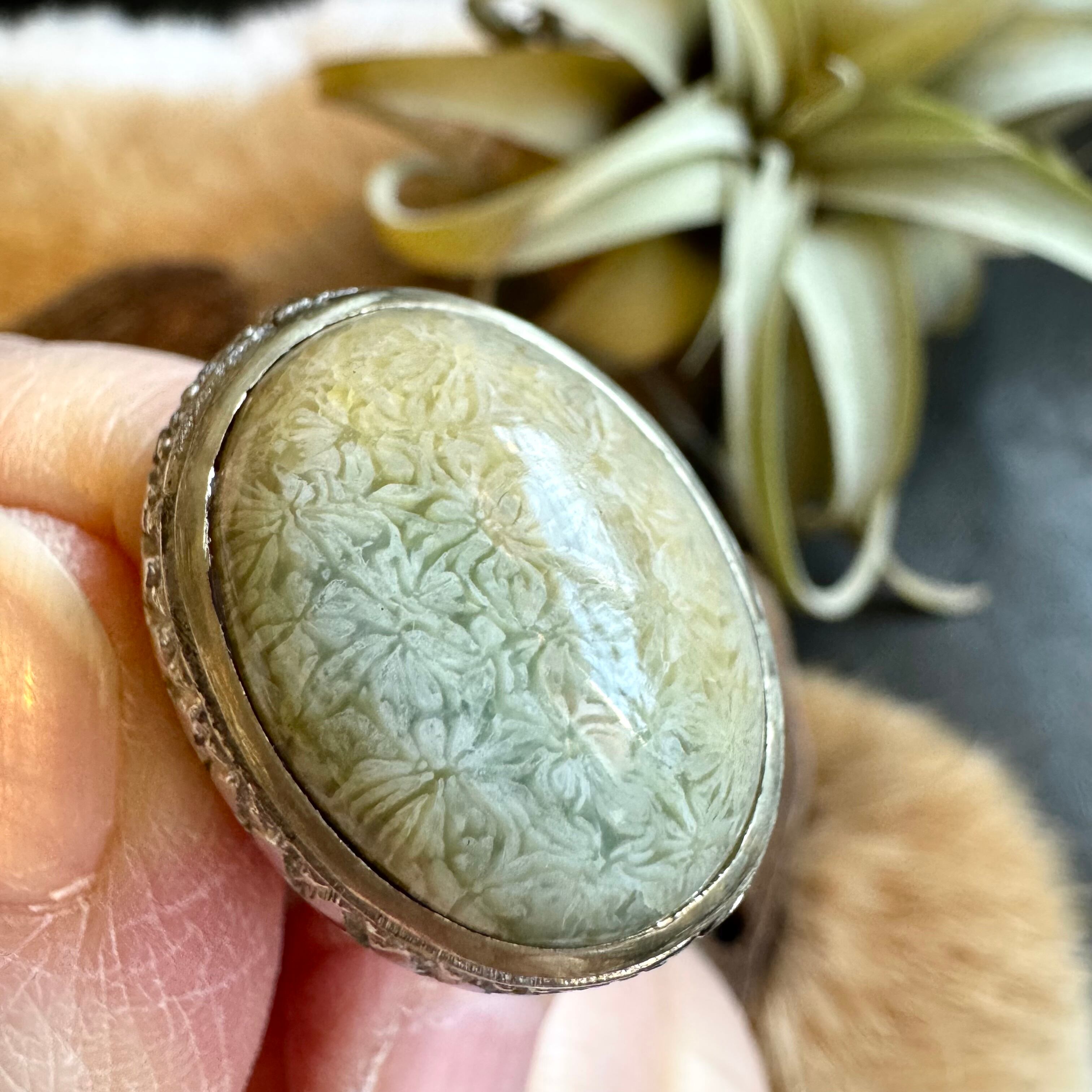 フォッシルコーラル*アルパカリングNo.3(大粒ライトグリーン花柄)