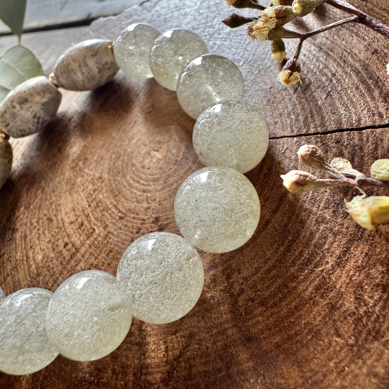 丸玉のブレスレットの場合は、いろいろな模様が見えるため、ひとつひとつ柄が違い面白いです