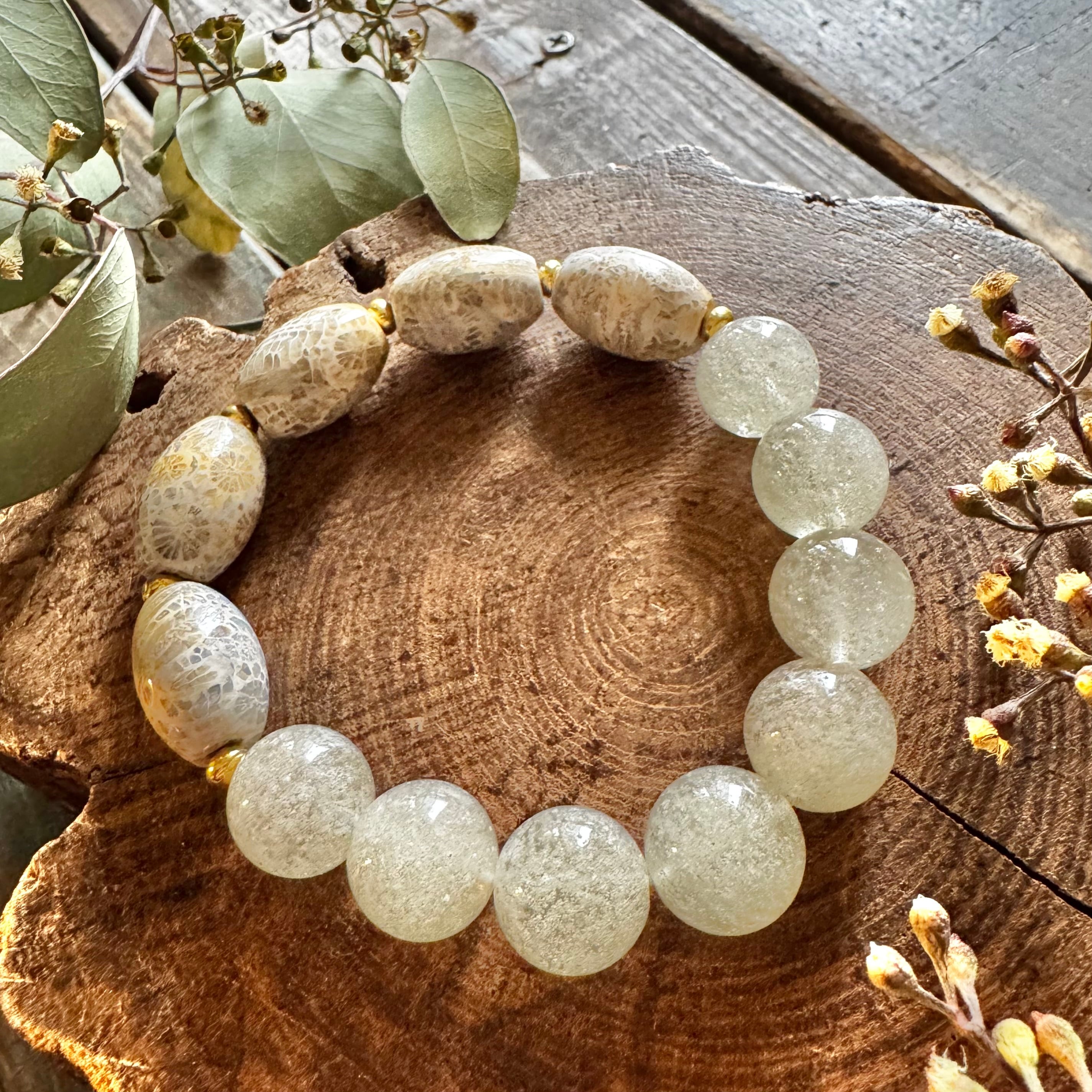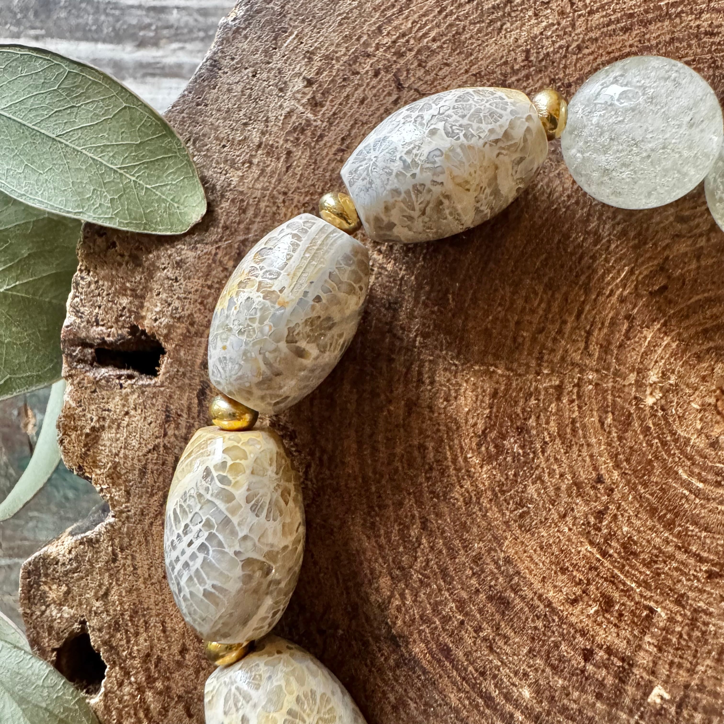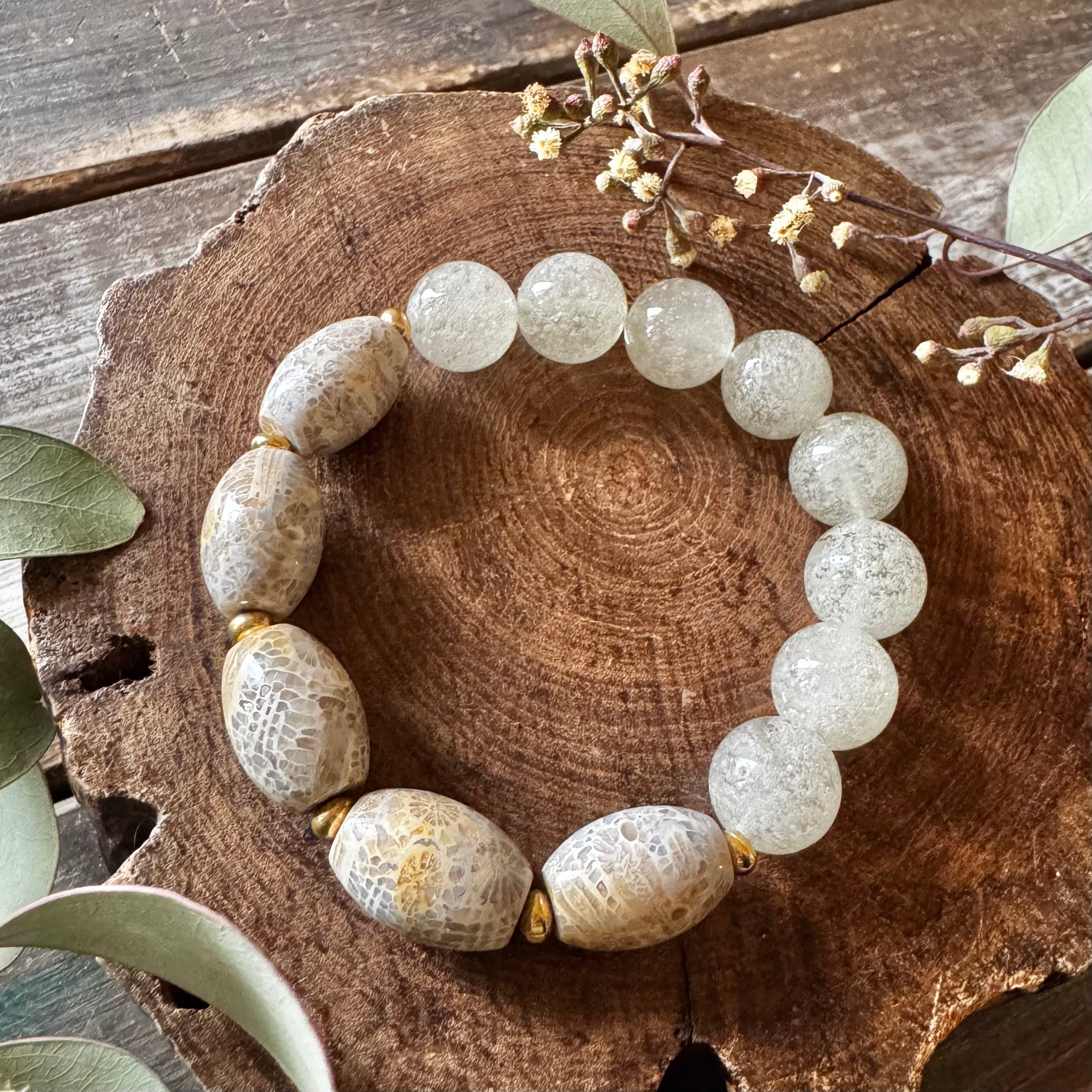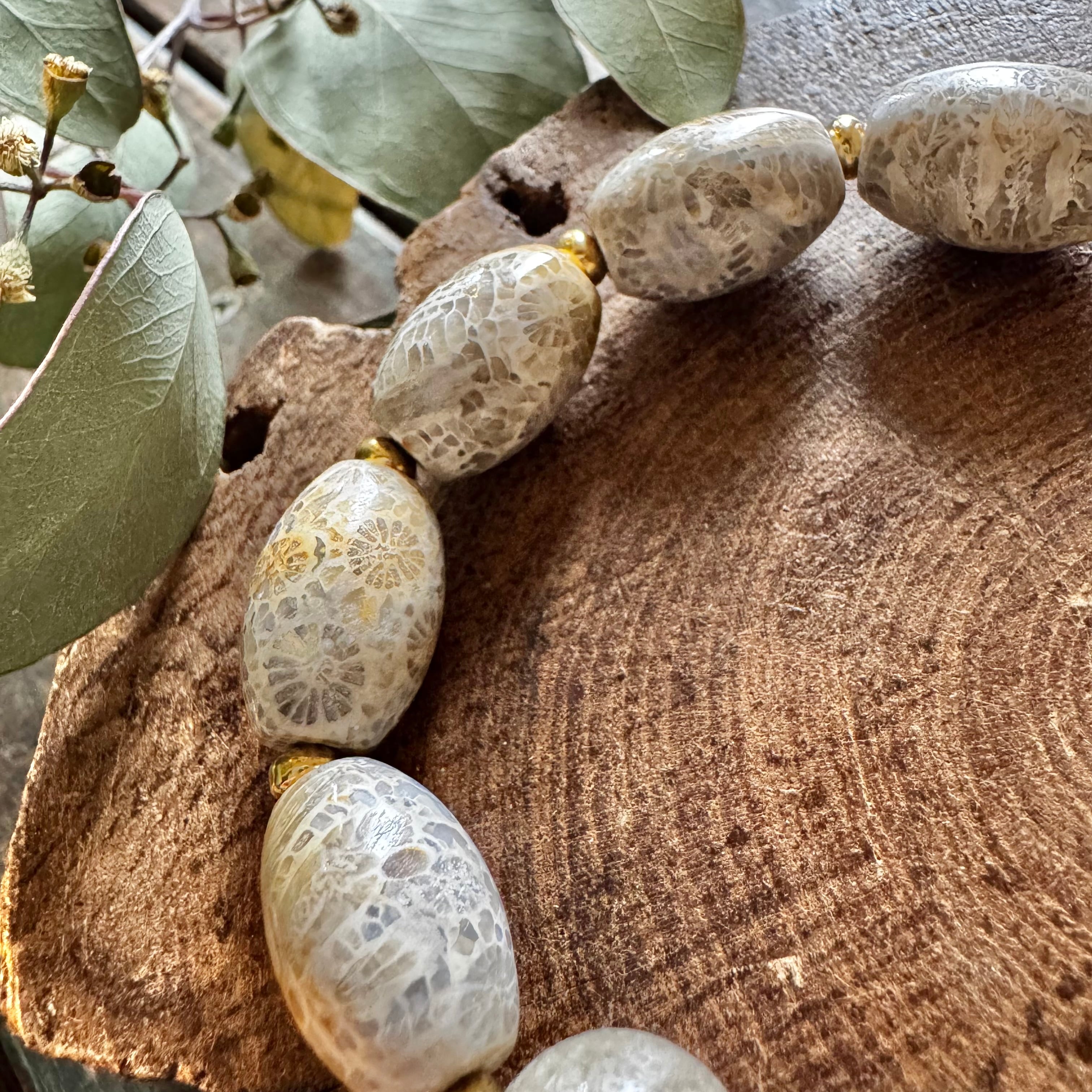 フォッシルコーラル樽型&リビアングラスブレスレット(グレージュ)