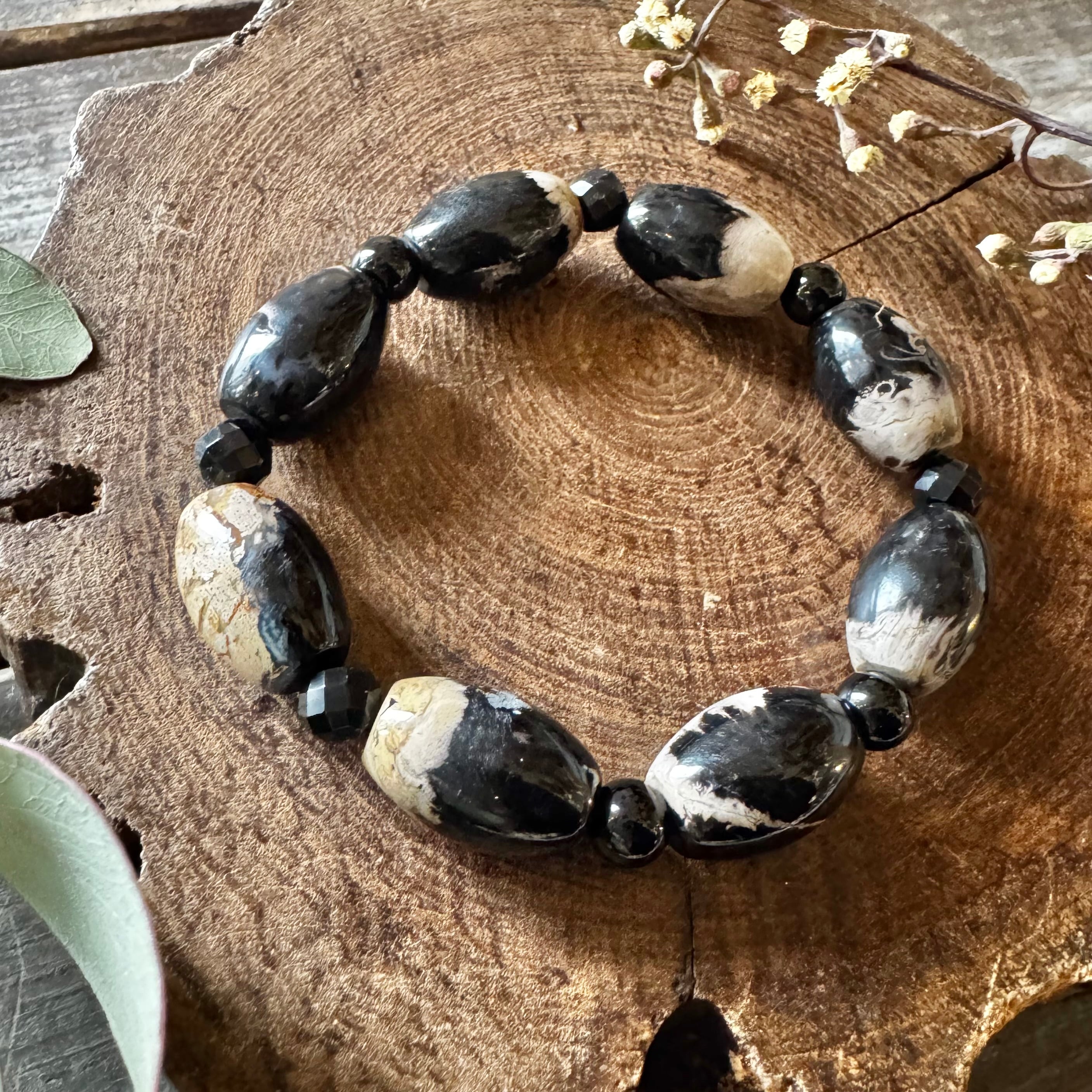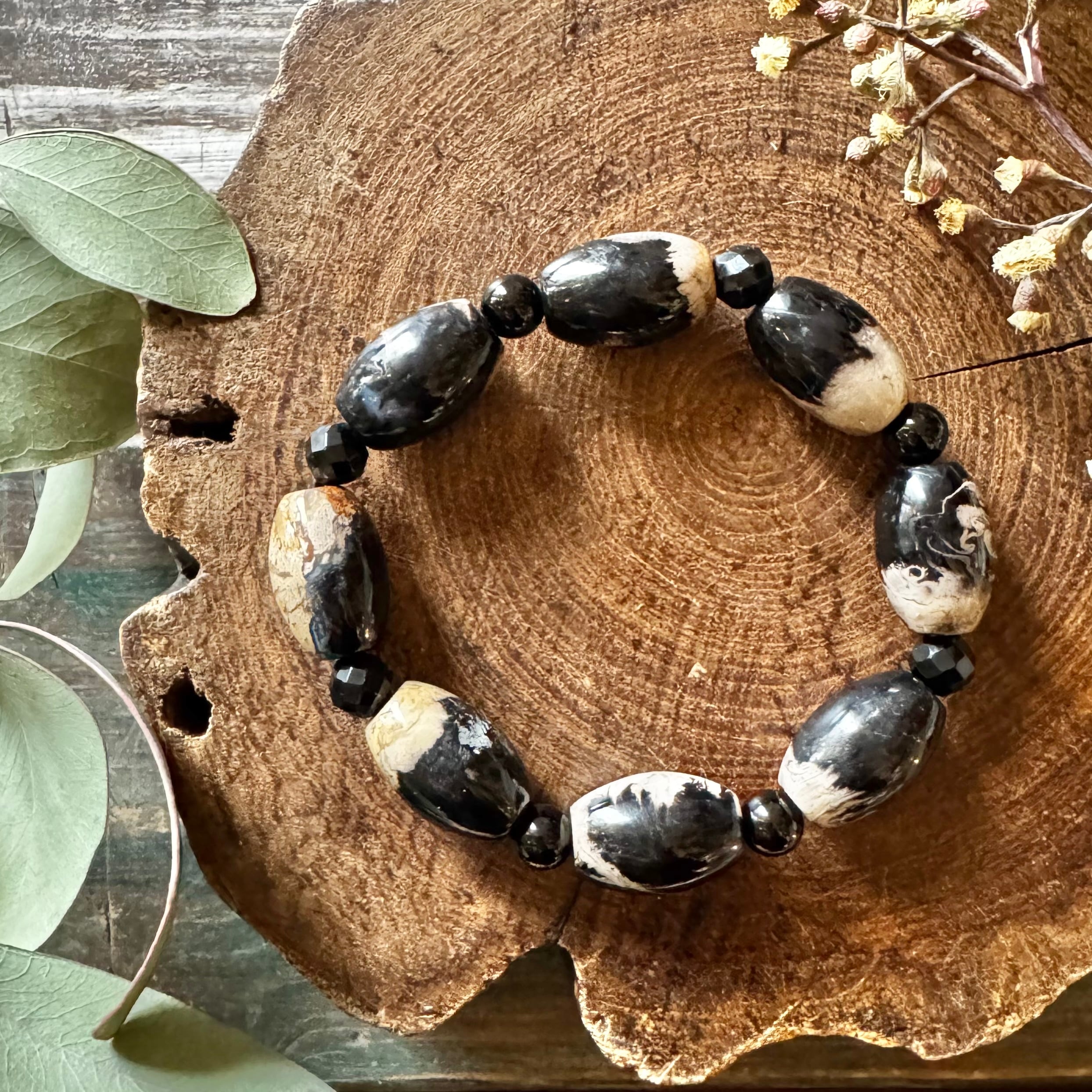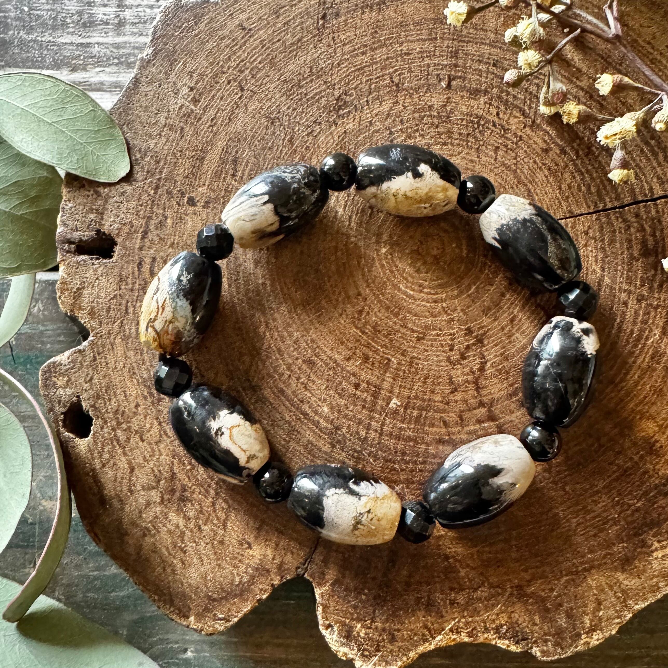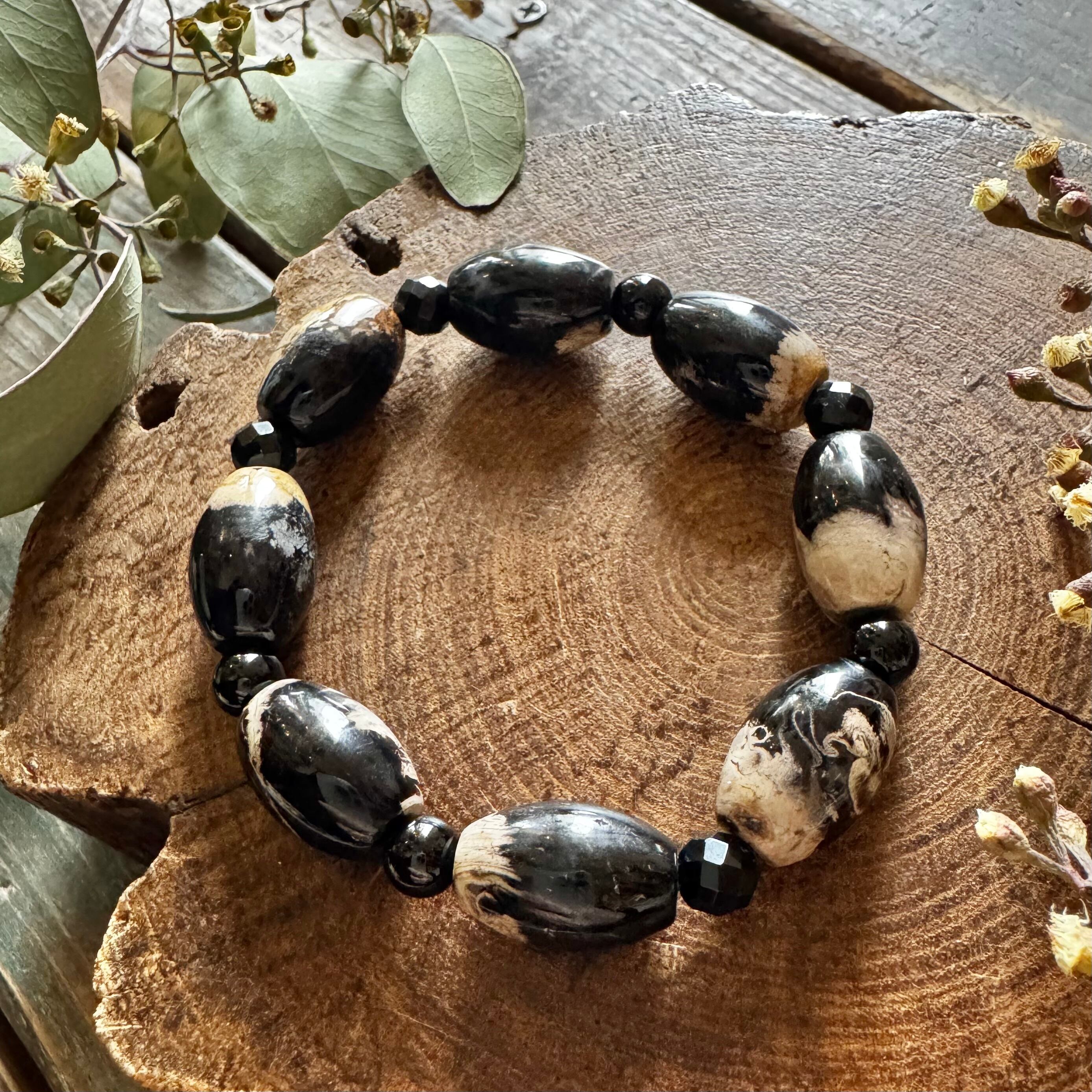 パームルートフォッシル樽型&ブラックトルマリンブレスレット(内周小さめ)