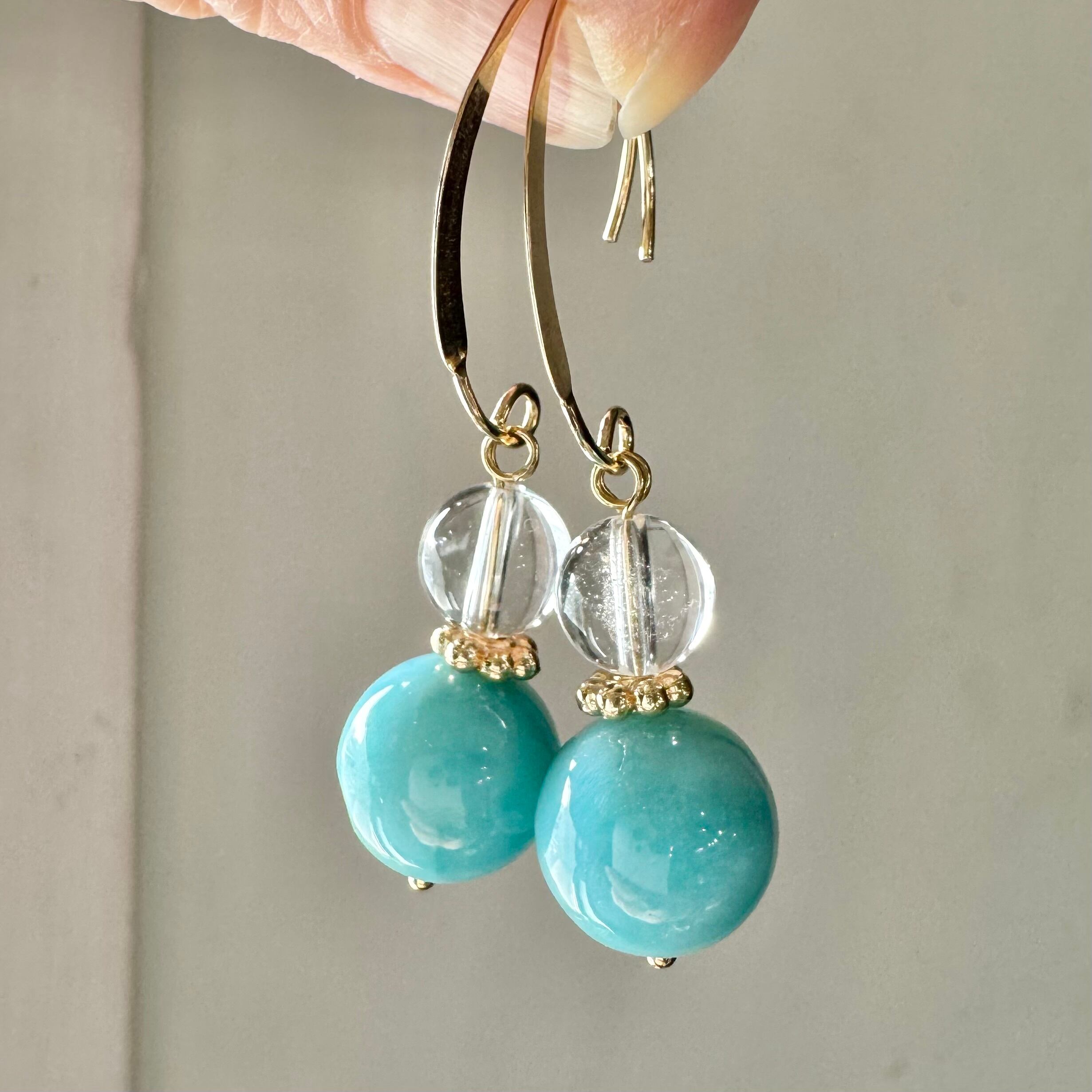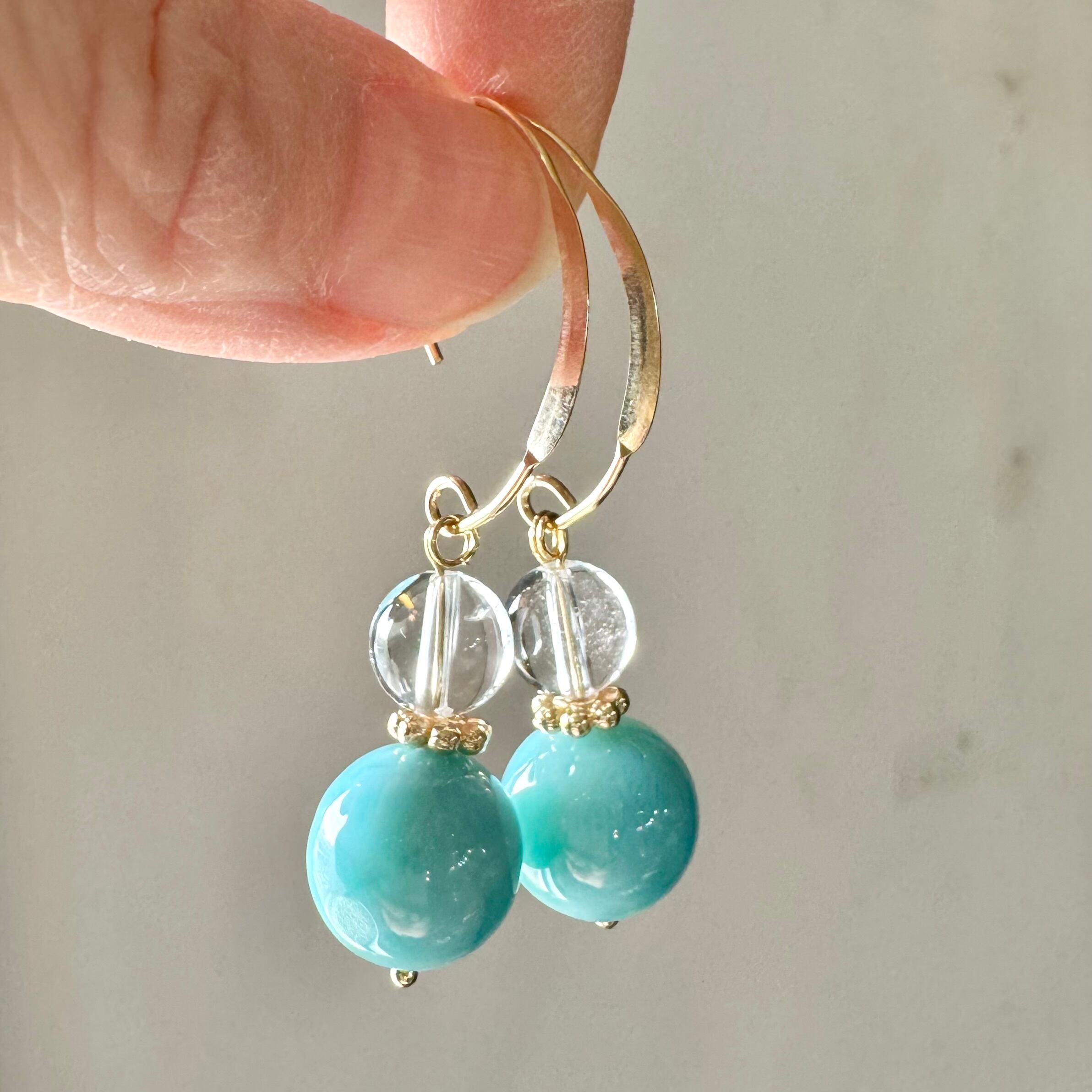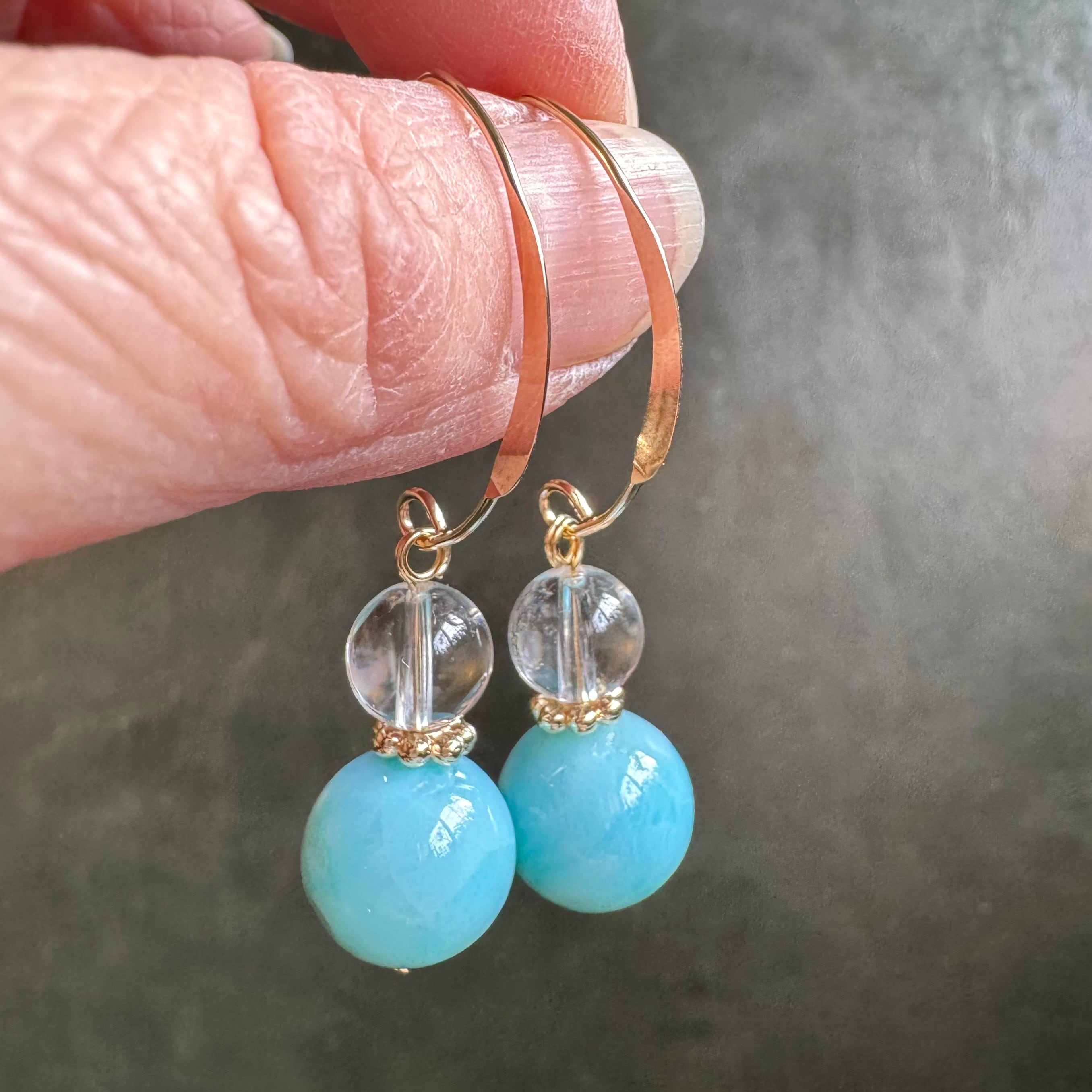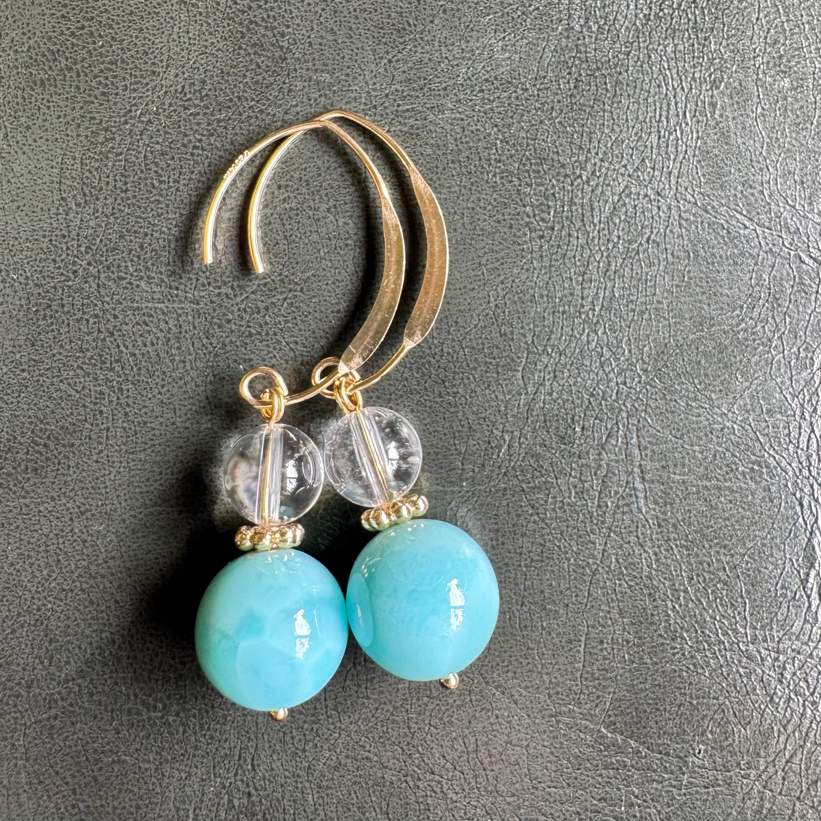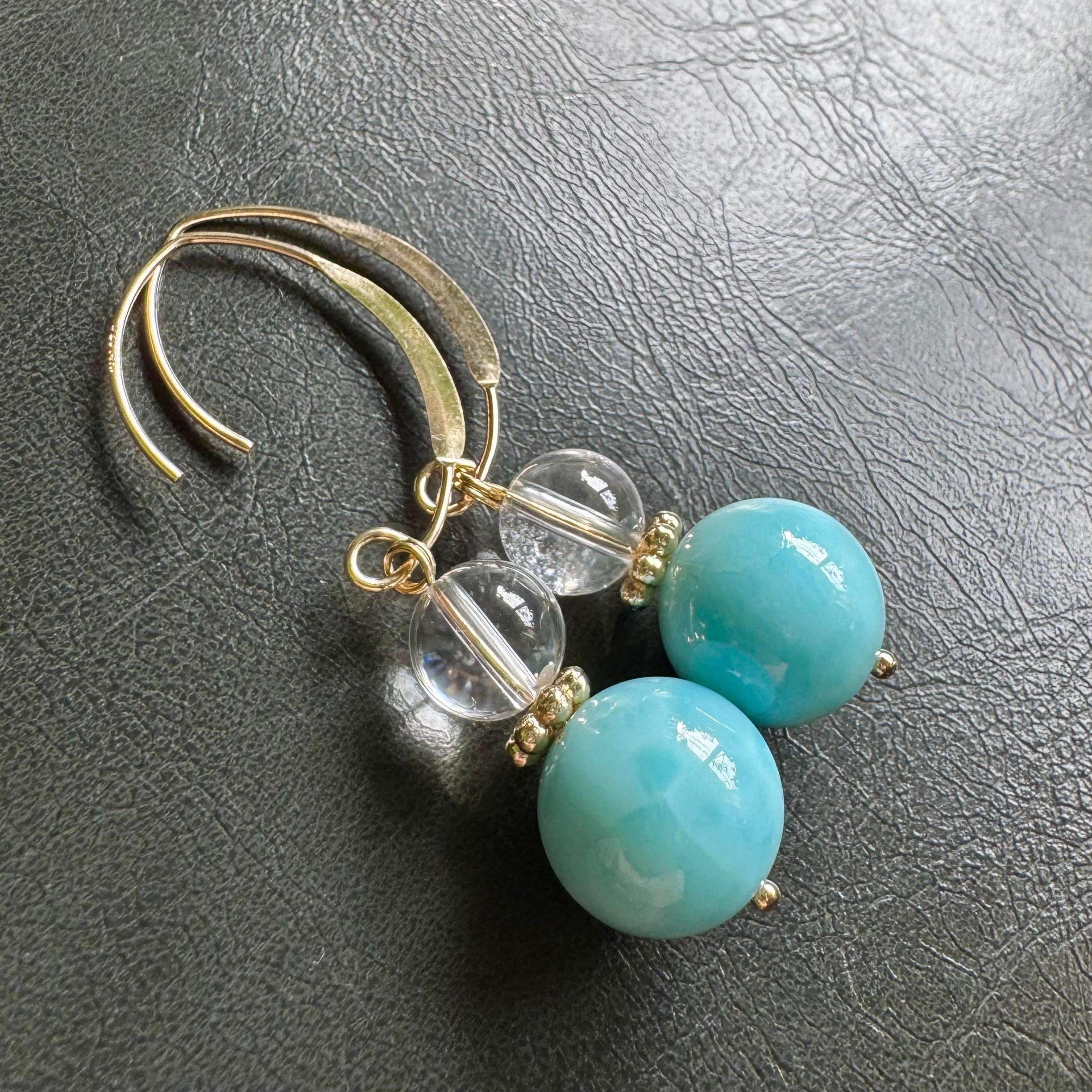 こちらのピアス(イヤリング)は、青みの強い大粒のラリマーと、水晶を組み合わせています
