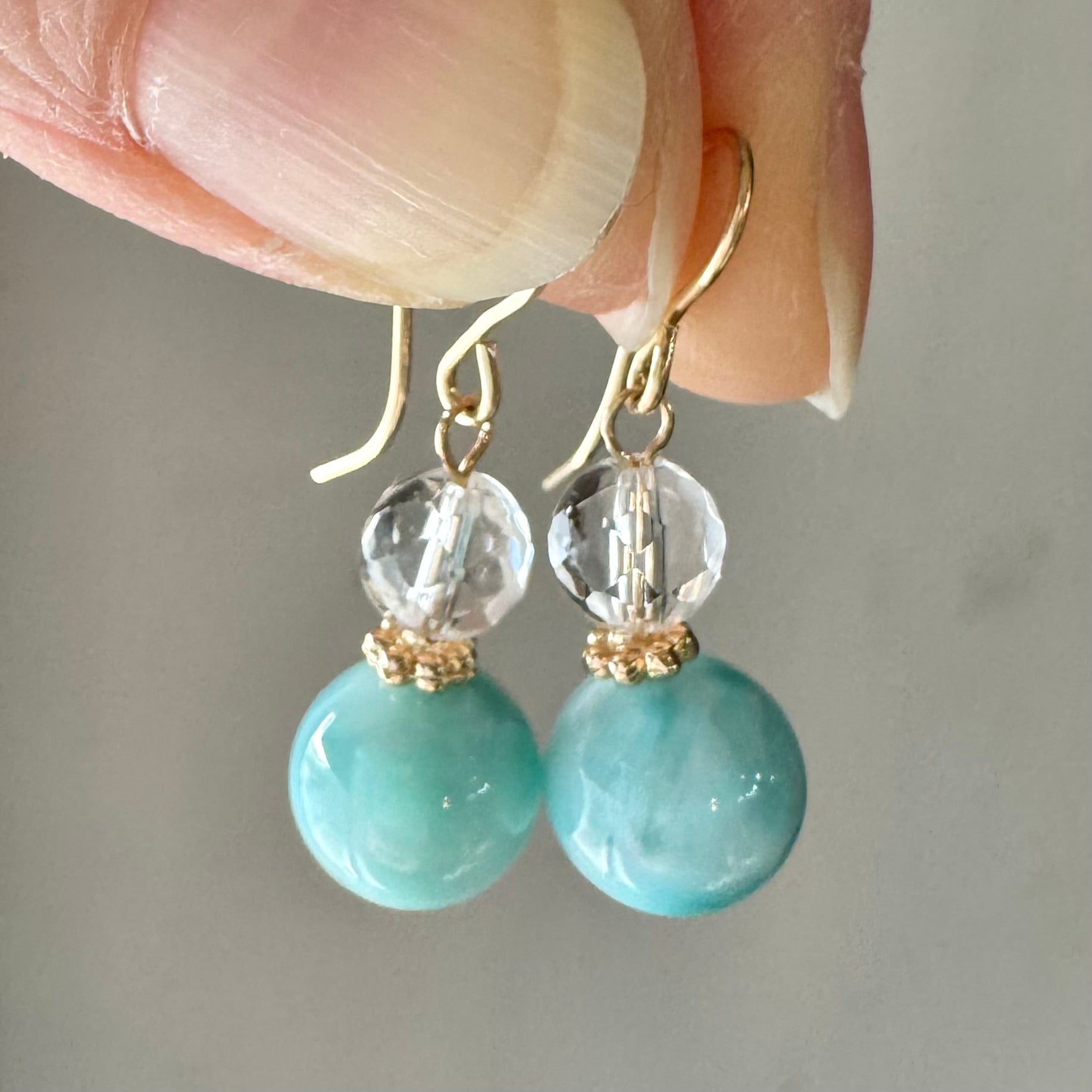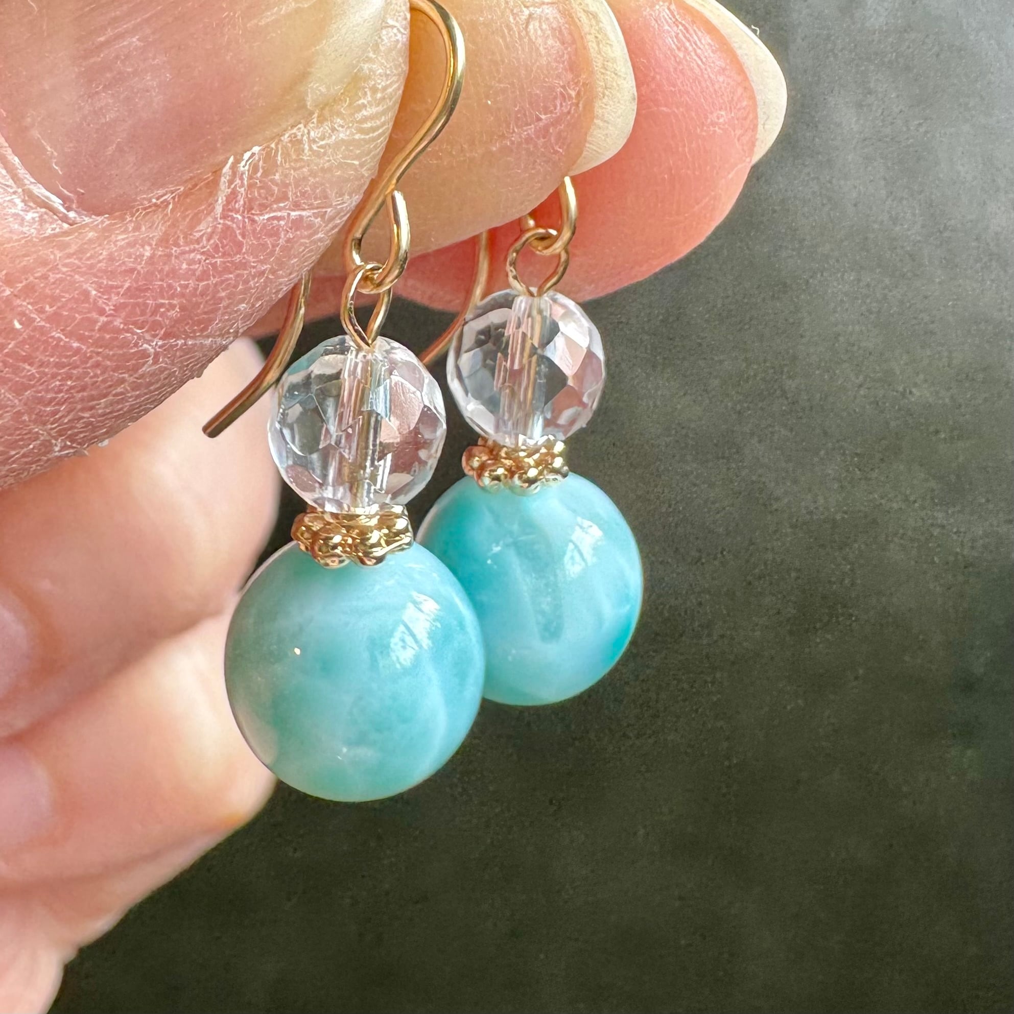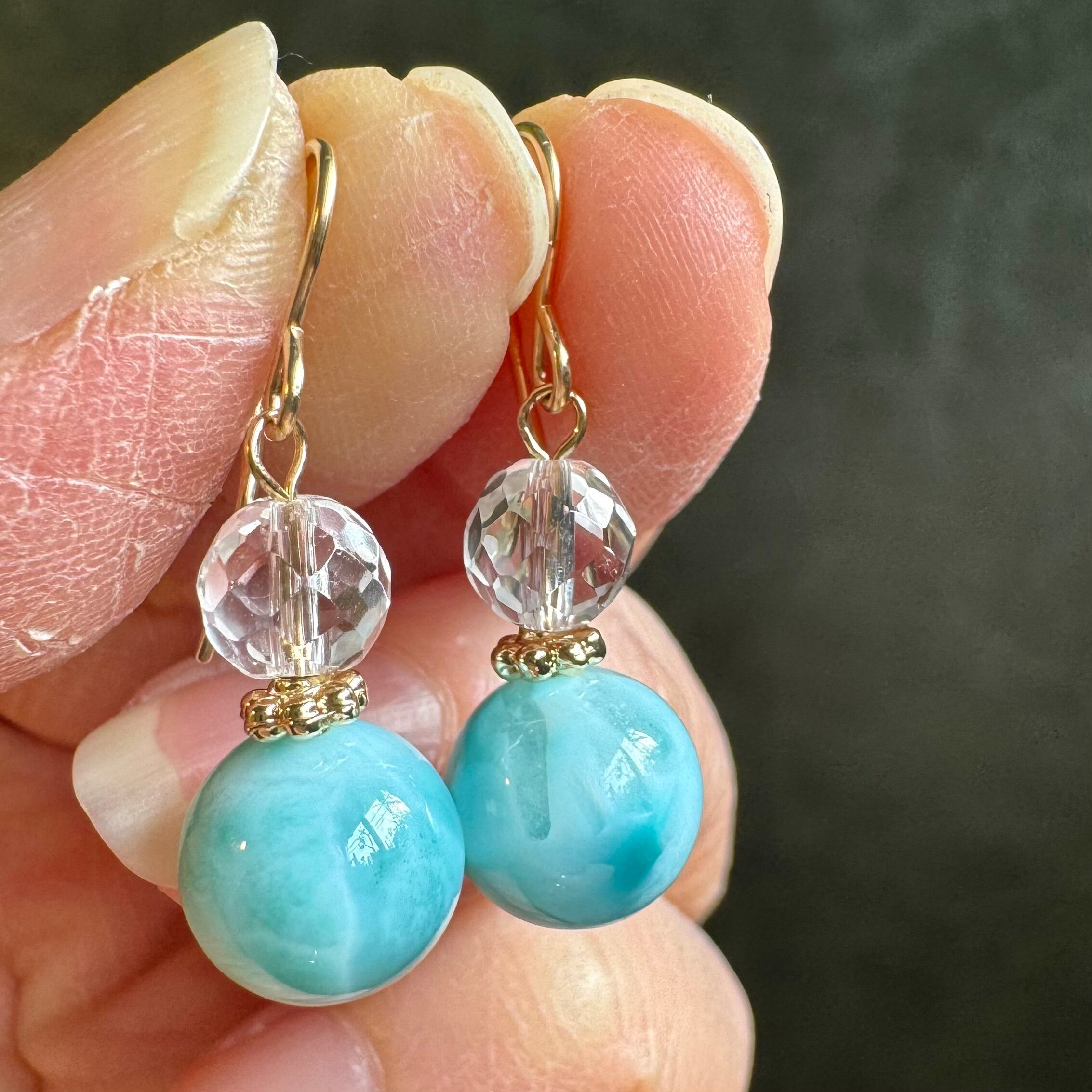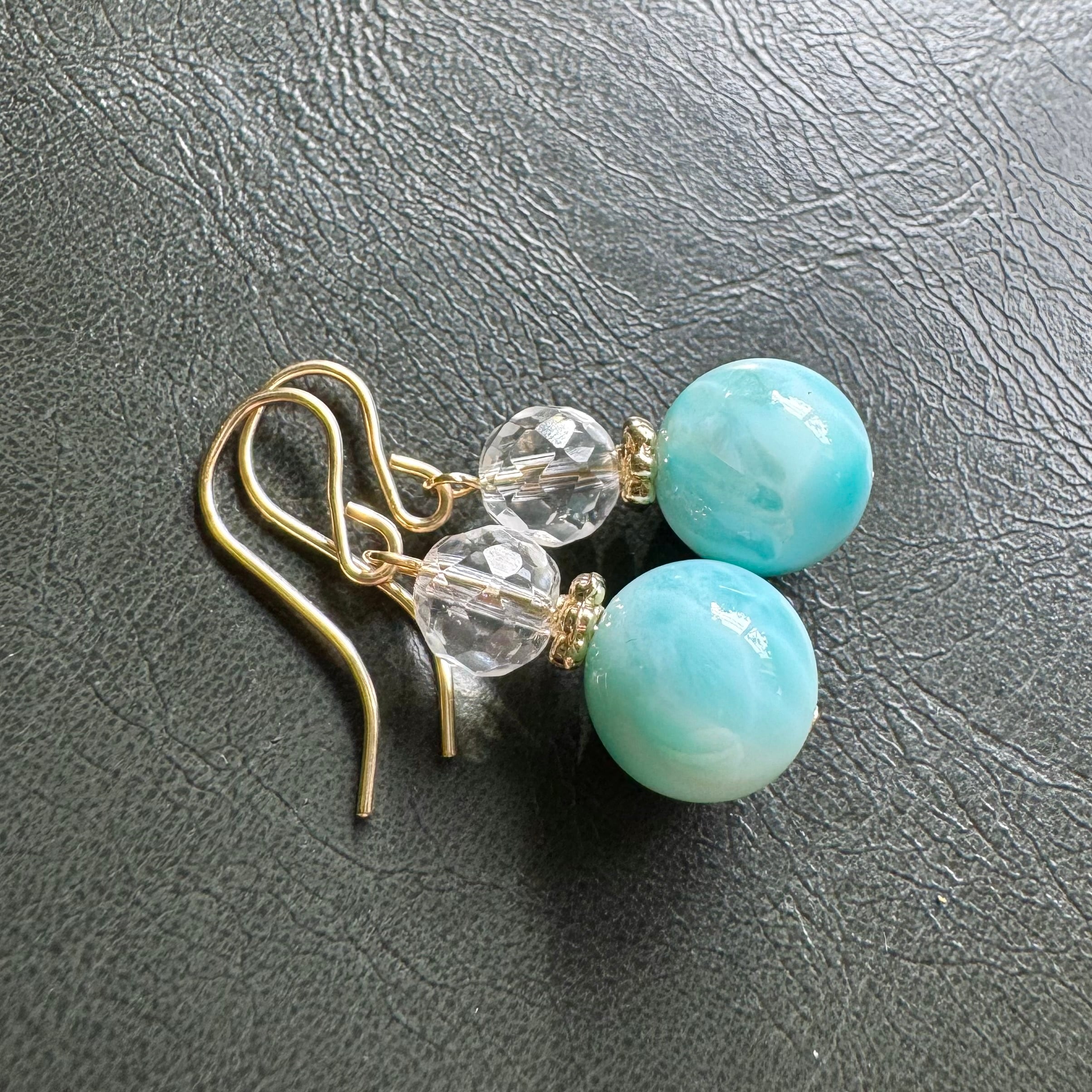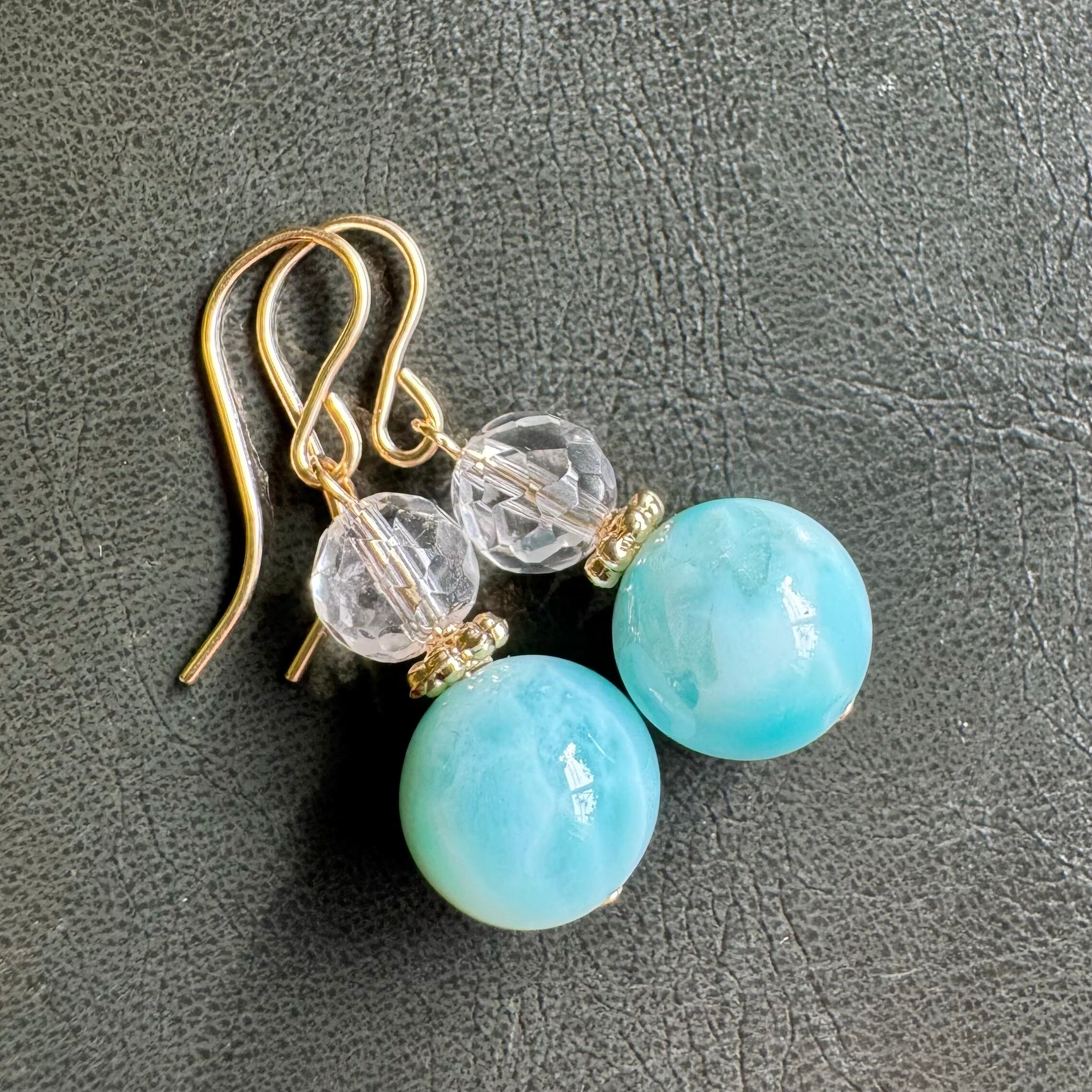 こちらのピアス(イヤリング)は、青みの強いラリマーと、カットの入った水晶を組み合わせています