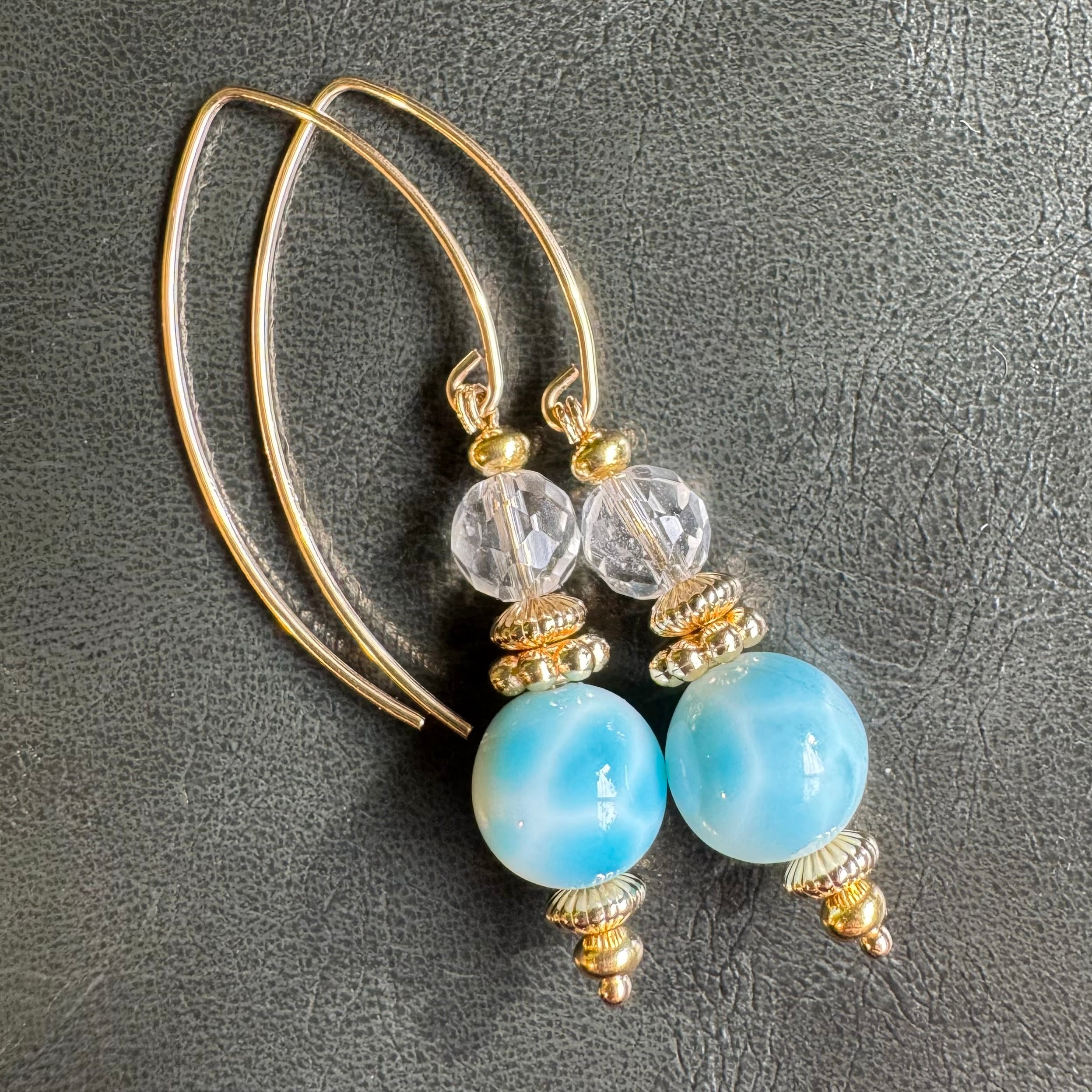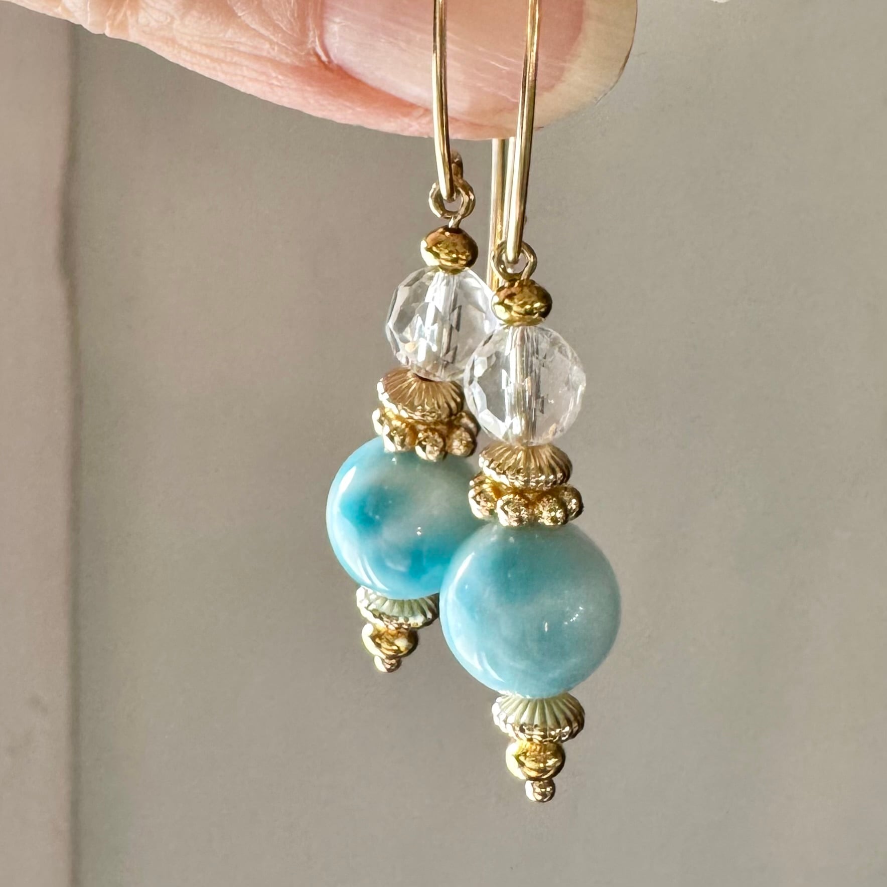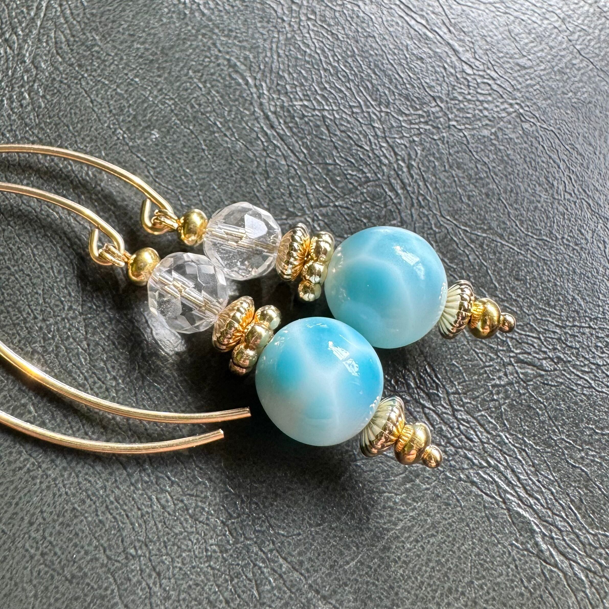 こちらのピアス(イヤリング)は、青みの強いラリマーと、14kgfのビーズを組み合わせています