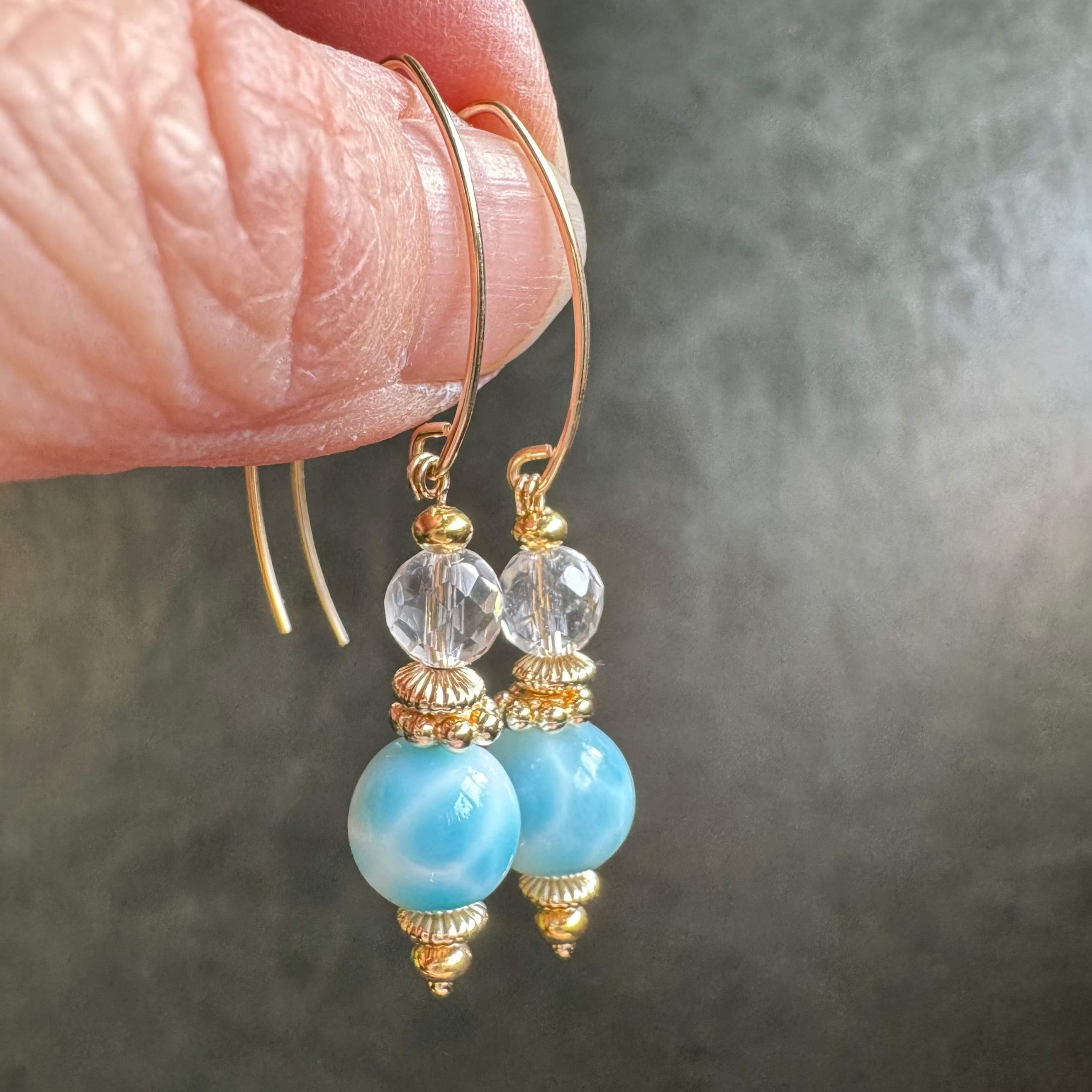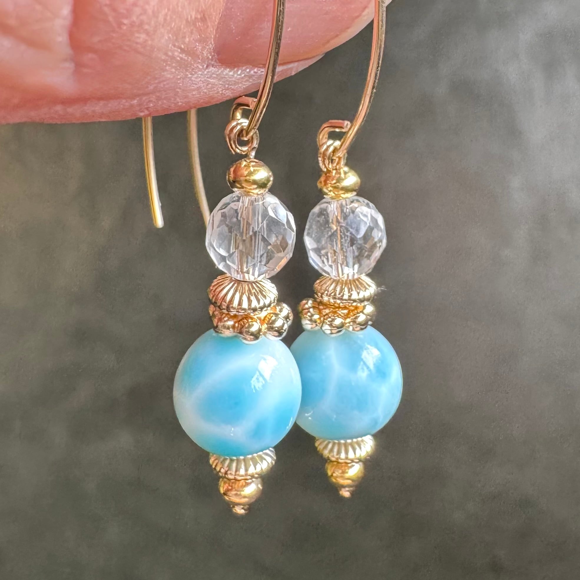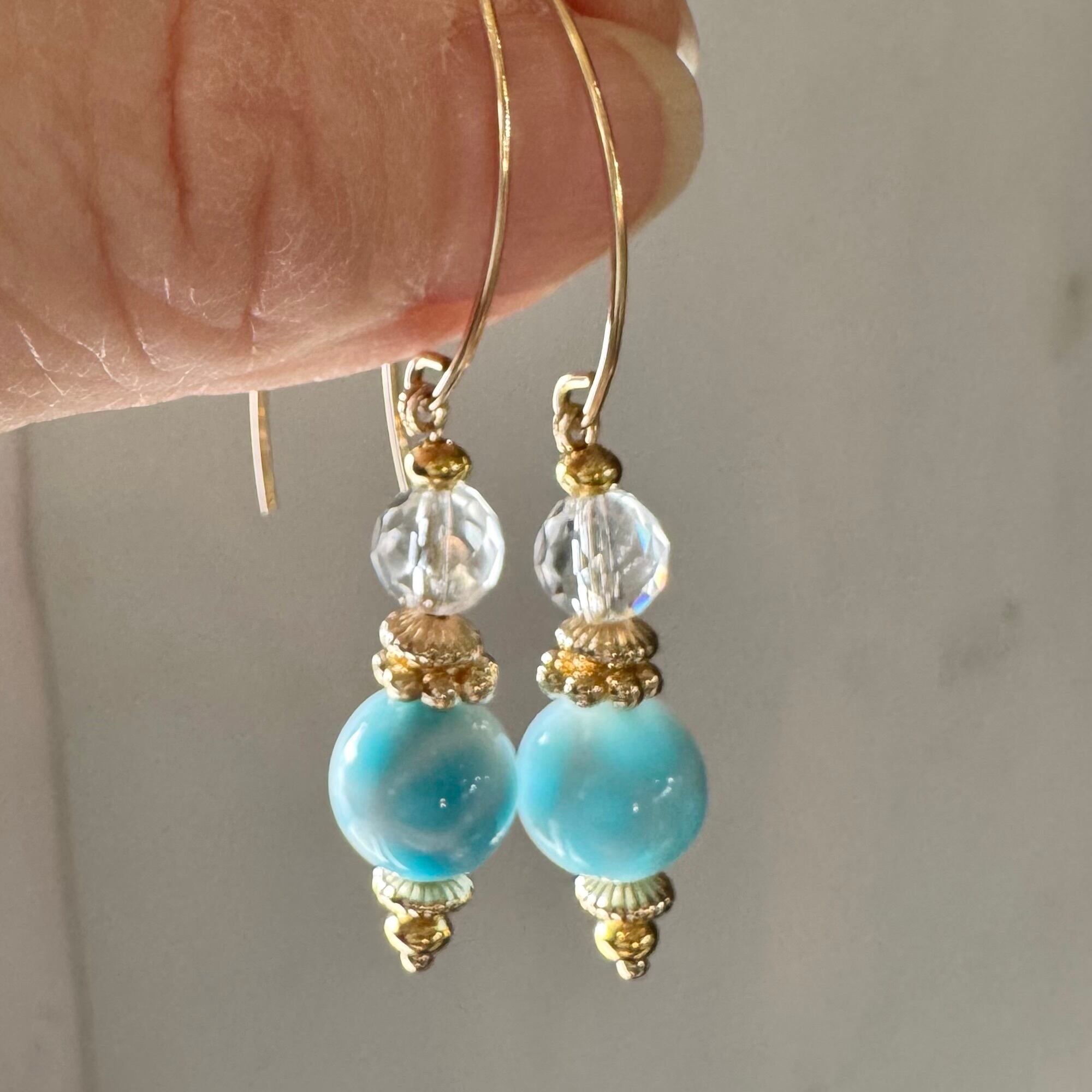 こちらのピアス(イヤリング)は、青みの強いラリマーと、14kgfのビーズを組み合わせています