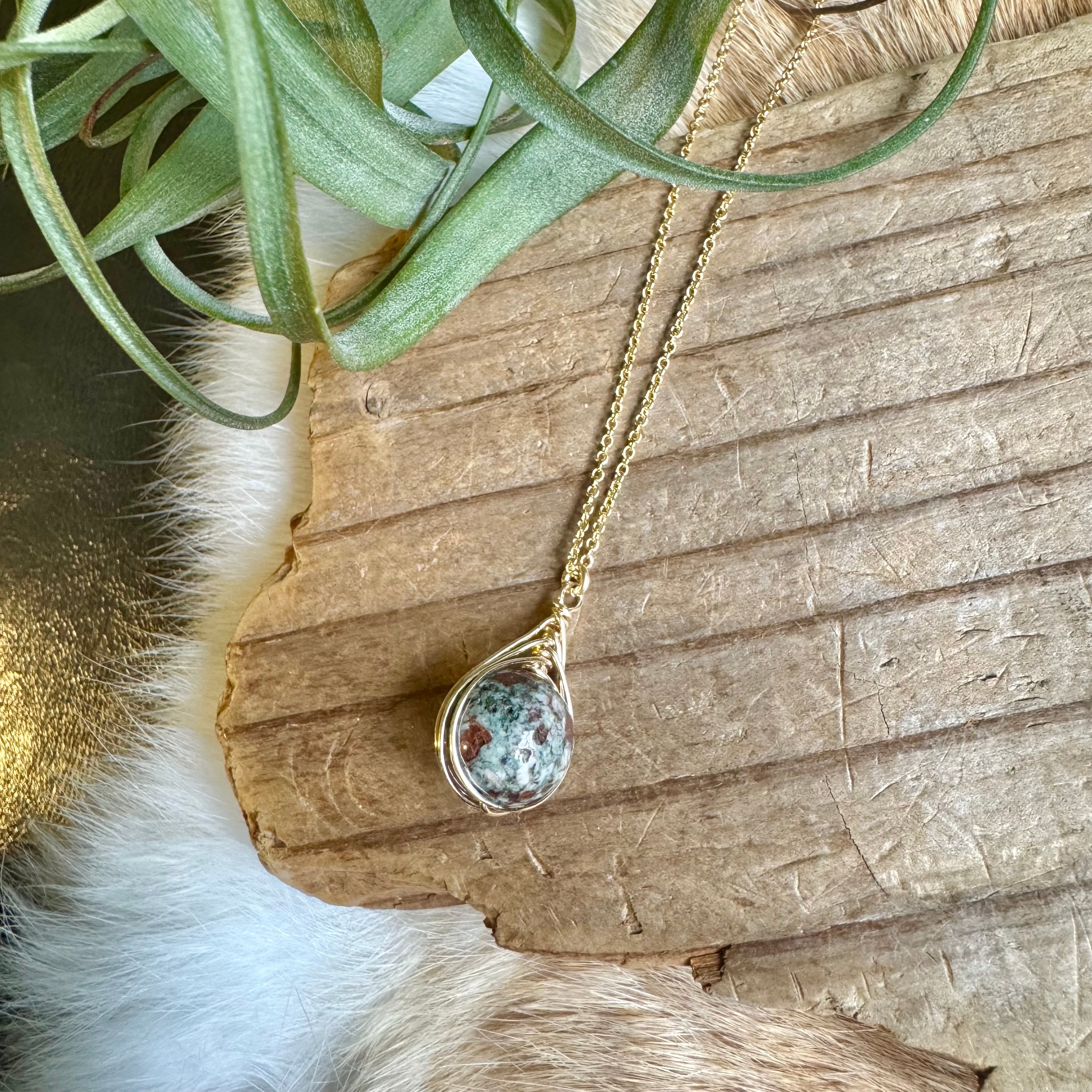 渋めのグリーンが多めで、渋い赤や白が入った織姫ガーネットのネックレスです