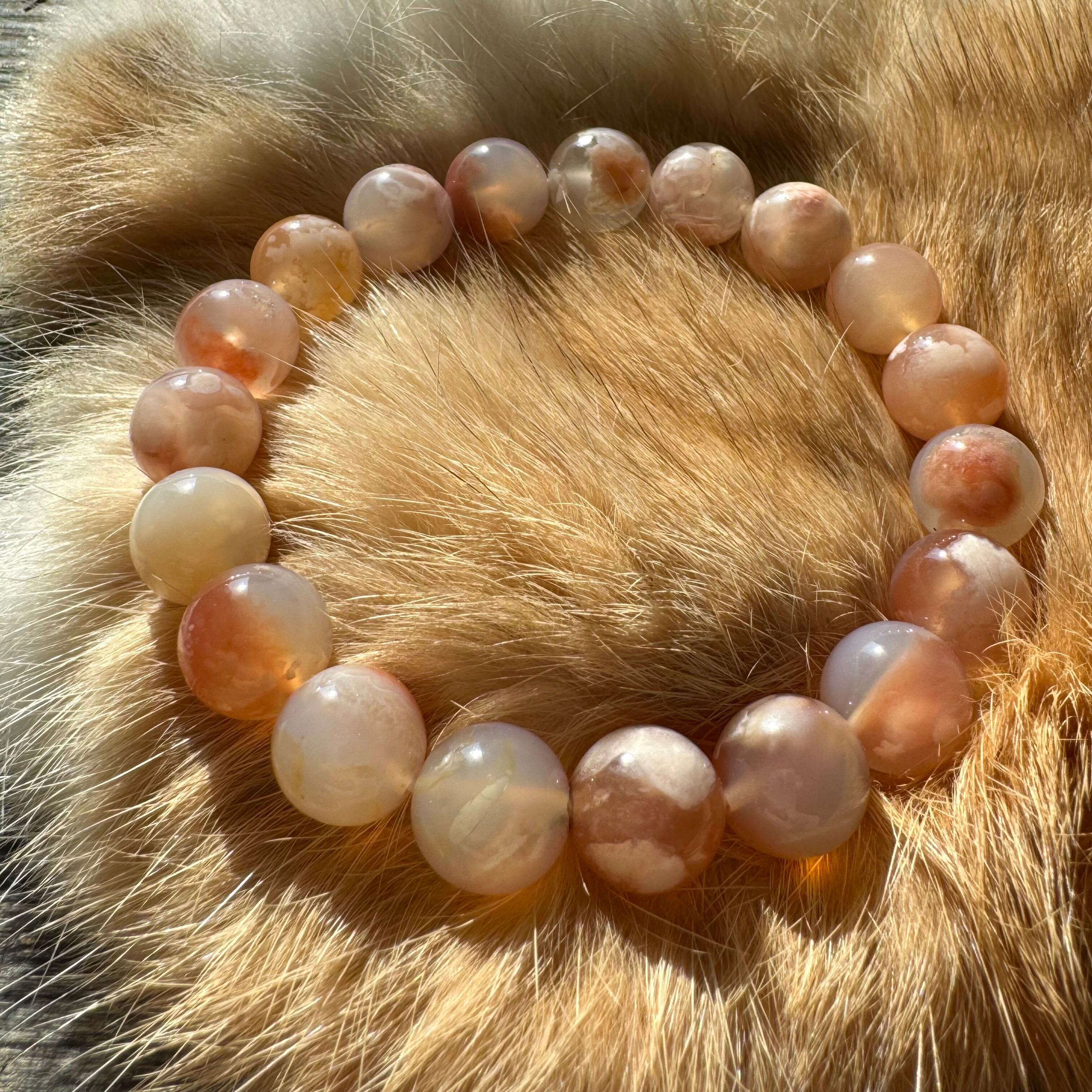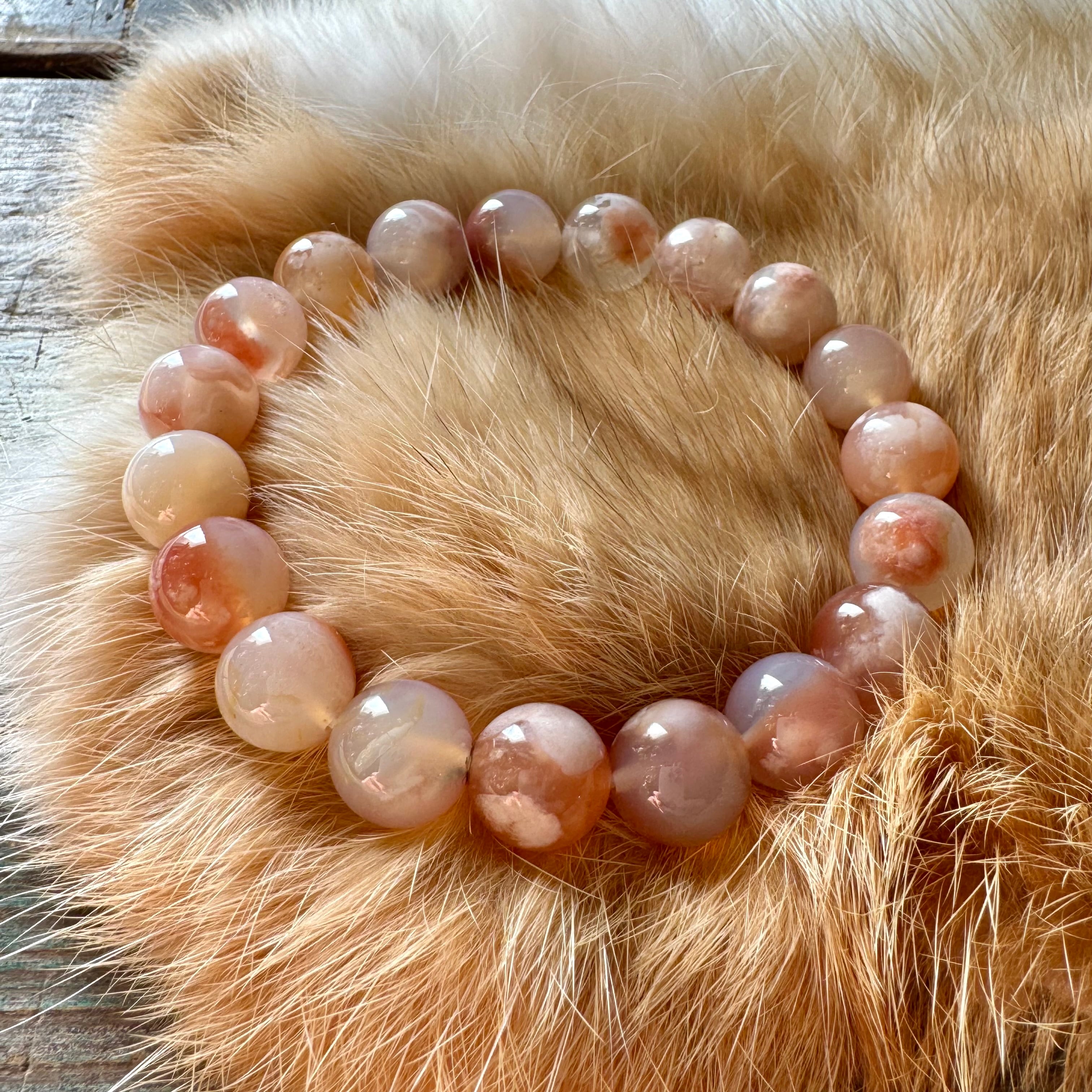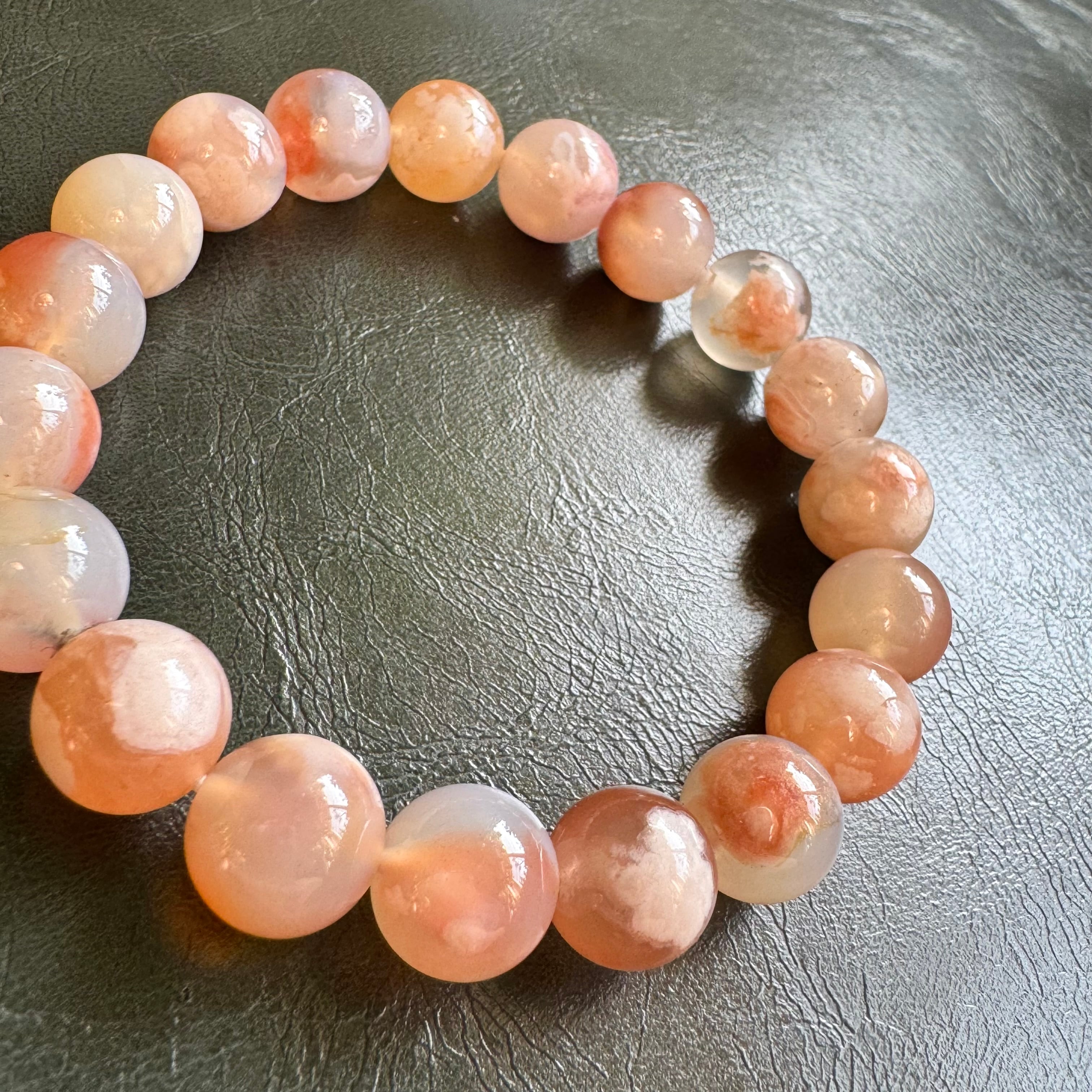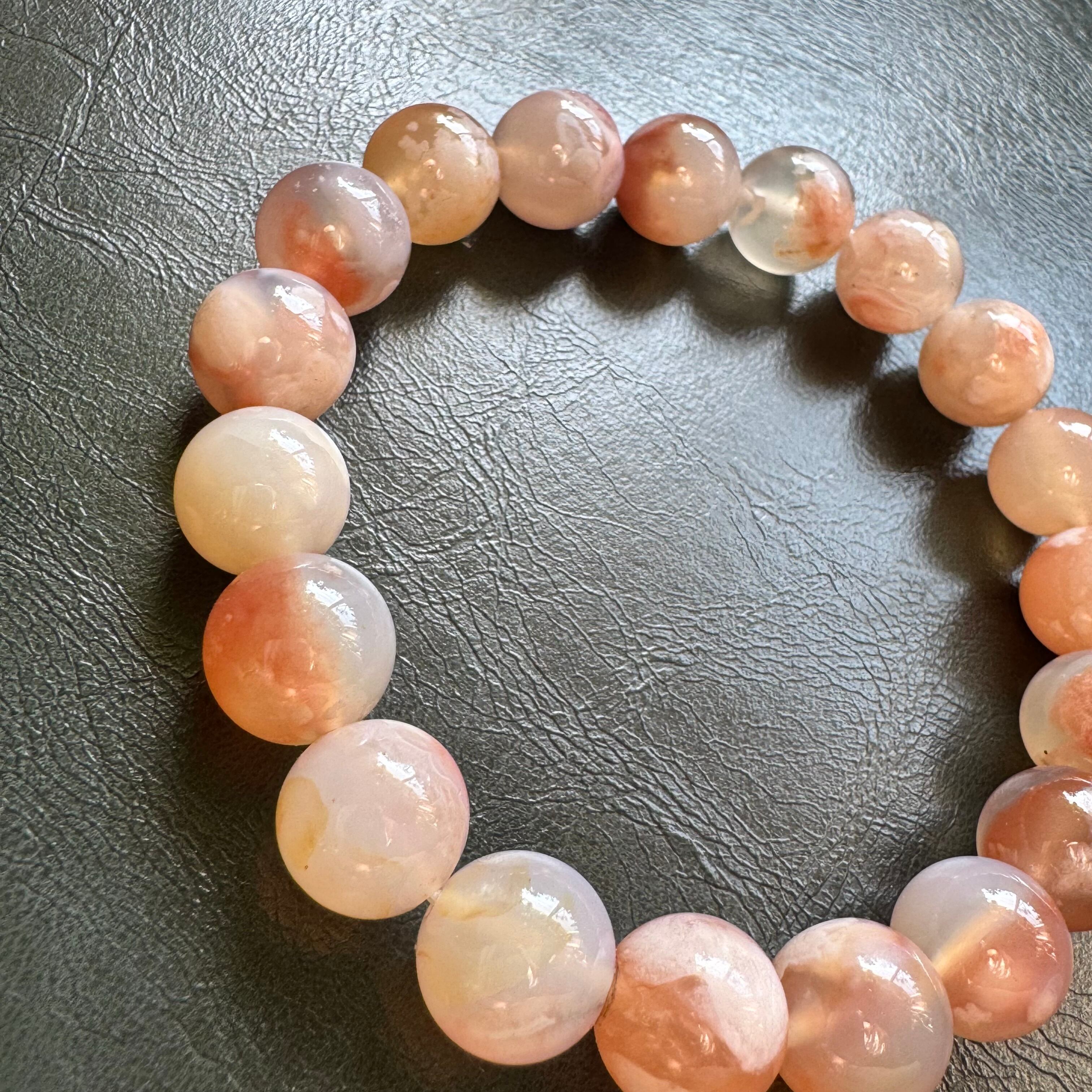 桜メノウ(チェリーブロッサムアゲート)は、ピンクやオレンジベージュの地色に、桜の花びらのような白い結晶模様(クリストバライト)が内包されたアゲート(瑪瑙)です