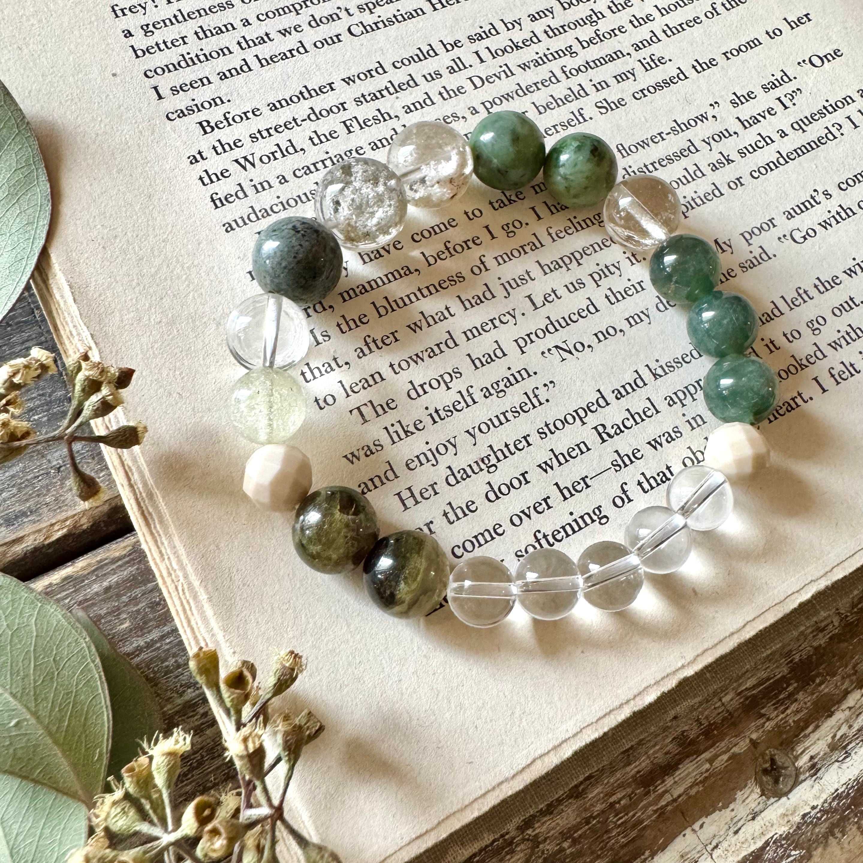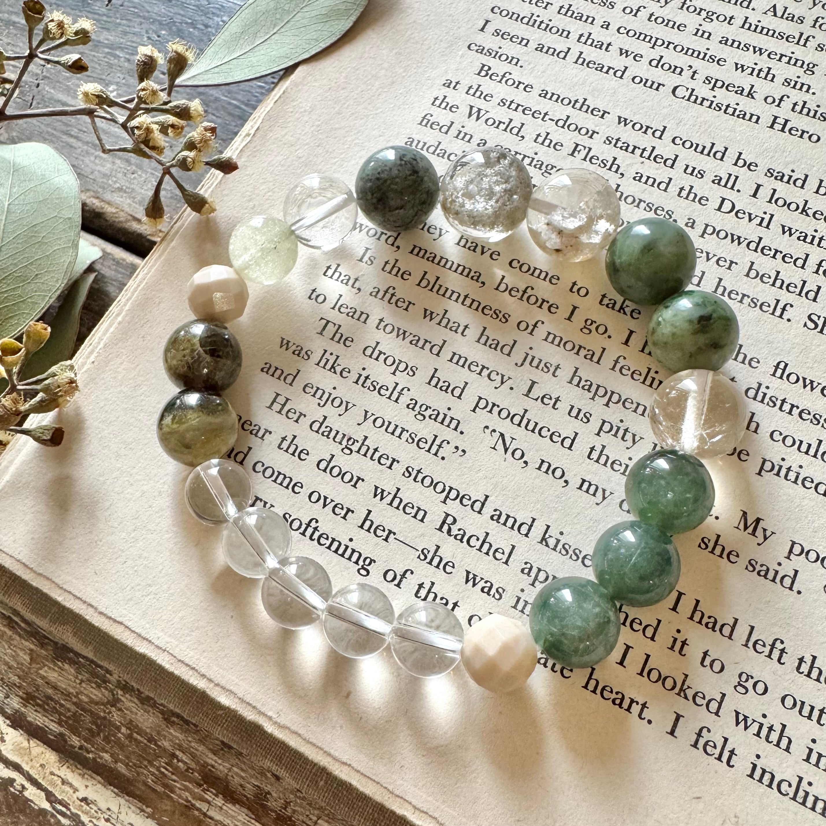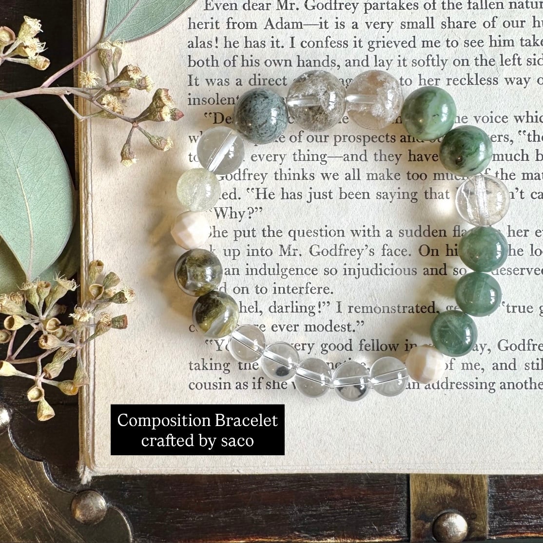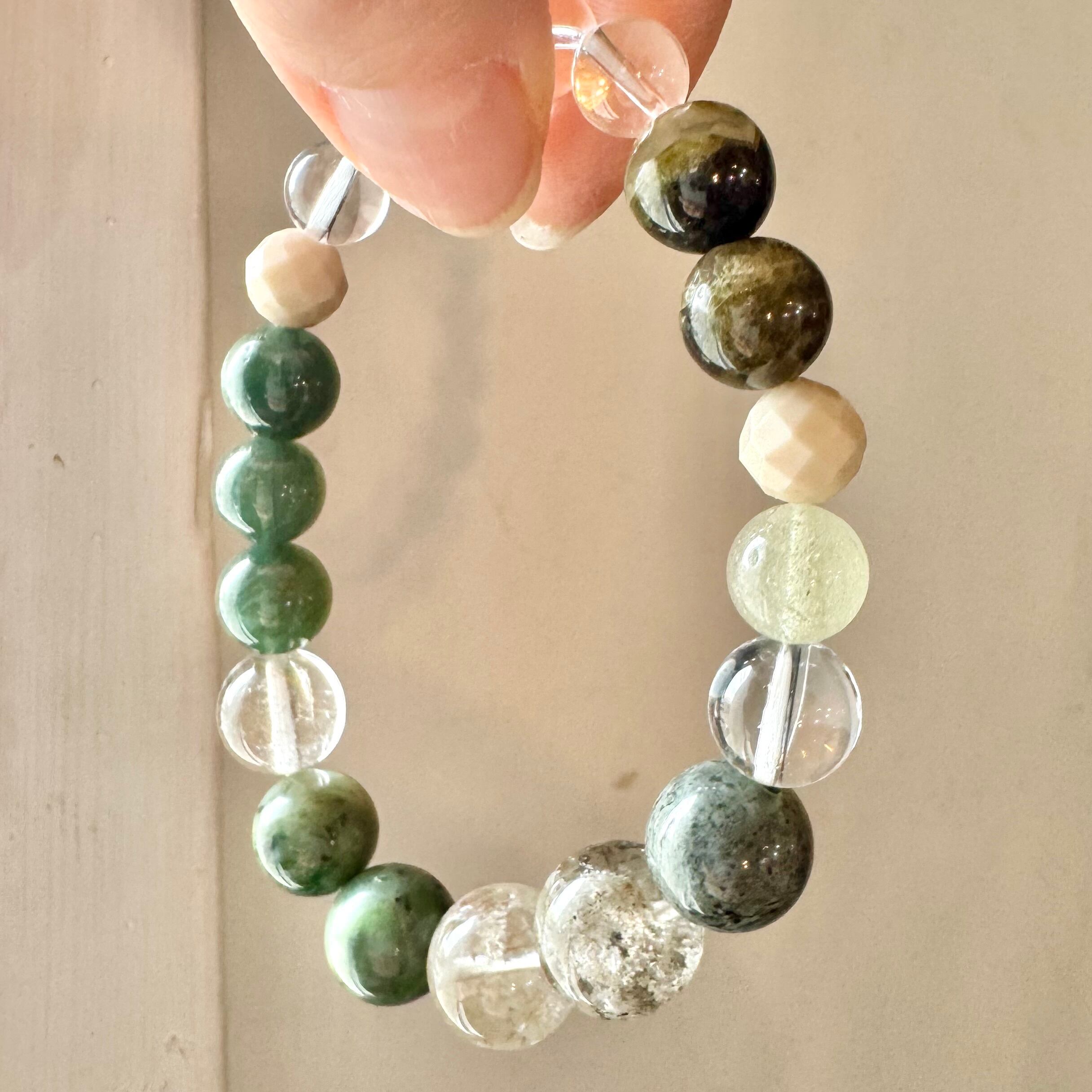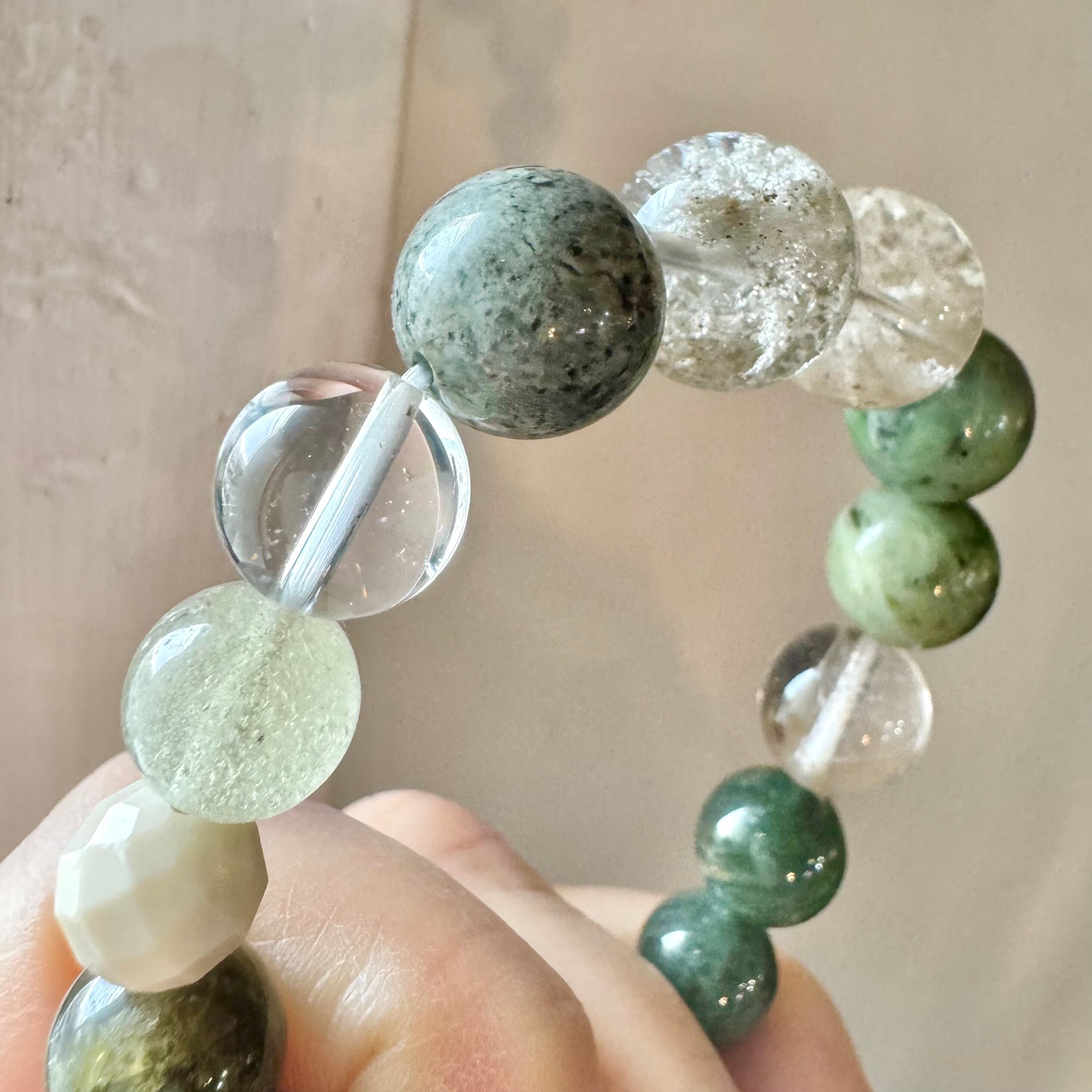 落ち着いたグリーンの石たちに、透明感のある石やオフホワイトを加えて、明るく落ち着いた雰囲気にいたしました