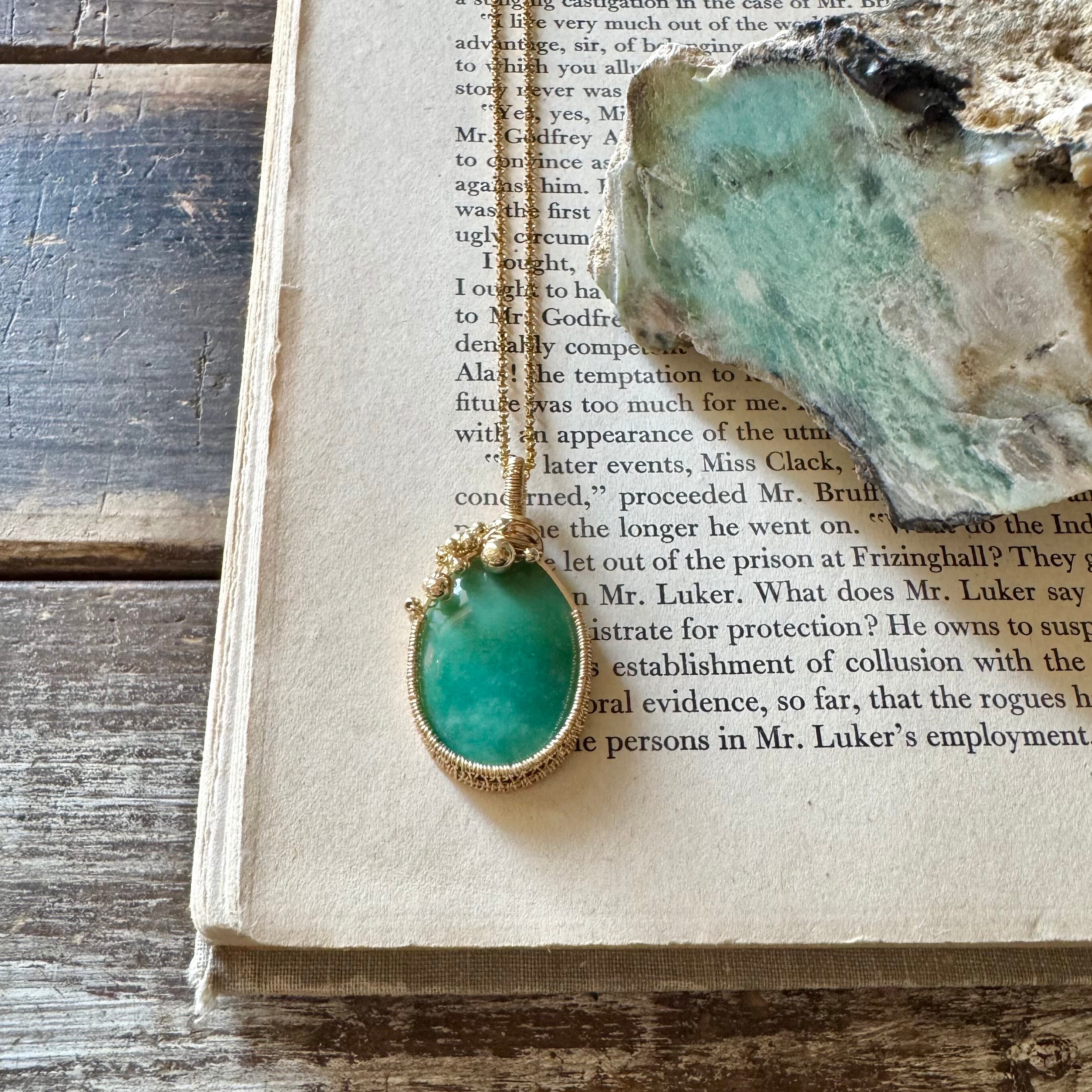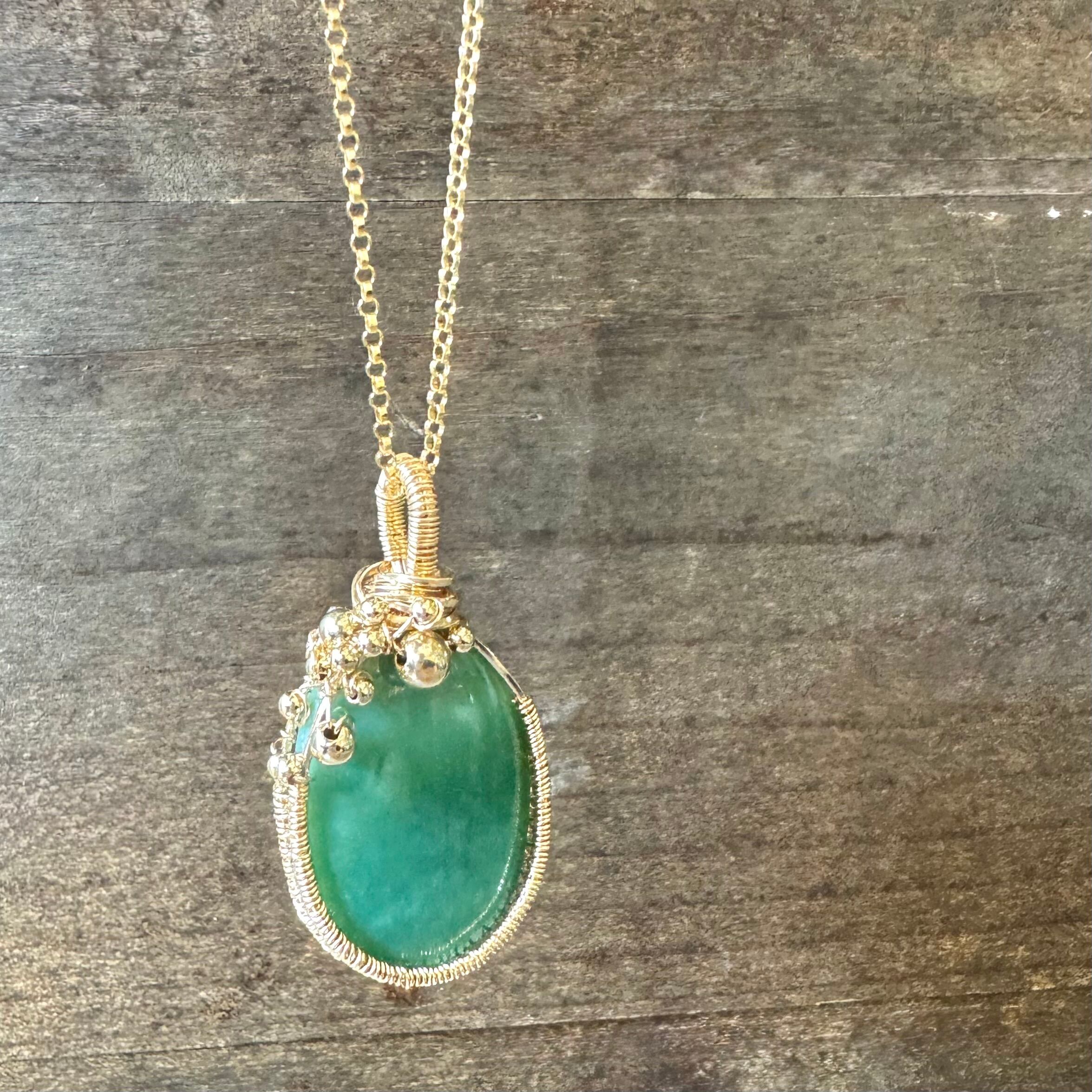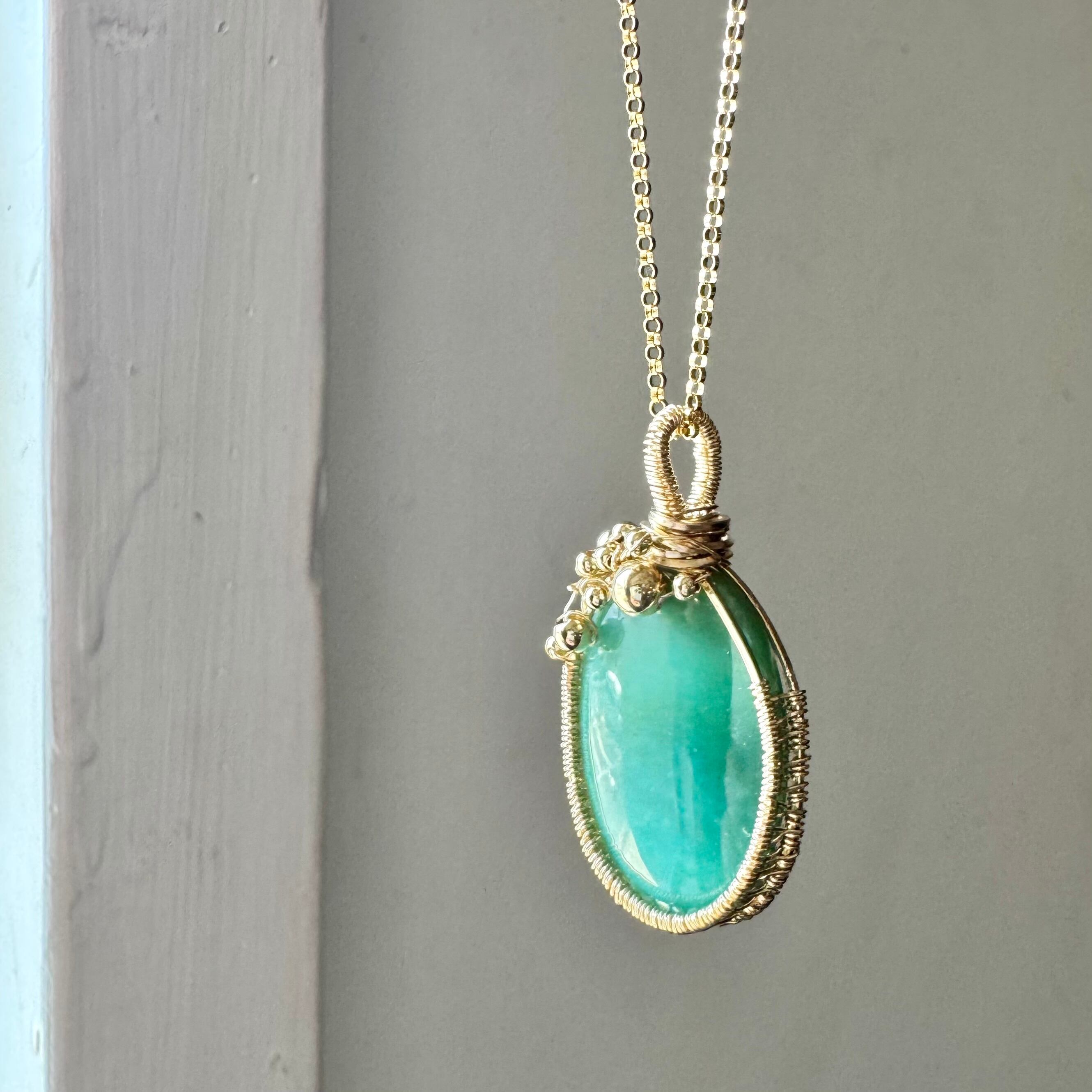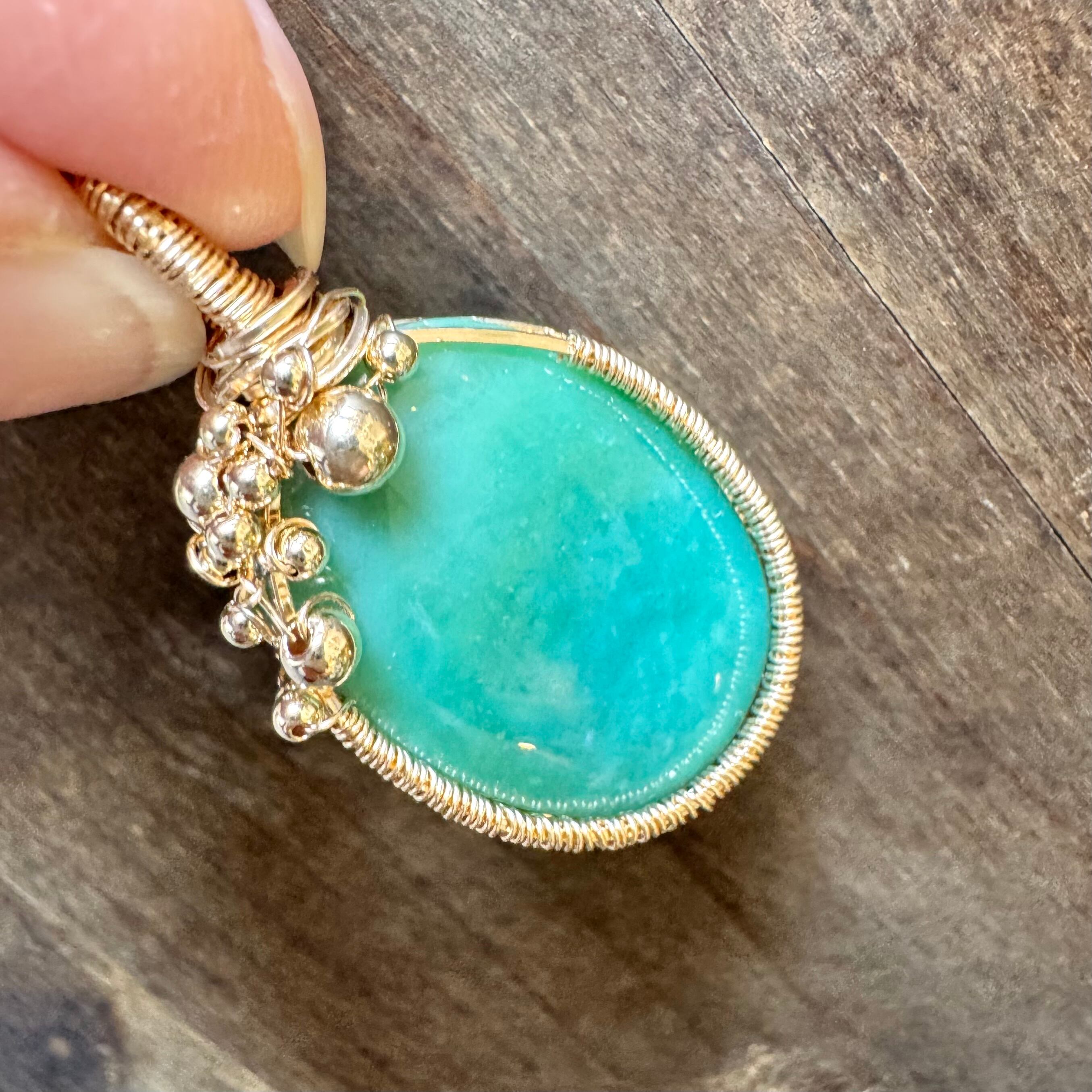 ほんのり模様の様になってはいるもののシンプルな石なので、ビーズを足した可愛らしいワイヤーラッピングにしました