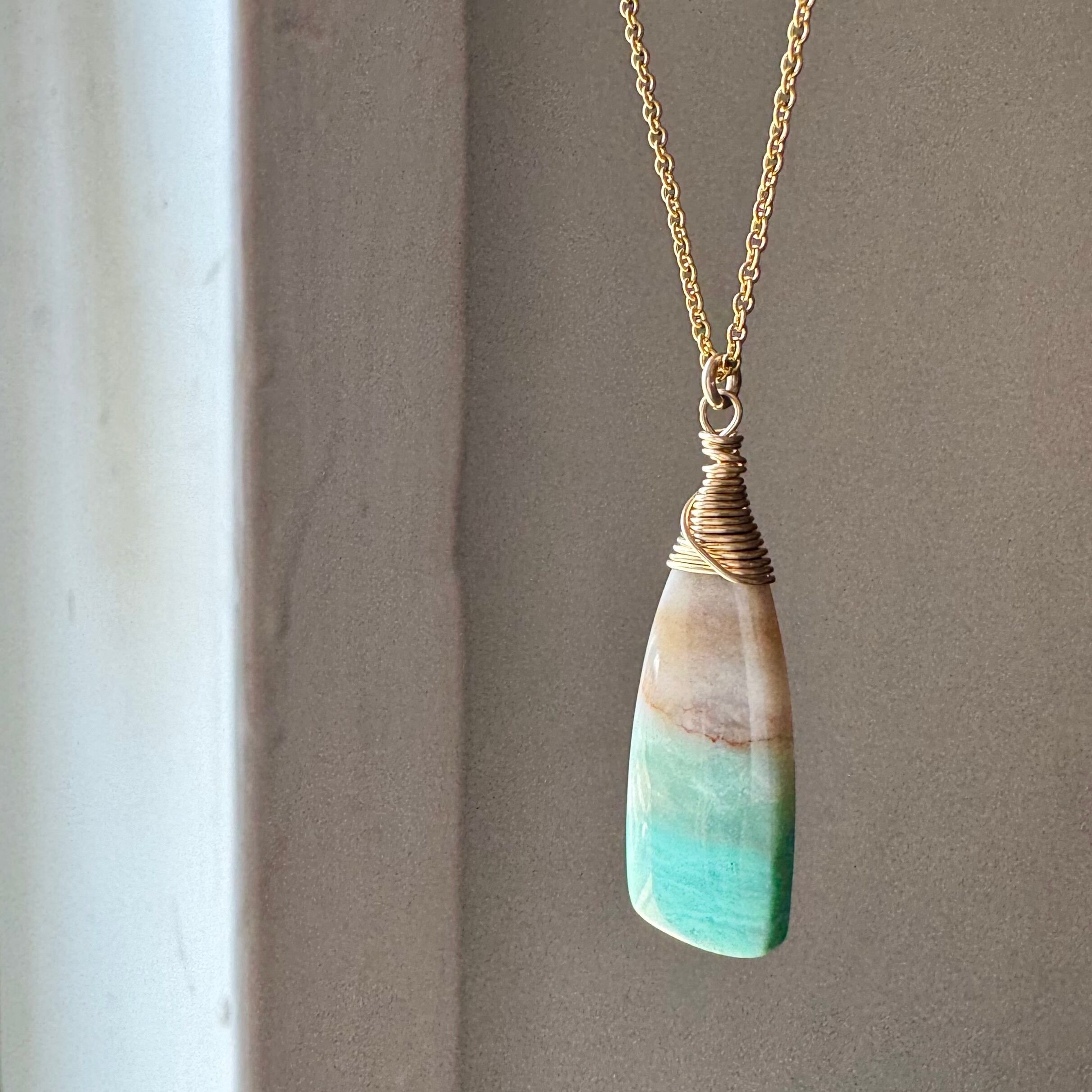 こちらは、ブルーグリーンとブラウンが層を作っている粒のネックレスです